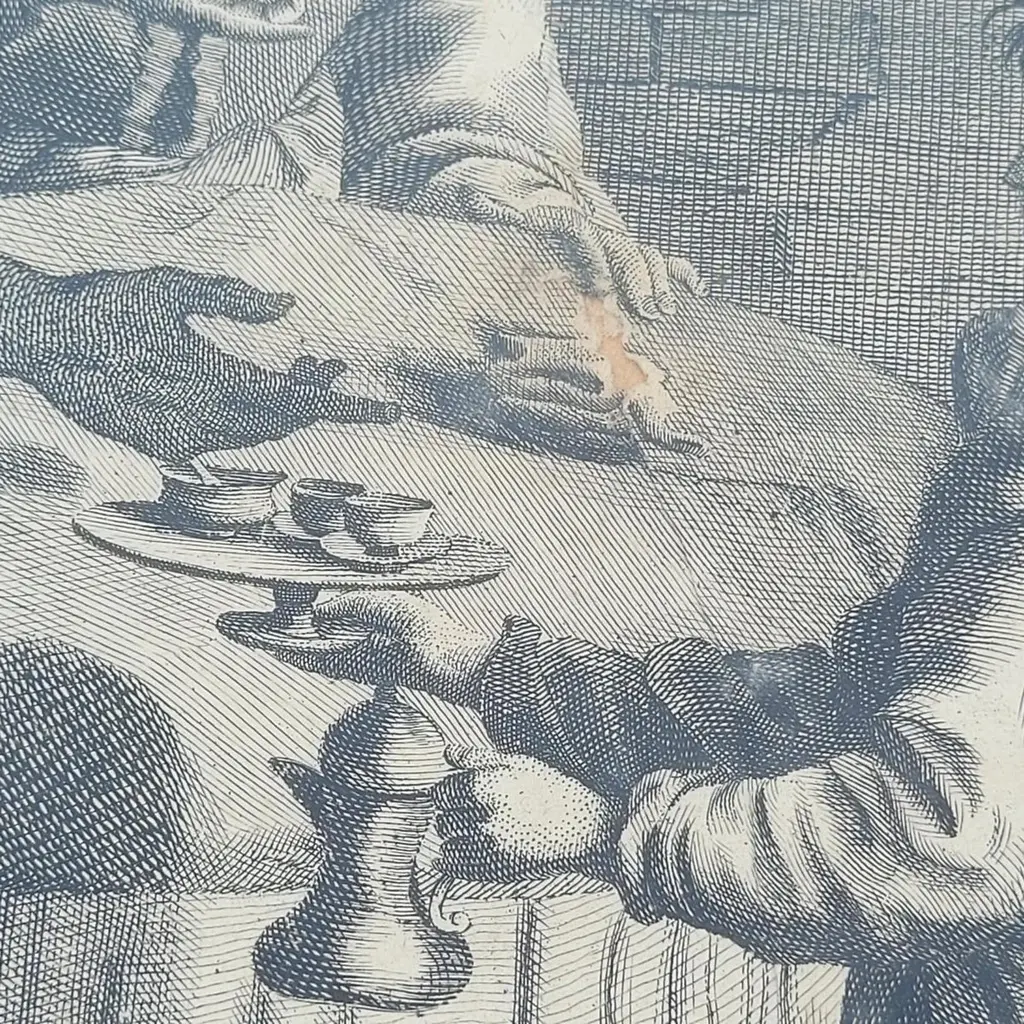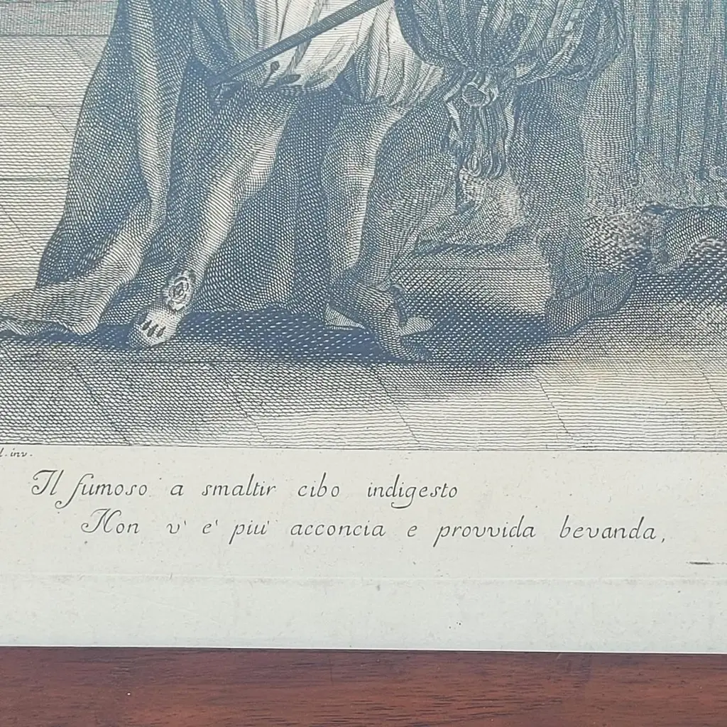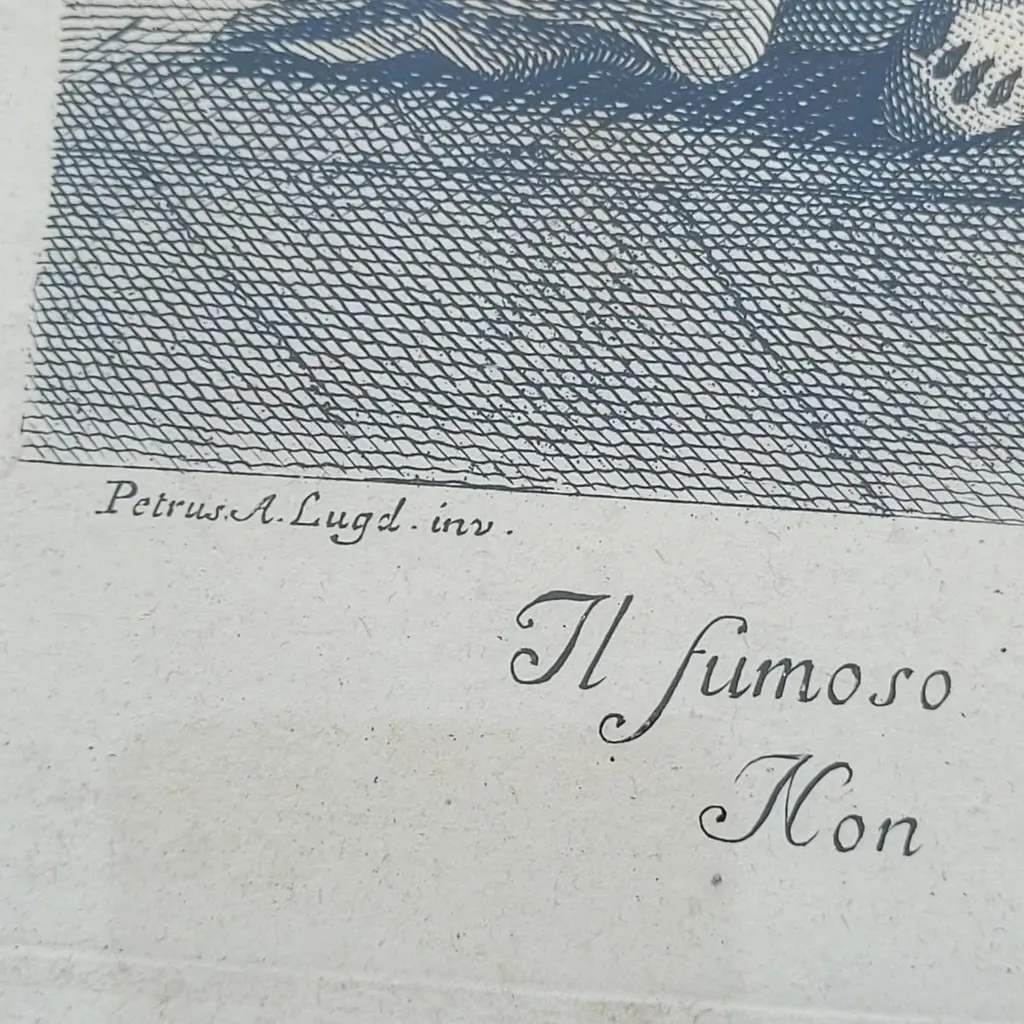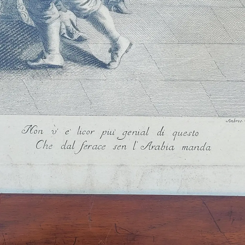 Framed engraving depicting an animated interior scene of several characters around a table. It bears the following description: "Il fumoso a smaltir cibo indigesto - non v'e piu acconcia e provvida bevanda, Ne v'e licor piu genial di questo- che dal ferace sen l'Arabia manda" as well as the signatures: "Petrus A Lugd inv" and "Ambros O Sculptsit" Walnut frame, stains, foxing, tears and losses Not examined without frame Dimensions with frame: 56.5 x 47cm Dimensions without frame: 47 x 37.5cm