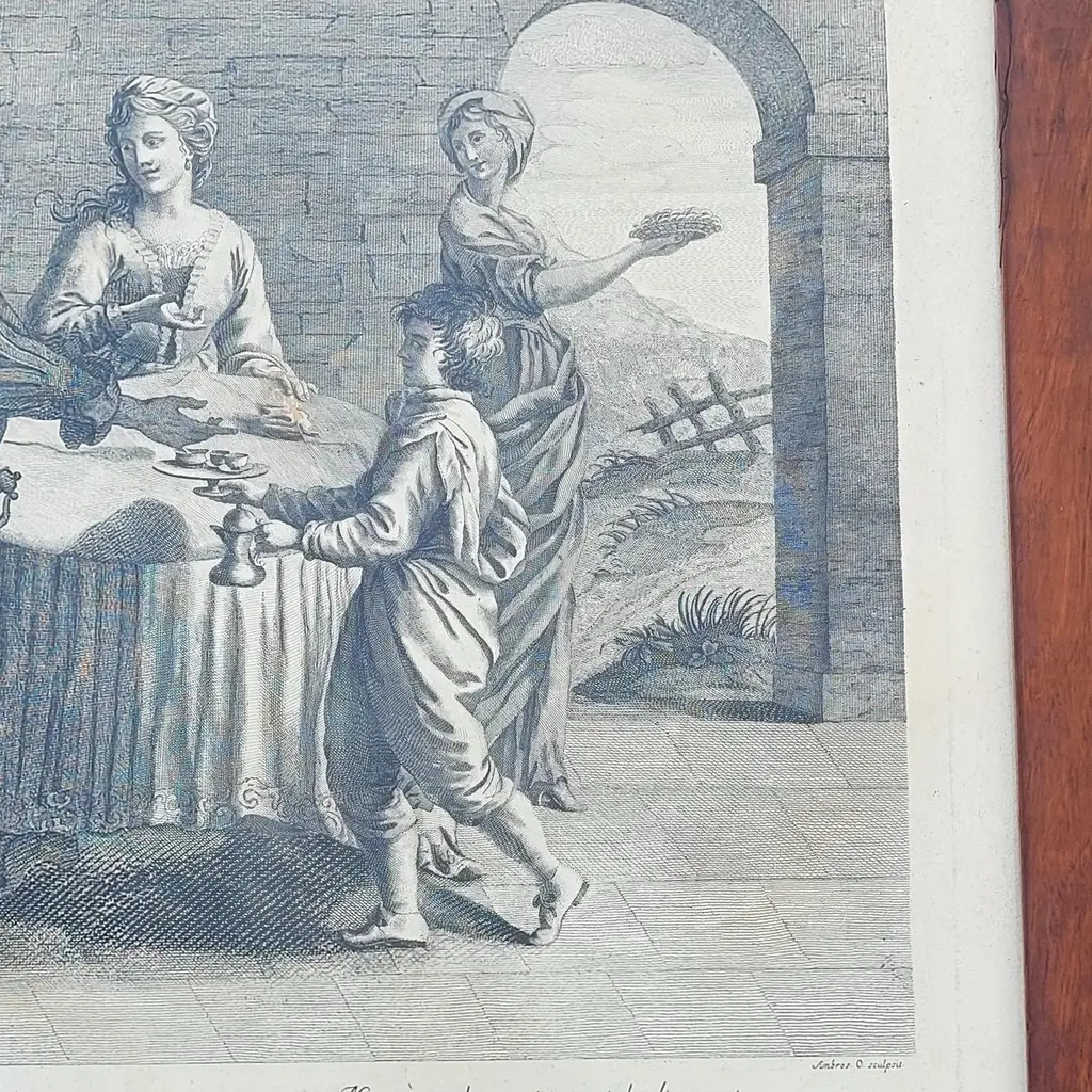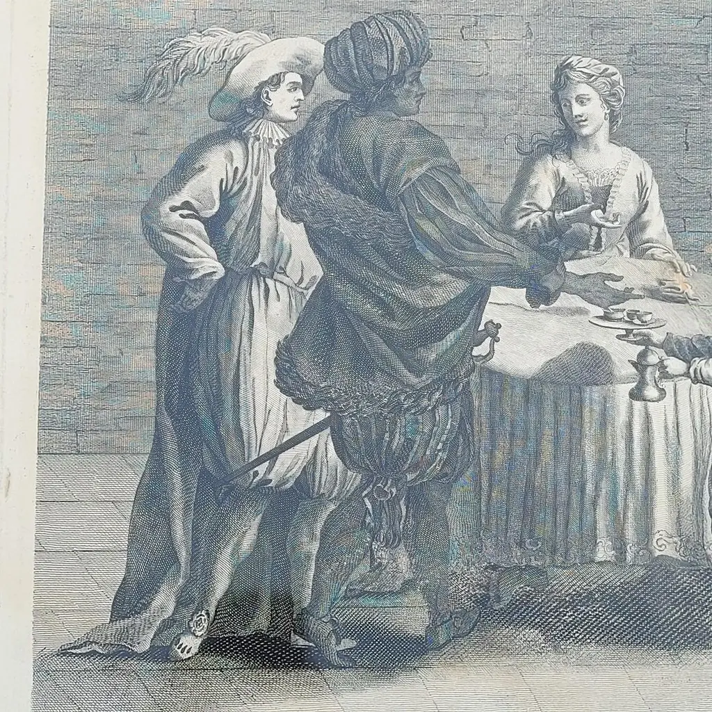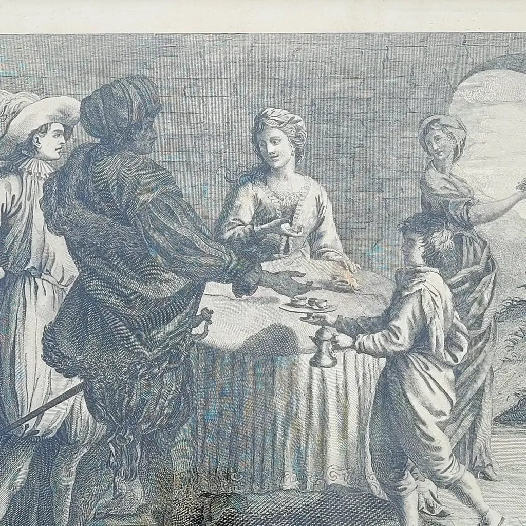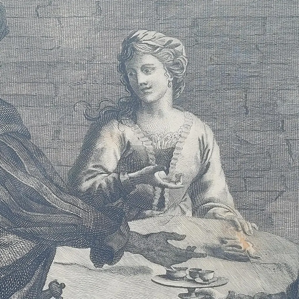 Framed engraving depicting an animated interior scene of several characters around a table. It bears the following description: "Il fumoso a smaltir cibo indigesto - non v'e piu acconcia e provvida bevanda, Ne v'e licor piu genial di questo- che dal ferace sen l'Arabia manda" as well as the signatures: "Petrus A Lugd inv" and "Ambros O Sculptsit" Walnut frame, stains, foxing, tears and losses Not examined without frame Dimensions with frame: 56.5 x 47cm Dimensions without frame: 47 x 37.5cm
