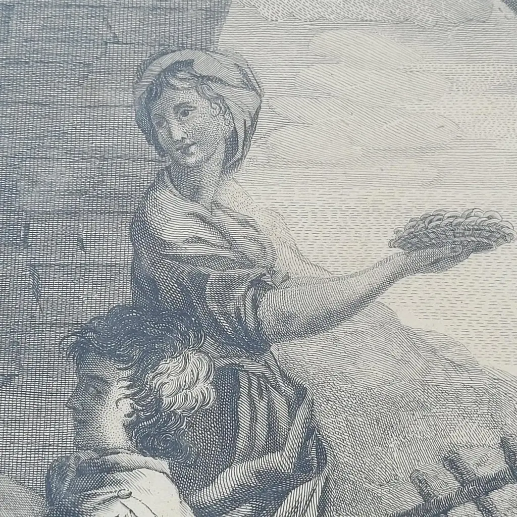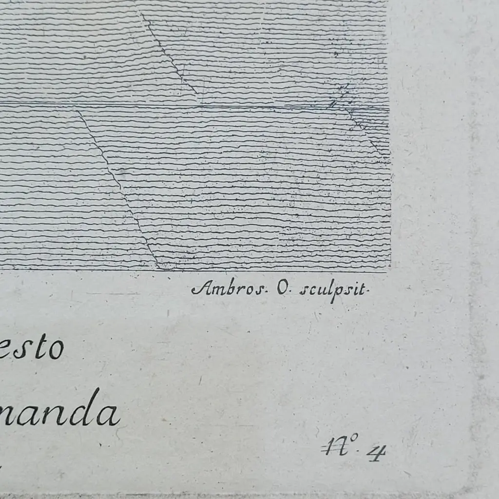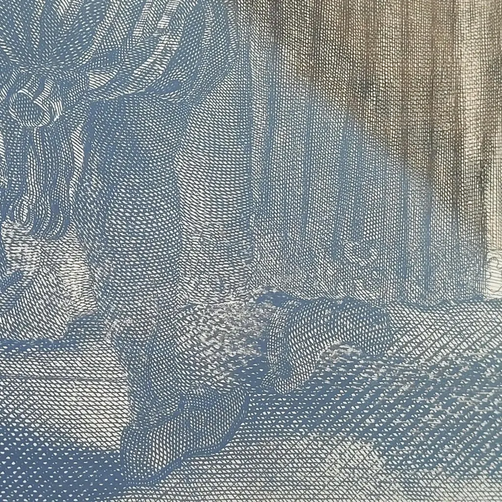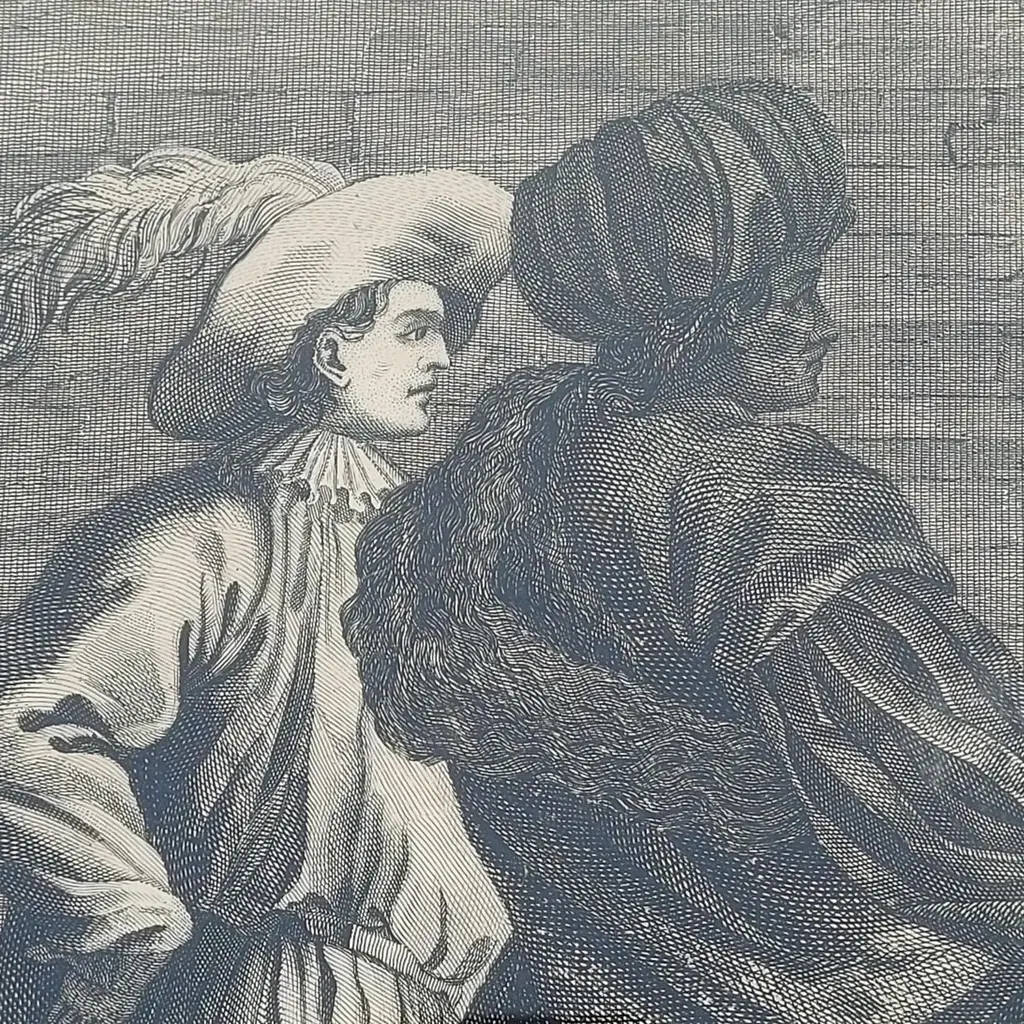 Framed engraving depicting an animated interior scene of several characters around a table. It bears the following description: "Il fumoso a smaltir cibo indigesto - non v'e piu acconcia e provvida bevanda, Ne v'e licor piu genial di questo- che dal ferace sen l'Arabia manda" as well as the signatures: "Petrus A Lugd inv" and "Ambros O Sculptsit" Walnut frame, stains, foxing, tears and losses Not examined without frame Dimensions with frame: 56.5 x 47cm Dimensions without frame: 47 x 37.5cm