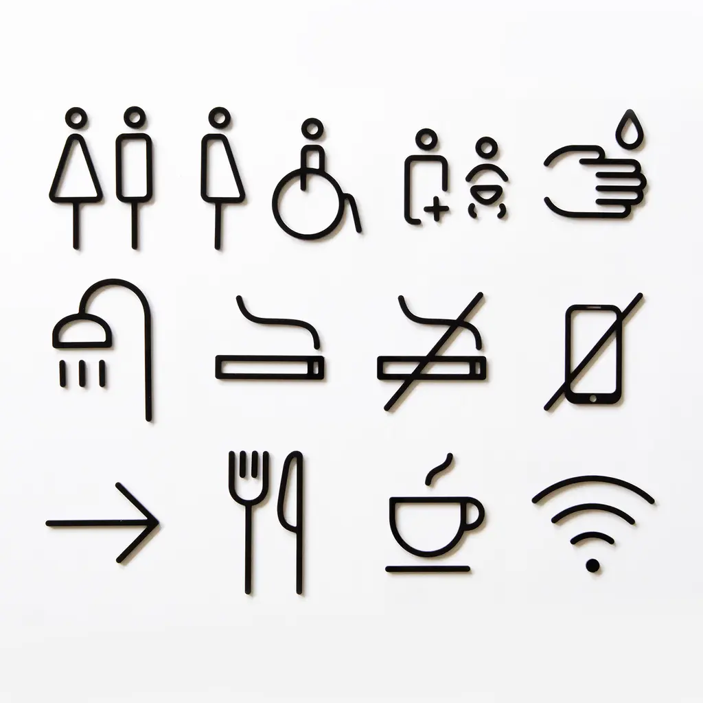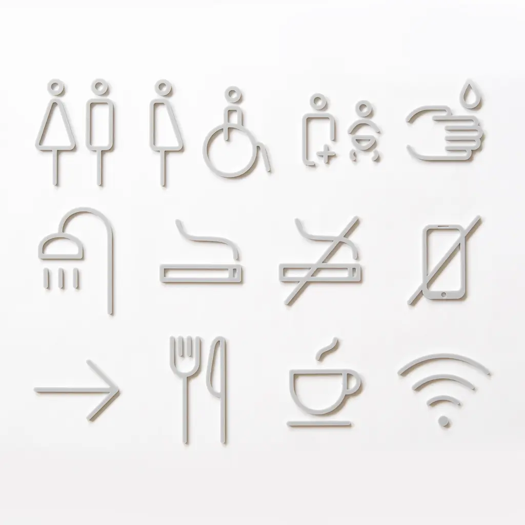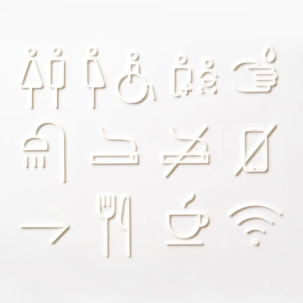 The Moheim’s interior wall/door architectural pictogram signs is a collection of most popular icon signs that help the vistors to visualize the directions and type of spaces or activities located in a premises. Designed by Shigeichiro Takeuchi, the collection made of natural wood comes in two finishes, white oak and walnut. This vertical signage is designed for all type of indoor walls and doors; it is suitable for homes, offices, public spaces, hotels and any other indoor space. Its contemporary design adds an elegant touch to any interior, it features an array of symbols that spans from directional arrow, restroom, gender neutral, accessible, wash-hand, shower, no phone, cafe, restaurant, wi-fi, no-smoking and smoking signs. The signs come with an adhesive layer on the back and a pasteboard that helps to place them correctly on every type of surfaces.