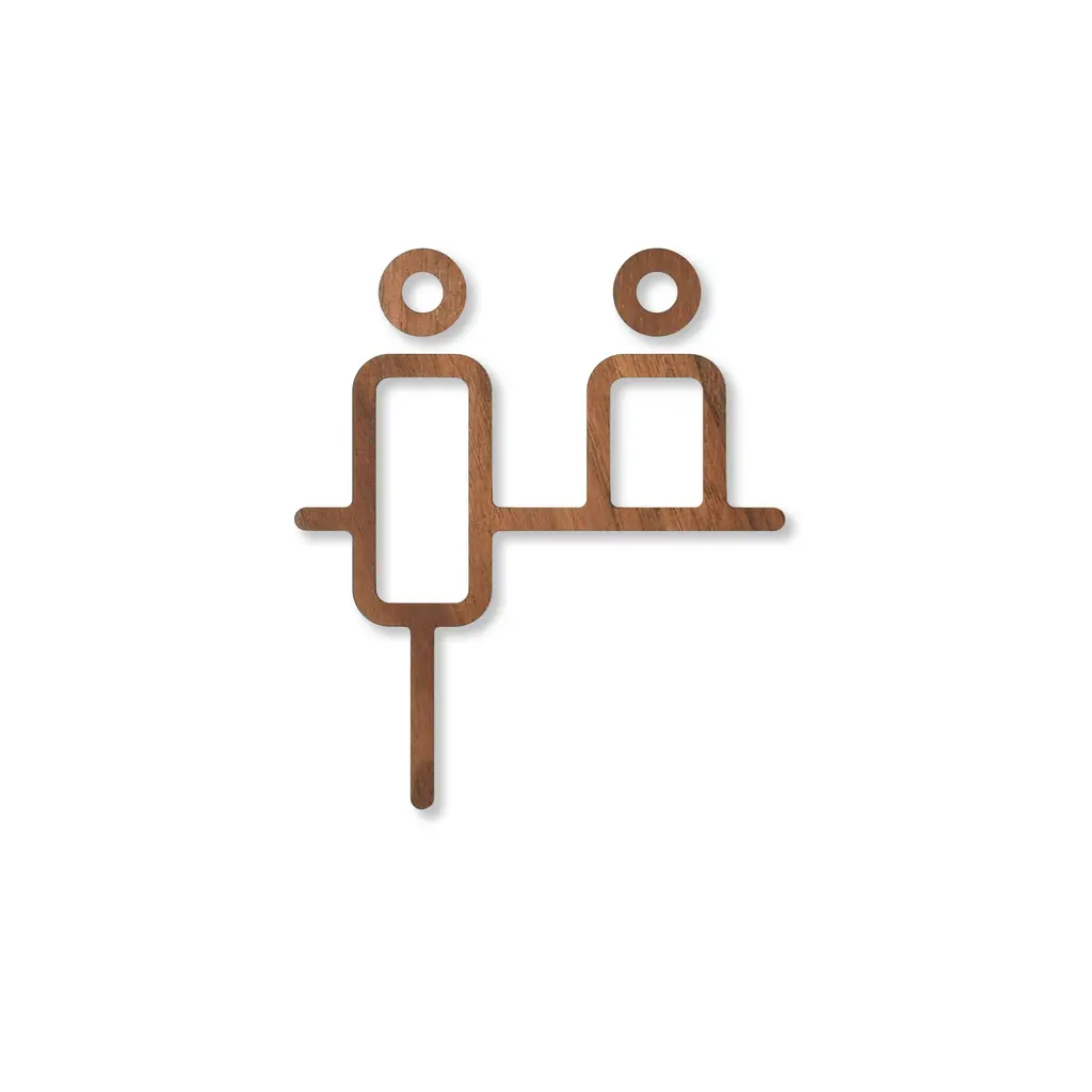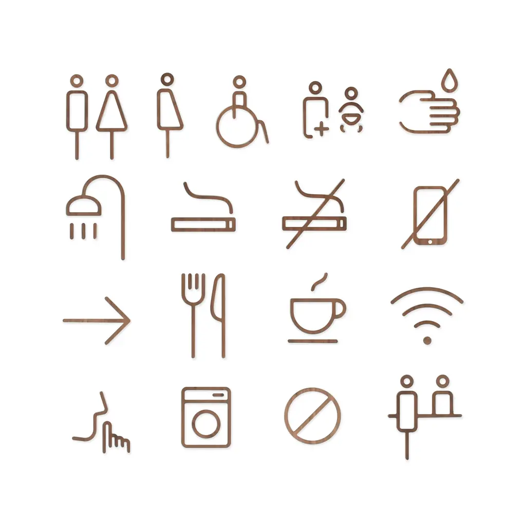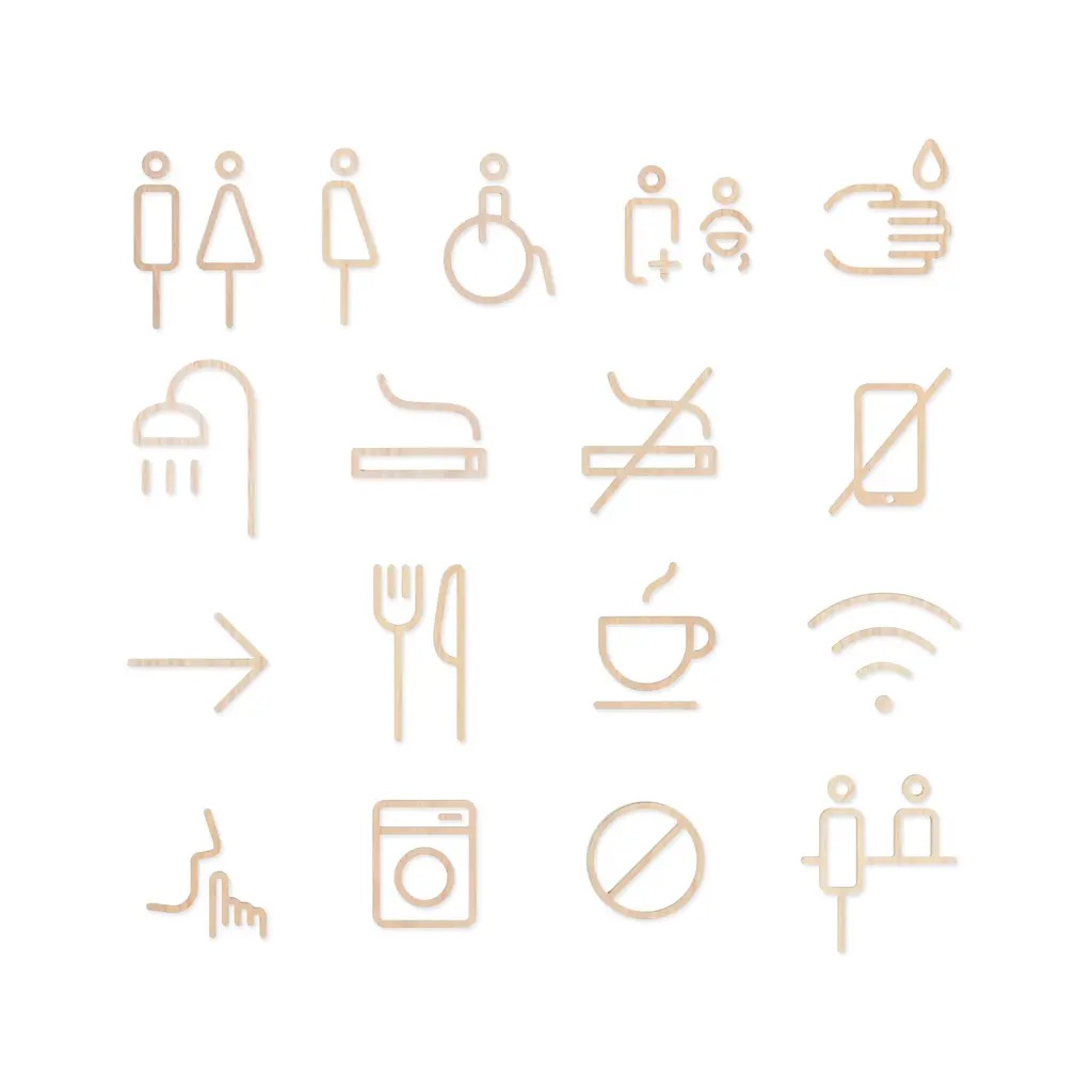 The Moheim’s interior wall/door architectural pictogram signs is a collection of most popular icon signs that help the vistors to visualize the directions and type of spaces or activities located in a premises. Designed by Shigeichiro Takeuchi, the collection made of natural wood comes in two finishes, white oak and walnut. This vertical signage is designed for all type of indoor walls and doors; it is suitable for homes, offices, public spaces, hotels and any other indoor space. Its contemporary design adds an elegant touch to any interior, it features an array of symbols that spans from directional arrow, restroom, gender neutral, accessible, wash-hand, shower, no phone, cafe, restaurant, wi-fi, no-smoking and smoking signs. The signs come with an adhesive layer on the back and a pasteboard that helps to place them correctly on every type of surfaces.