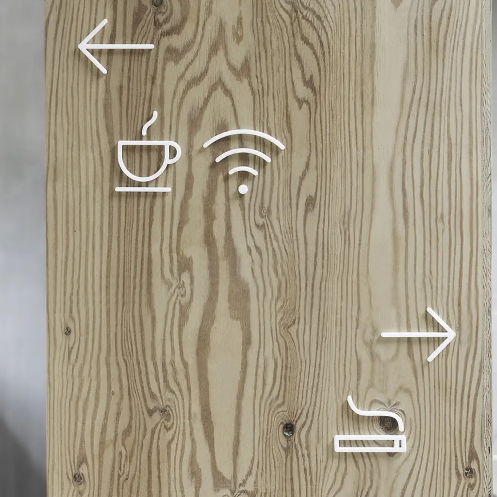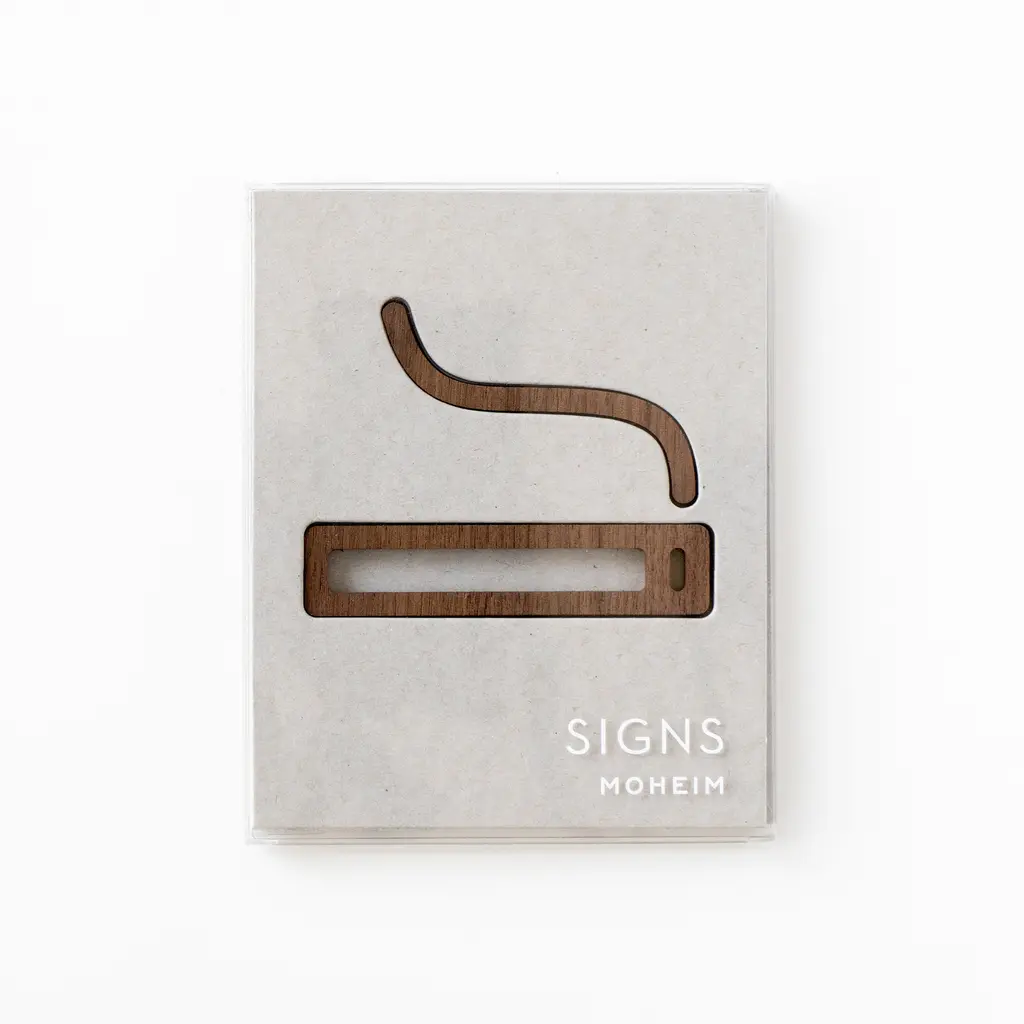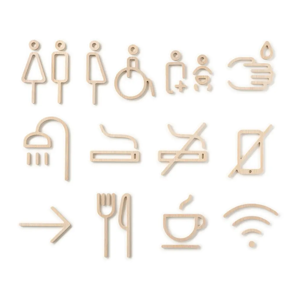 The Moheim’s interior wall/door architectural pictogram signs is a collection of most popular icon signs that help the vistors to visualize the directions and type of spaces or activities located in a premises. Designed by Shigeichiro Takeuchi, the collection made of natural wood comes in two finishes, white oak and walnut. This vertical signage is designed for all type of indoor walls and doors; it is suitable for homes, offices, public spaces, hotels and any other indoor space. Its contemporary design adds an elegant touch to any interior, it features an array of symbols that spans from directional arrow, restroom, gender neutral, accessible, wash-hand, shower, no phone, cafe, restaurant, wi-fi, no-smoking and smoking signs. The signs come with an adhesive layer on the back and a pasteboard that helps to place them correctly on every type of surfaces.