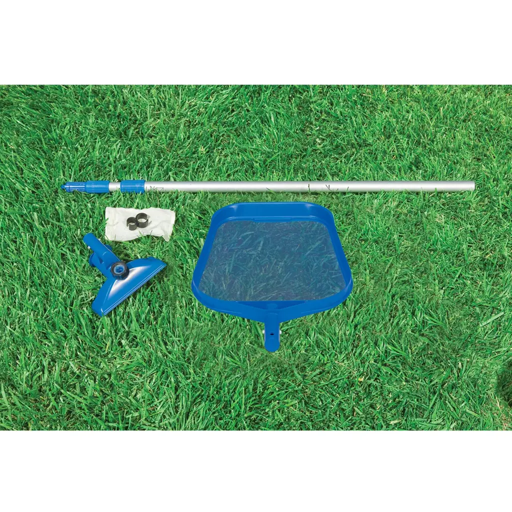 Beat the heat and make a splash in this Intex 12 x 2.5 Foot Metal Frame Above Ground Pool and Filter. Keep this pool clean with the Intex Pool Maintenance Kit that comes complete with this package. At 12 feet wide and 30 inches in height, this metal frame pool is great for having people over for to cool off. It's easy to assemble and maintain and fits perfectly on a flat surface in your backyard. It's made of strong and durable material, Intex's high-molecular Super-Tough PVC. The pool set includes an Intex 530 gallon per hour filter pump, 1 Type "A" filter cartridge to keep your pool sparkly clean, and a helpful instructional DVD to help get you started. Your backyard will be the hot spot on the block with this Intex 12 x 2.5 Foot Metal Frame Above Ground Pool and Filter summer after summer. Intex 12 x 2.5 Foot Metal Frame Above Ground Pool with Filter and Intex 28002E Cleaning Maintenance Swimming Pool Kit w/ Vacuum Skimmer & Pole An affordable alternative to more complicated steel walled pools, and a more durable alternative to inflatable models Provides both value and convenience for years of enjoyment Includes 1 type "A" filter cartridge Easy to assemble, ready for water in just 30 minutes Dual suction outlet fittings improve water circulation resulting in better water hygiene and clarity Included 530-gallon-per-hour filter pump helps keep your water sparkling clean Filter is equipped with shut off if electrical current is exposed to water Walls are made of Intex's tough PVC Drain plug accepts a garden hose to conveniently drain water away Specifications: Material: PVC Capacity: 6 people Capacity: 1,718 gallons Liner included: No Filter pump included: Yes Cover included: No Ladder included: No Color: Blue Dimensions (L x W x H): 144 x 144 x 30 inches Weight: 55 pounds