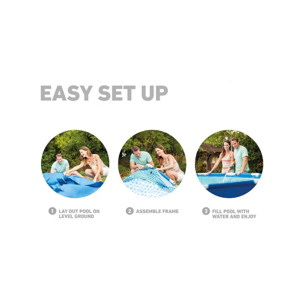 Relish the easy assembly and automated maintenance of the INTEX® Metal Frame Above Ground Swimming Pool. Equipped with simple T-joints for setup—no pins!—this pool can be ready for water in approximately 60 minutes. Its included 475 GPH filter pump with an energy-saving timer then provides automatic daily filtration in two 12-hour cycles. The pool liner boasts a 3-ply, puncture -resistant laminate material for durability.
