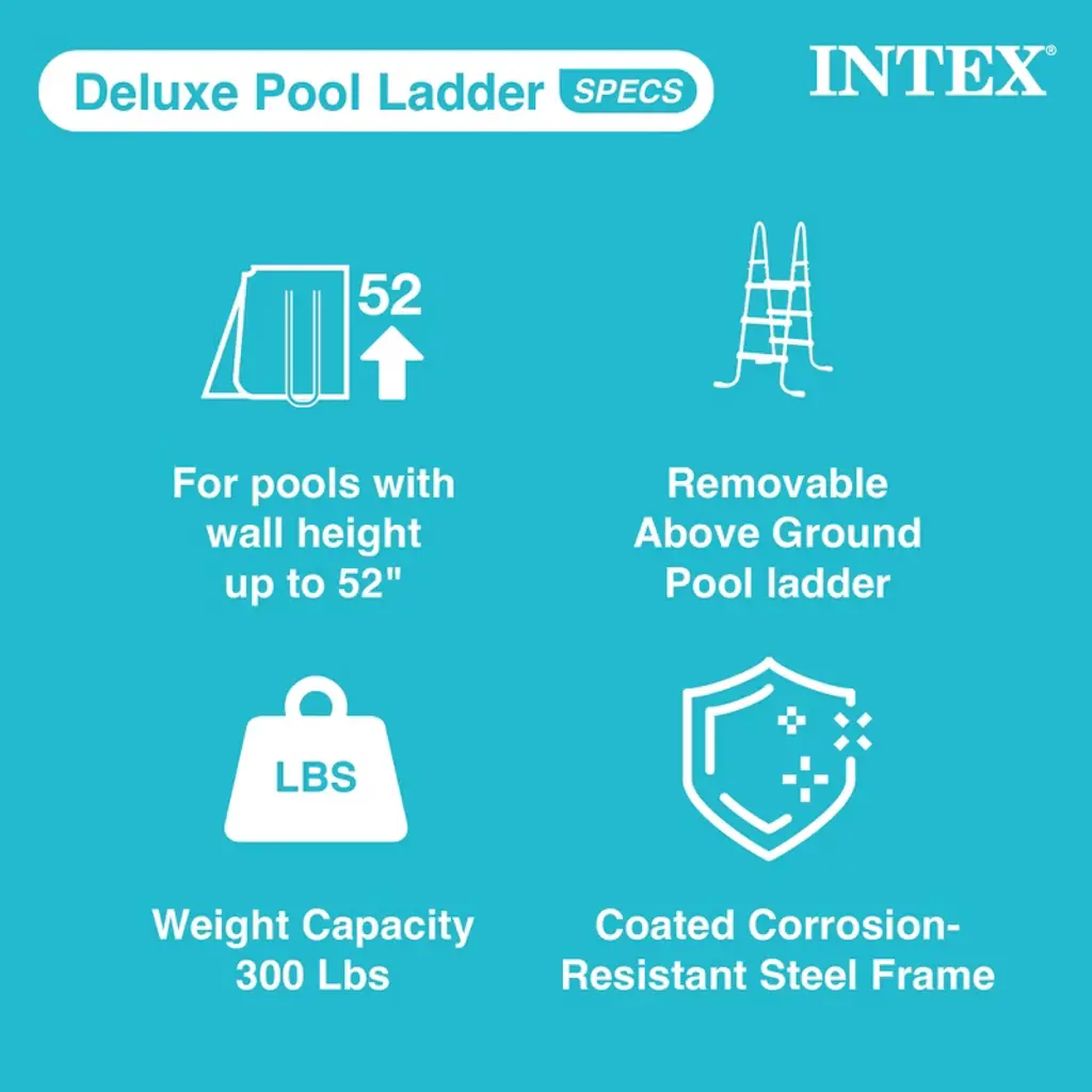 The Intex 52-Inch Pool Ladder is the best choice for your 52-inch tall above ground swimming pool. This ladder is a practical, as well as attractive, addition to your pool set. This industry leading swimming pool ladder includes easily removable steps that can be removed from the pool area when it is not in use. To replace these steps, simply set them in the base then snap and lock them into place. It's constructed from high impact composite material for superior strength and durability. It features an improved support base design to ensure years of use. Assembly is easy with this ladder as the pieces all connect. All in all, assembly only takes minutes. Add the perfect pool accessory to your summer set up with the Deluxe Pool Ladder by Intex.