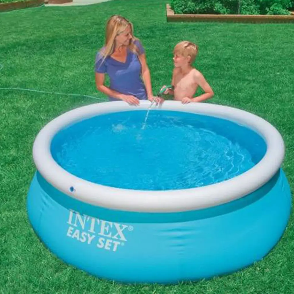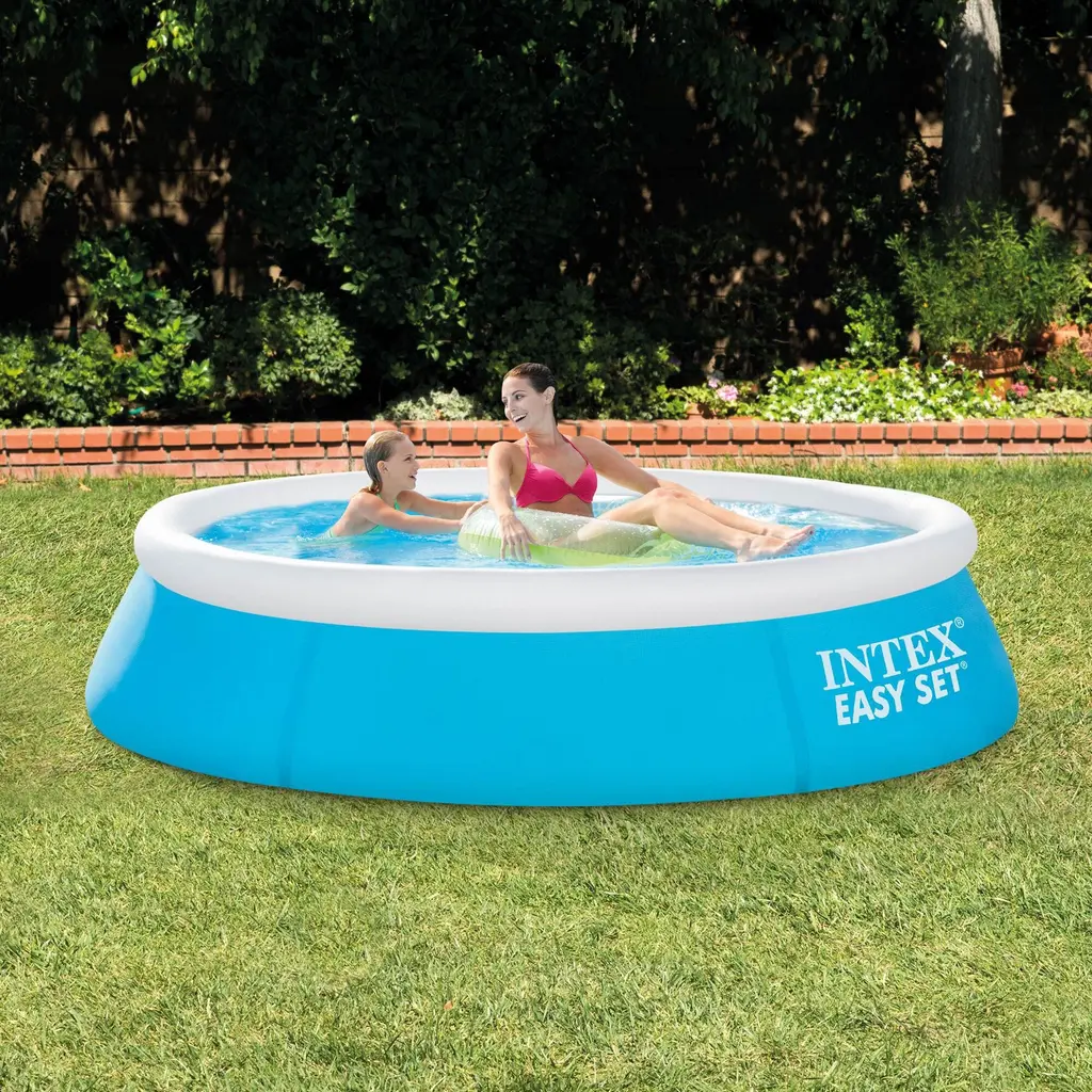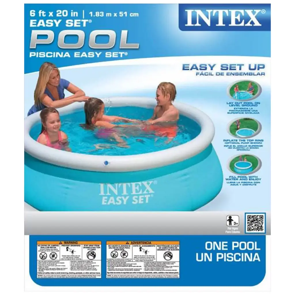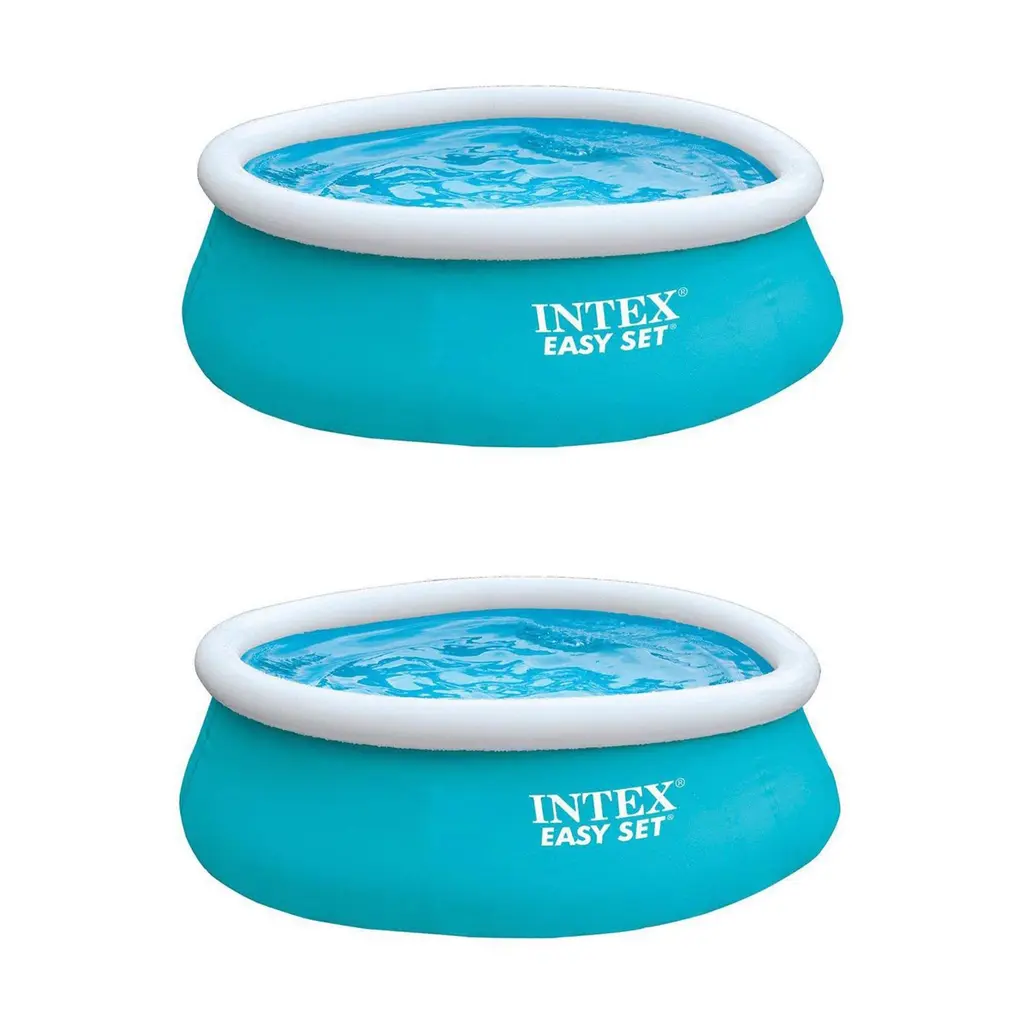 This Easy-Set pool sets up quickly and easily, and does not require any tools. All you need is a level space outside to put it. Assembly entails inflating the top ring and filling with water and the Easy Set does the rest! Get ready for a summer full of fun in as little as 10 minutes! Quantity: 2 Part #: 28101EH (54402E) Product Weight: 7 lbs Color: Aqua blue Water capacity (filled at 80% of wall height): 234 gallons Durable materials are resistant to the elements 20" wall height 6' wall-to-wall diameter Watch as the Easy Set does the rest Inflate top rail with air (pump not included) and fill with water No tools required for setup, just set on level ground and you're ready **Intex 6' Easy Set Swimming Pool** Warranty: One Year Intex Warranty