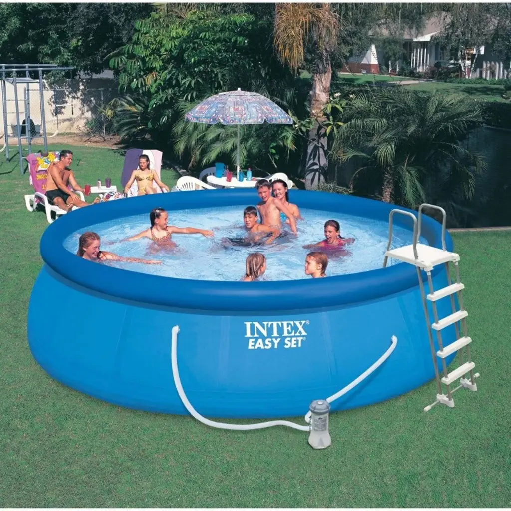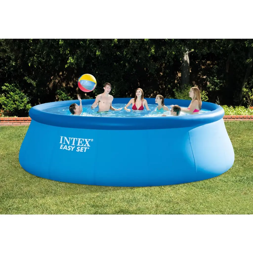 Enjoy hours of family fun in just 15 minutes with this Intex Easy Set Inflatable Pool complete with a debris cover. With its super easy, no tool set up, you simply fill the upper ring with air and fill the pool with water. Easy Set above ground pools are great for adults and kids. This set includes everything you need to get started, with a filtration pump, pool cover, ground cloth, ladder, and an instructional DVD. After season, these pools even drain conveniently. The drain plug accepts a garden hose to drain water away from the pool to a desired area. Easy Set above ground pools are much easier to disassemble than any rigid steel walled pool. Family members of all sizes can enjoy a soak in the Intex 15' x 48" Easy Set Above Ground Pool!