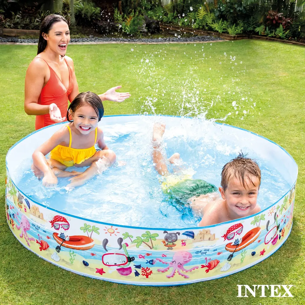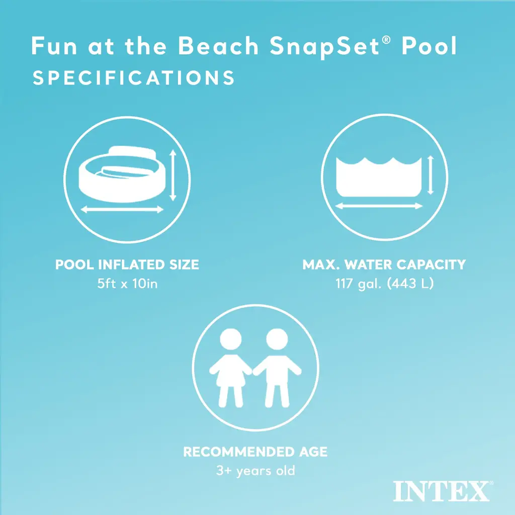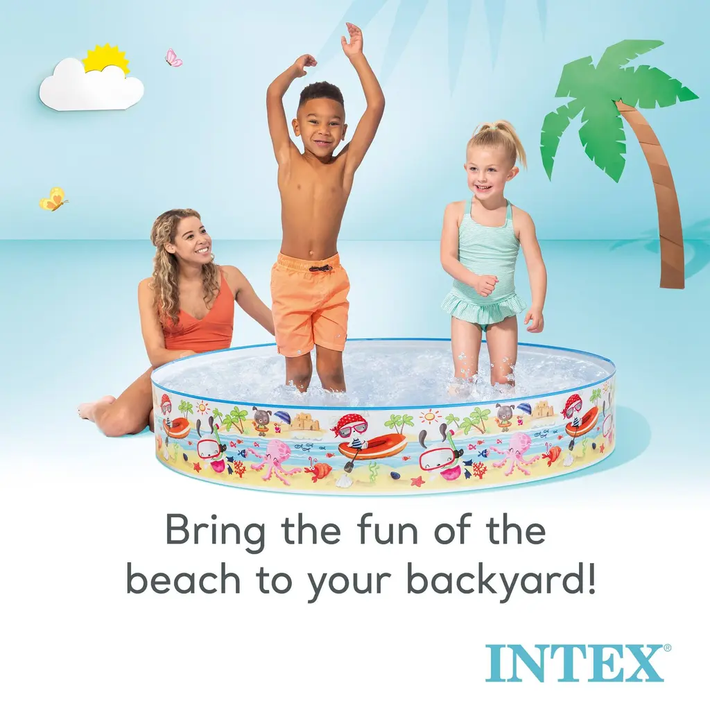 Take a splash in the Beach Days Snapset Pool from INTEX! Remarkably easy to setup, the Beach Days Snapset Pool requires no air inflation. Simply fill with water and your little ones will be splashing and playing in minutes. Bring all the fun of the beach to your backyard and enjoy the colorful beach graphics with the Beach Days Snapset Pool from INTEX. Fast and easy relief from the summer sun The Beach Days Snapset Pool requires no air inflation Assembled Dimensions: 60" x 10" Allows for 9.5" of water 119 gallon (450 L) capacity Includes repair patch Care and Cleaning: easy to wipe clean Ages: 3+ Product Weight: 2.8 lbs Part Number: 56451EP Warranty: 30 day manufacturer warranty against product defects; Warranty does not cover tears, punctures or holes