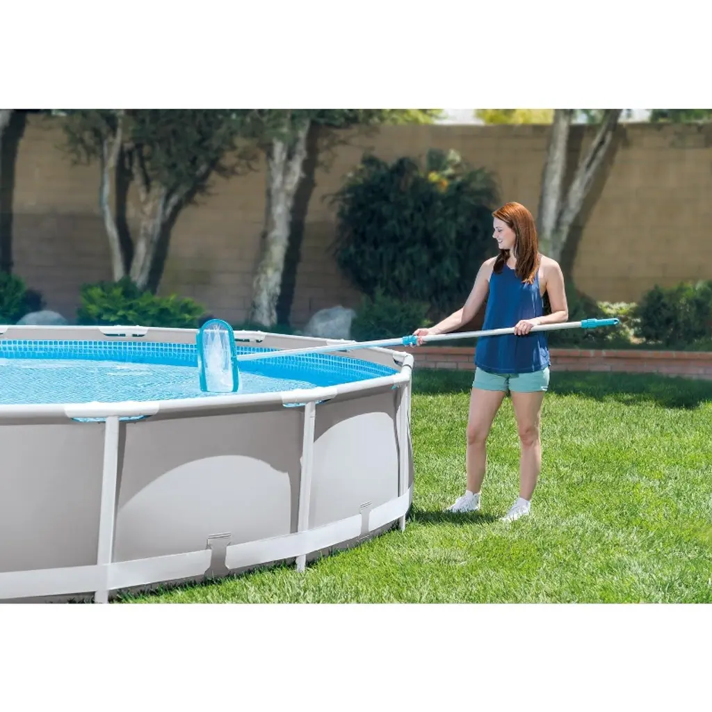 The ultimate in pool maintenance kits, the Intex Deluxe Pool Maintenance Kit is perfect for keeping Intex pools clean and fresh for swim time. This kit includes a 110in telescoping aluminum shaft for use with 18ft diameter pools and above. The kit also includes a vacuum that sucks debris off the pool floor and through the filter (requires an Intex filter pump with a minimum flow rate of 800 gph (3,028 L/hr) and can attach to the outlet connector in the pool with a 24ft 7in hose. The telescoping aluminum shaft can be used with the following included attachments: vacuum head, durable and deep mesh skimmer net, and wall brush attachment.