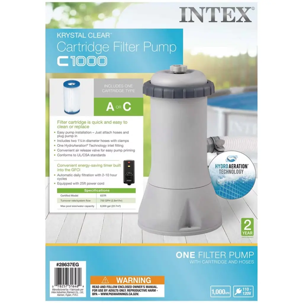 Keep your pool water Krystal Clear™ and refreshing this summer with the Intex® 1,000 GPH Filter Cartridge Pump! Boasting a pump flow rate of 1,000 gallons per hour and a system flow rate of 750 gallons per hour, this pump will circulate and filter the water in your above ground pool to keep everything clean, refreshing, and fun. In addition, the maintenance for this pump is a breeze: just the occasional cartridge rinse or swap to keep this pump running strong. This filter uses Type A filter cartridges (Item #29000E) which should be changed every couple of weeks. This pump is a must have for any above ground pool up to 6,000 gal. Compatible with 18ft Easy Set Pool; 18ft, 20ft Frame Pool; 16.5ft, 20ft Prism Frame Oval Pool. Hydro Aeration® Technology by Intex® - transforming the Above Ground Pool industry, by bringing revolutionary water aeration techniques into your backyard above ground pool.