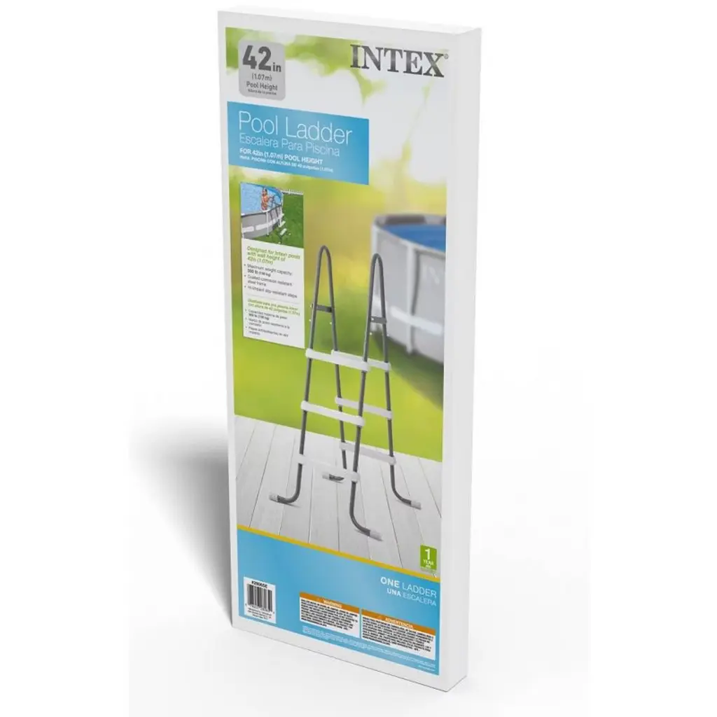 The Intex Pool Ladder for 42" pools with barrier was designed with two concepts in mind, convenience and safety. Don't risk injury jumping in and out of your pool when this ladder makes using your pool easy and safer. The Intex Pool Ladder features a barrier that blocks any young swimmers from getting between the ladder and the side of the pool. Make your pool time fun as safe and easy as possible with the 42" Pool Ladder from Intex. Product Details: Provides a safer swimming environment for kids by not allowing them to get stuck. Hi-impact slip-resistant steps provide durability and a solid platform. Coated corrosion resistant steel frame ensures longevity. Conforms to U.S. regulation. ANSI/APSP-4. Weight Capacity: 300 lbs. Weight: 20 lbs. Box Dimensions: 34.5" x 13.75" x 6.25".