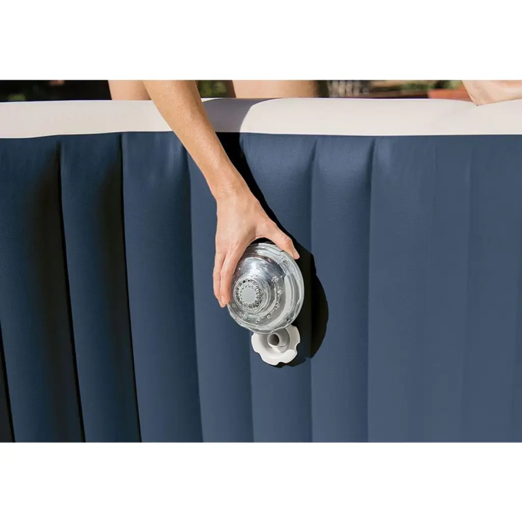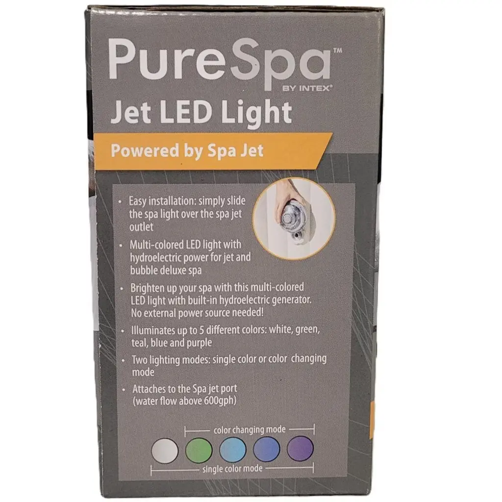 With the Intex 28504E PureSpa Jet LED Light you can light up your spa for a romantic evening. An easy installation, you just slide the spa light over the spa jet outlet. You can use the single color mode or change to the color changing mode. The color changing mode illuminates up to 5 different colors: white, green, teal, blue and purple. No external power source is needed! The light attaches to the spa jet port with a water flow above 600GPH. Compatible with Intex PureSpa models: 28453 and 28455 Jet and Bubble Deluxe, 28421 and 28435 Jet Massage. 8504E Intex Multicolored LED Light with Hydroelectric Power for Jet and Bubble Deluxe. Brighten up your spa with this Multi Colored LED Light with built in hydroelectric generator. No external power source needed! Pick up to 5 different colors: white, green, teal, blue and purple. Two lighting modes: single color or color changing mode. Wattage: 0.6W.