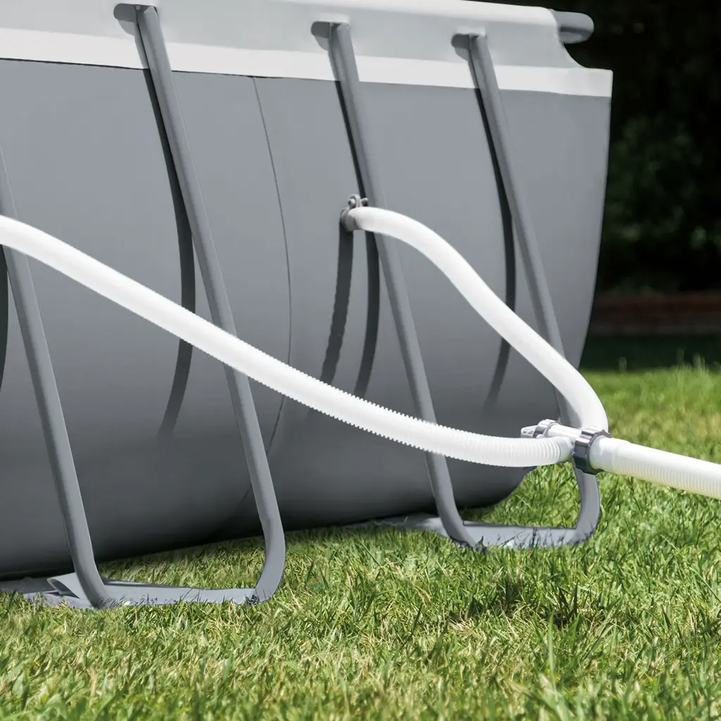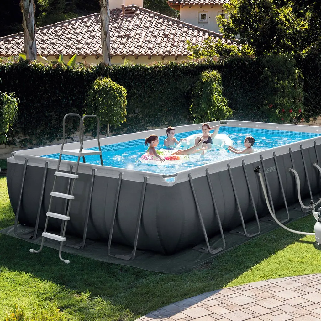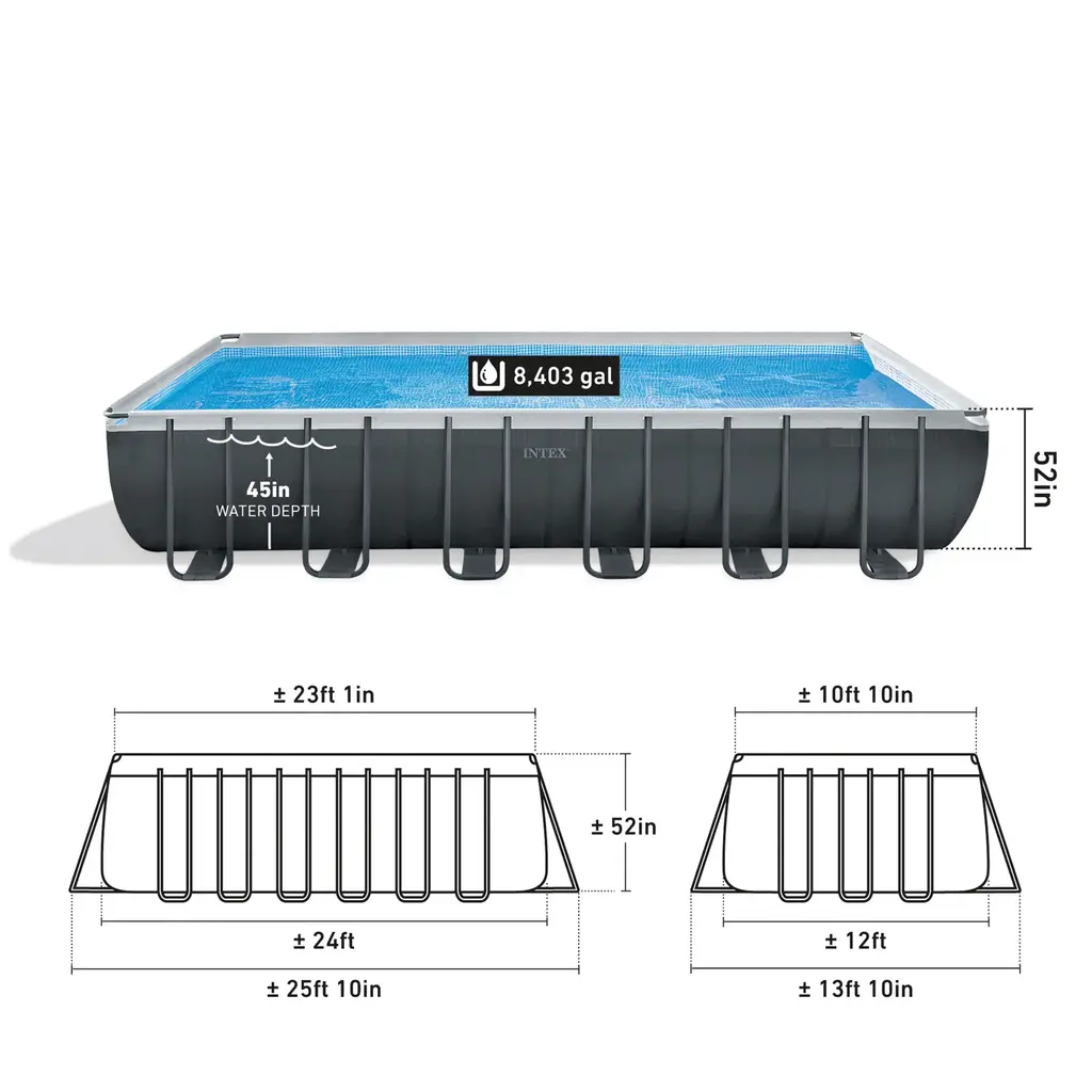 Ditch the pool cleaning hassle with the Intex ZX100 Auto Pressure Side Pool Cleaner and Rectangular Ultra XTR Frame Swimming Pool with Pump. This ZX100 is a convenient pressure-side automatic floor cleaner to simplify pool maintenance. You only need to connect it to the pool's inlet fitting, and it will create its suction. It effortlessly collects leaves, dirt, sand, and bugs in a spacious tray with a carry handle. Its oversized wheels ensure efficient cleaning in one direction, and the innovative hose design prevents tangling. Additionally, it's compatible with most above-ground pools and includes a 1.25-inch converter for added convenience. Comes with a rectangular pool ideal for narrow spaces, lap swimming, and games. Its ultra frame offers durability, quick setup, and a sleek grey finish. It comes with a ladder, cover, ground cloth, and a powerful Krystal Clear 2,100 GPH sand filter pump for an excellent pool experience. With a Krystal Clear sand filter pump saves you time, money, and hassle by replacing expensive filters with routine backwashing, needing sand replacement only every 5 years. This requires flat, level ground for proper installation. Enjoy the same process used at many resorts in your pool with the Intex ZX100 Auto Pressure Side Pool Cleaner and Rectangular Ultra XTR Frame Swimming Pool with Pump. Keep your pool clean all summer with the ZX100 automatic pressure side pool cleaner with Krystal clear saltwater system Automatic pool cleaner, compatible with most above-ground pools, features oversized wheels that rotate in one direction for efficient cleaning and works with pumps rated from 1,600 to 3,500 GPH water flow Comes with a large debris tray, fine mesh filter, 21-foot tangle-free hose, 1-1/4-inch converter, angled hose elbow, and swivel joint for effortless cleaning Laminated PVC siding with 3 separate material layers for strength and durability, along with rust-proof metal beams and joints that snap together for a rapid, 60-minute setup Includes a low-maintenance sand filter with 5-year sand replacement, built-in GFCI for safety, Hydro Aeration technology for improved circulation and water clarity, and a powerful 2,100 GPH pump flow rate ZX100 Automatic Pressure Side Swimming Pool Cleaner with Hose and Converter Color: White/ Gray Dimensions (L x W x H): 20 x 14 x 12 inches Weight: 13 pounds Rectangular Ultra XTR Frame Swimming Pool with Sand Filter Pump A-Frame pool ladder with interior side barrier for child safety, pool debris cover for protection against debris and wear, and convenient draining with a hose-compatible drain plug Includes: Debris cover, ground cloth, pool ladder, sand filter pump Disclaimer: Please review your HOA rules and restrictions before purchasing this product. Not all housing agencies permit private above-ground pools Material: Steel Pump voltage: 110-120V Water capacity: 8,403 gallons when filled to 90% full Color: Gray Dimensions (L x W x D): 24-foot x 12-foot x 52-inch Weight: 401 pounds