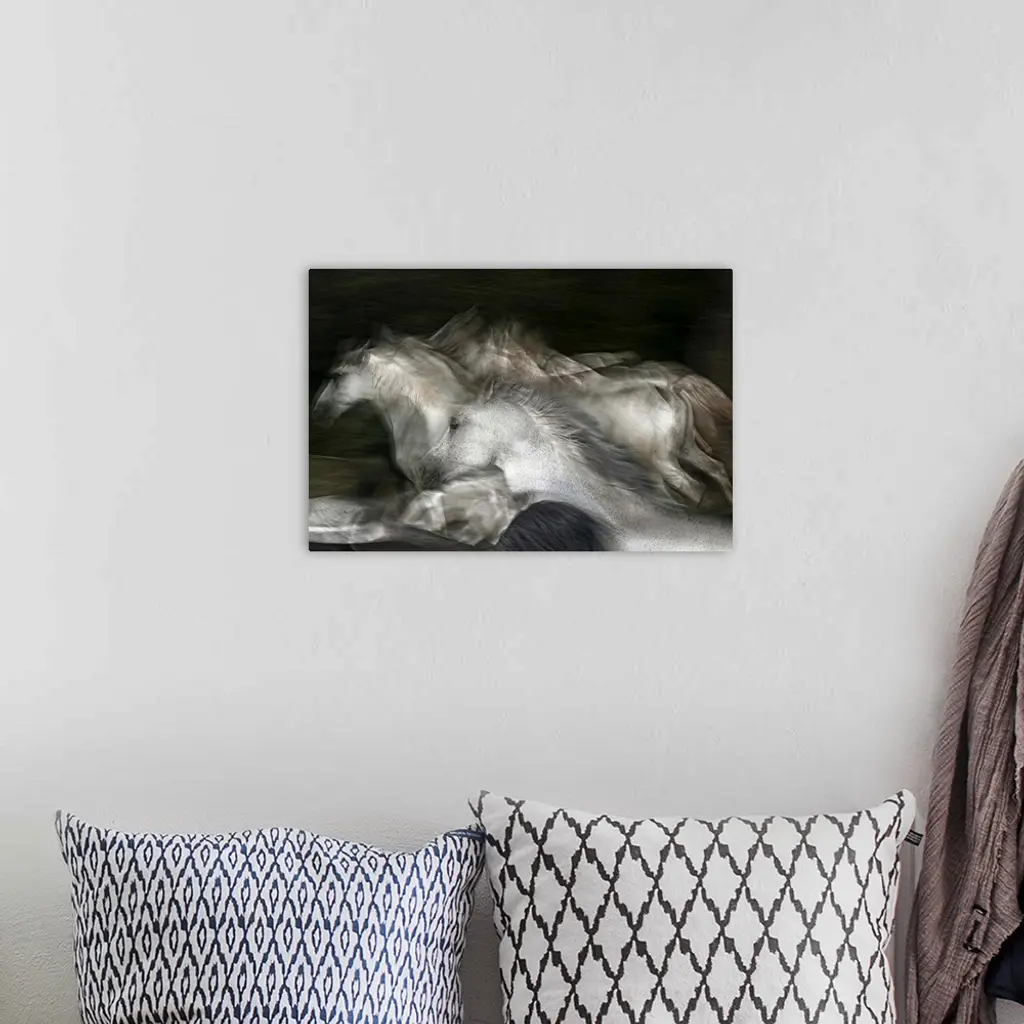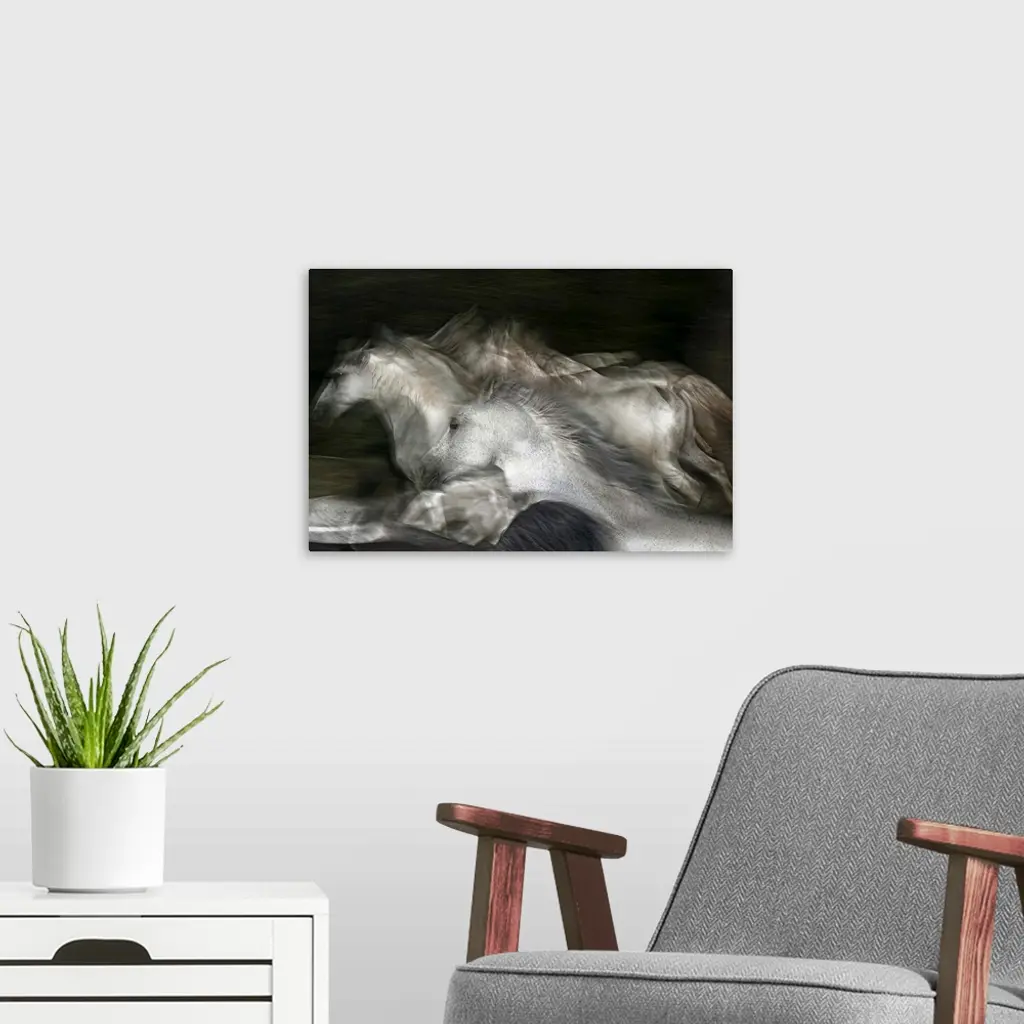 Blurred motion image of a herd of white horses galloping in a field.