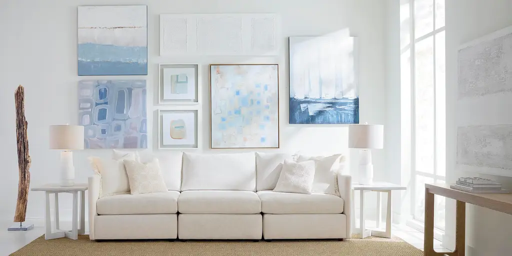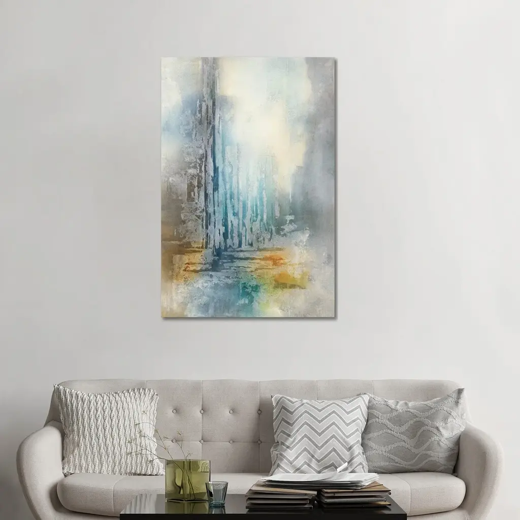 Into the Deep juxtaposes stark whites against rich blues to create an abstract scene resembling glaciers on the water. This piece is designed and painted entirely by hand by one studio artist from start to finish, right here in the USA. Because each piece is handpainted, no two will ever by exactly alike! Subtle differences will appear from one canvas to another, making it uniquely yours! This piece was created using acrylic paints on 100% cotton canvas, stretched on solid douglas fir stretcher bars & corners braces, and are wired and ready to hang.