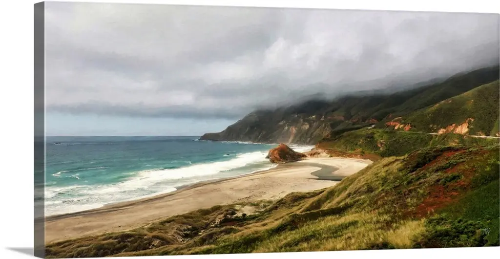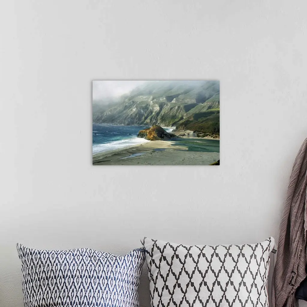 The setting sun breaks through coastal fog to light this spectacular stretch of coastline in Big Sur. In the foreground, the Little Sur River has flowed from the Santa Lucia Mountains to create a pool of fresh water on the beach. In the background, Highway 1 winds along the rugged coast.
