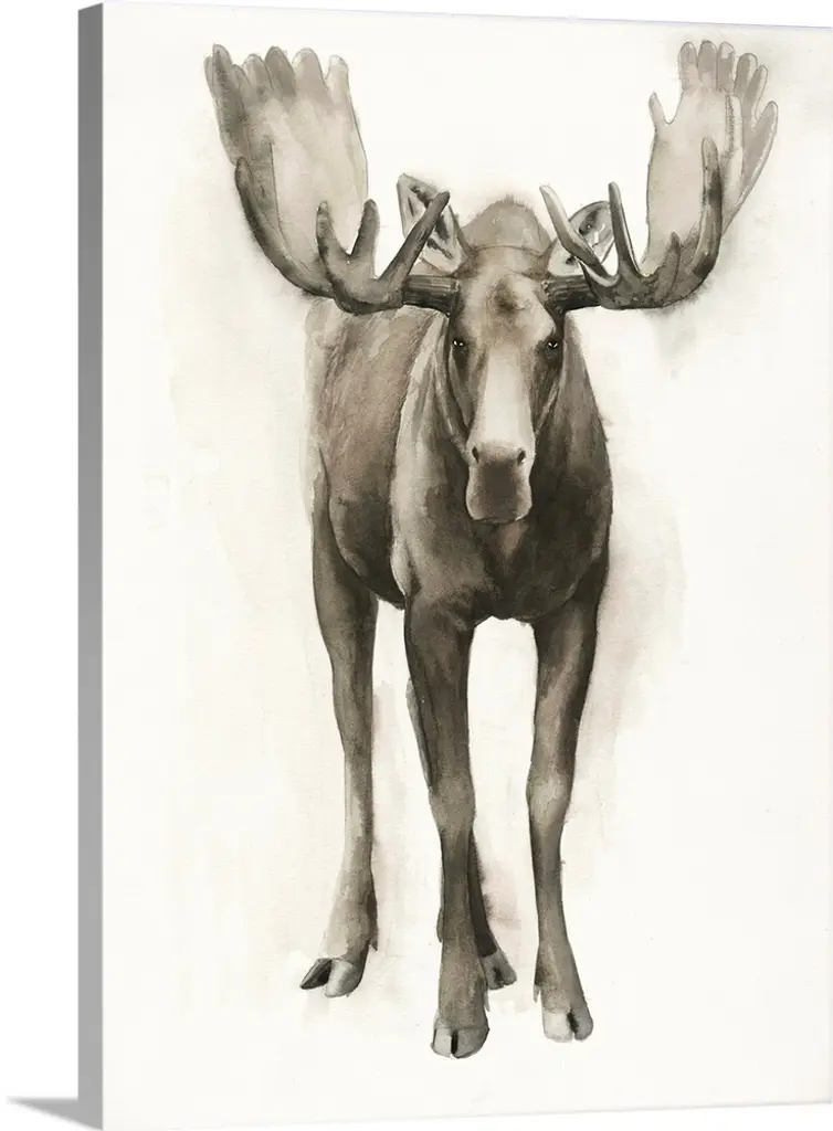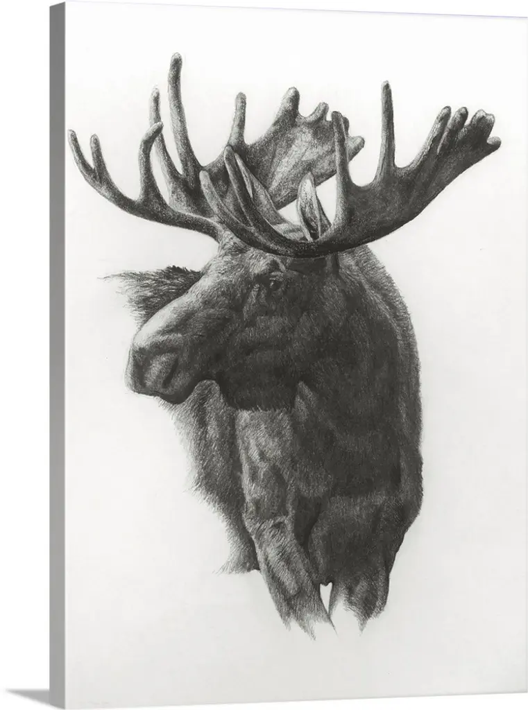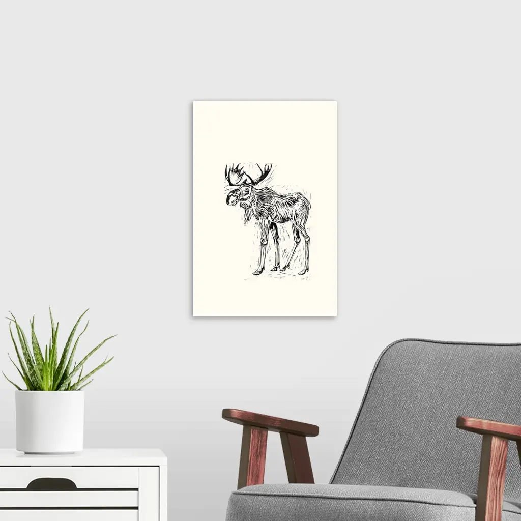 Black and white block print illustration of a moose on an off white background.