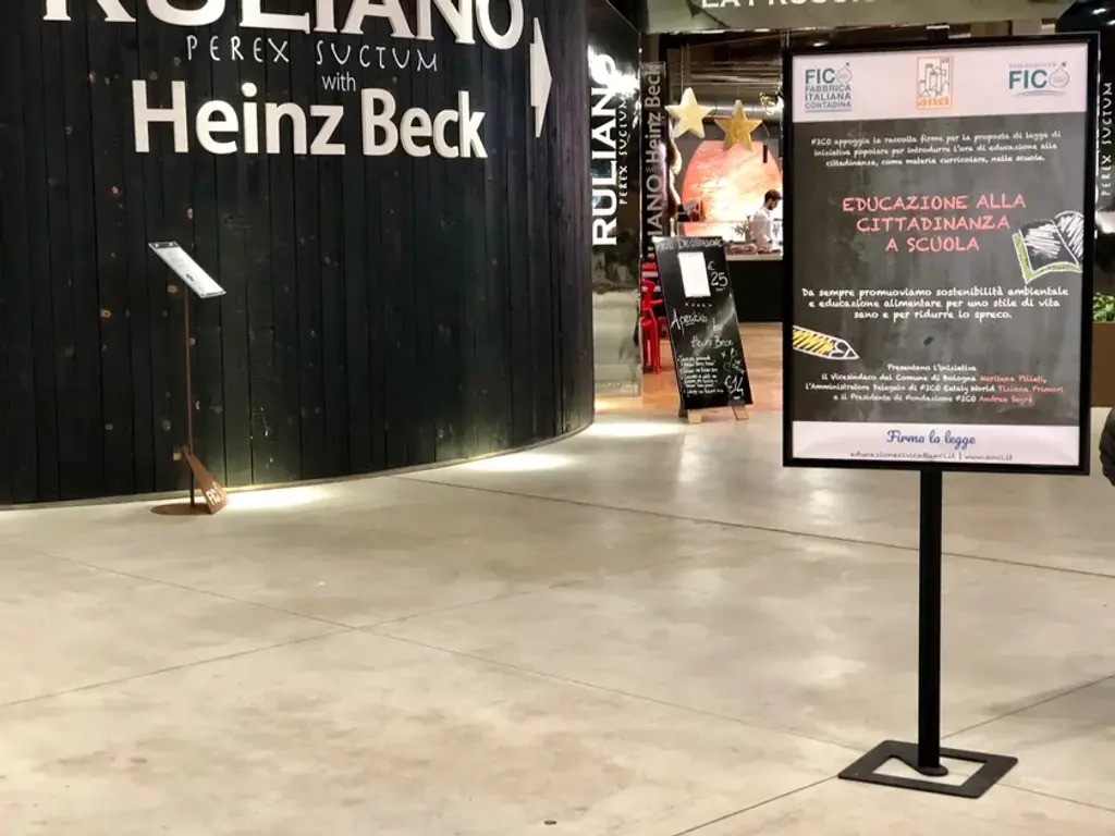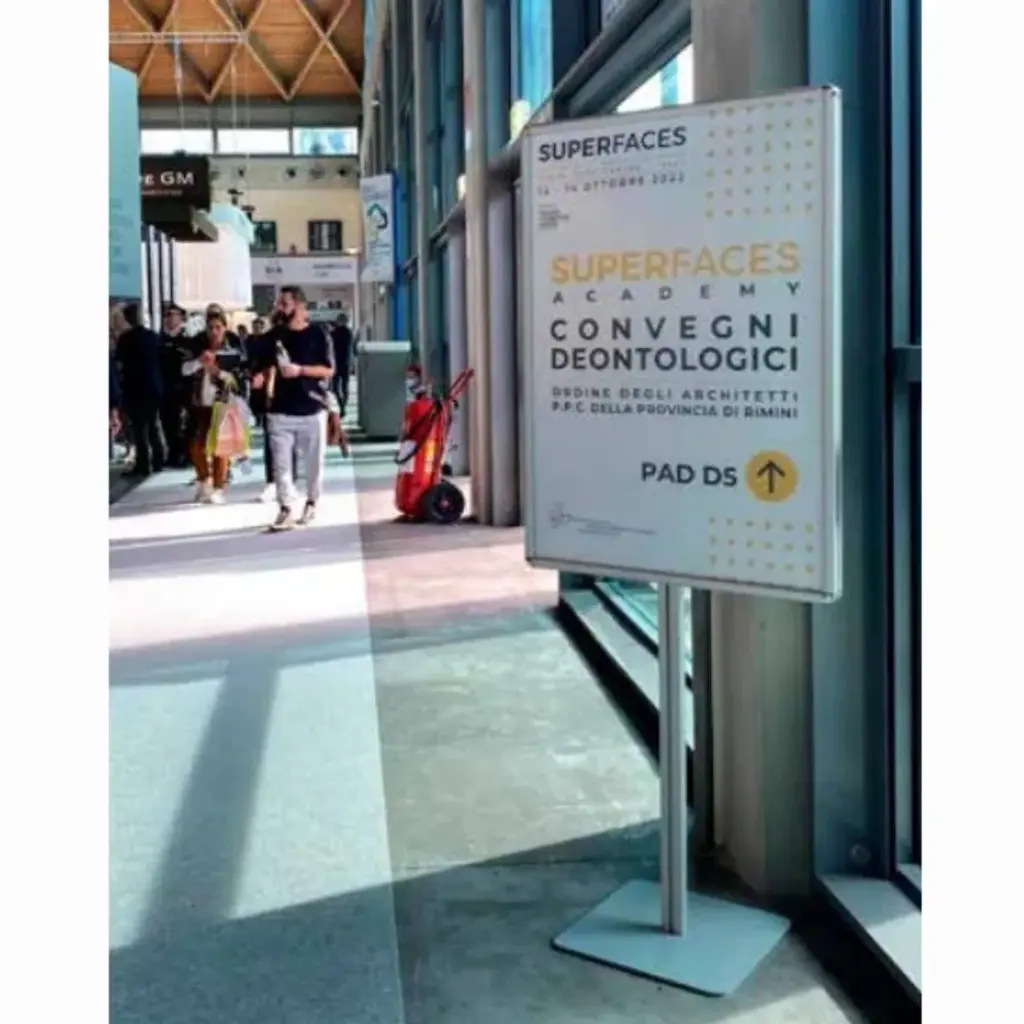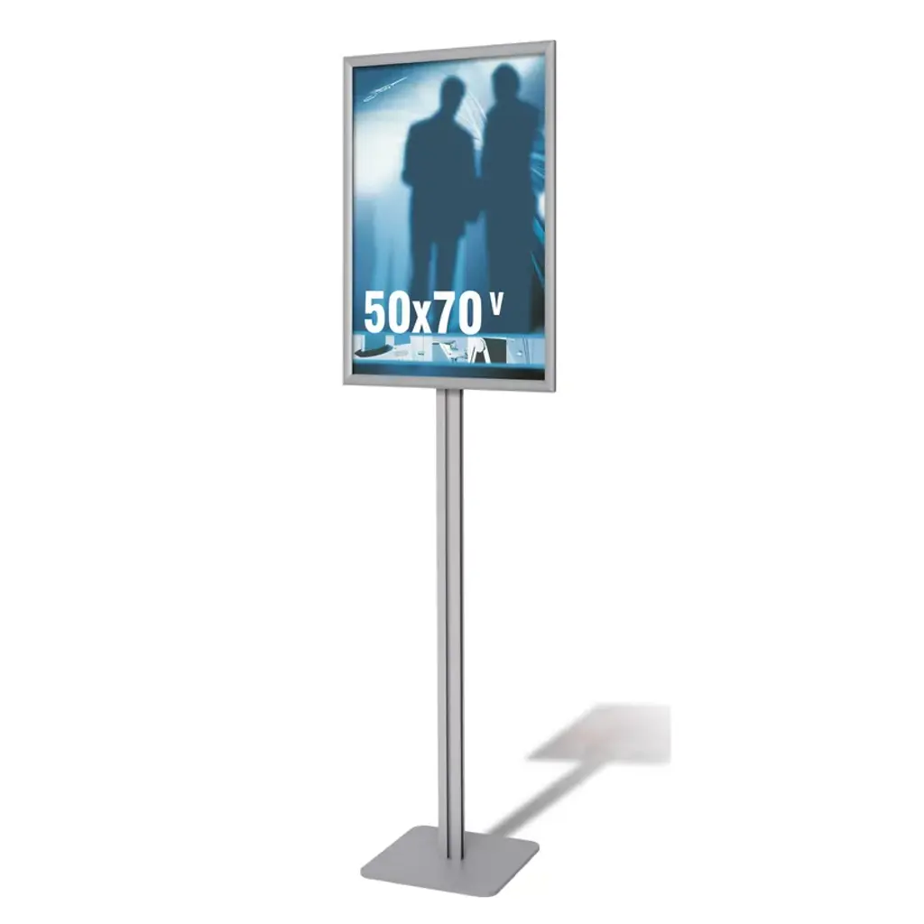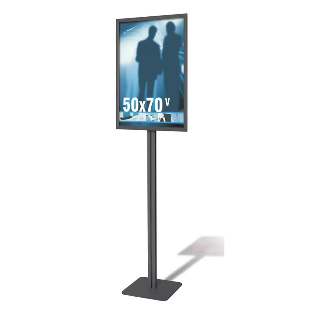 InUno poster stand made with InUno aluminum profile with black finish and 35x35 cm steel base. A black 70x100 snap frame is applied to the structure to insert posters in an easy and fast way. The frame is equipped with a snap profile that allows you to insert the poster and change it whenever you want. We can custom-made this stand with frames available in other formats: A4, A3, 50X70, 70X100, 100X140.InUno is a collection of divider panels, exhibition display panels, notice racks, posters, brochure racks, totems and signage, and lots of solutions. It is a line that is fully configurable in structure, size, colors, and prints to meet different style, space, and brand requirements.