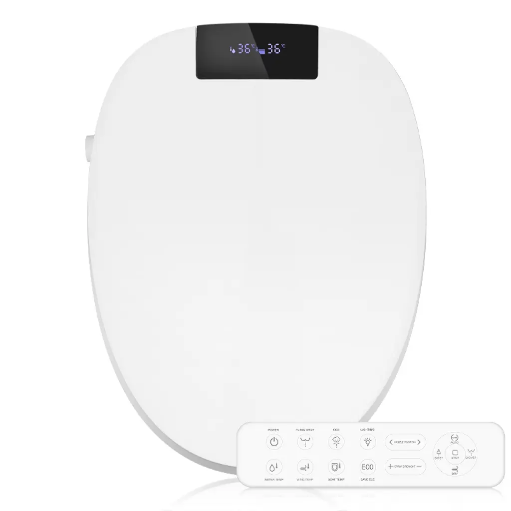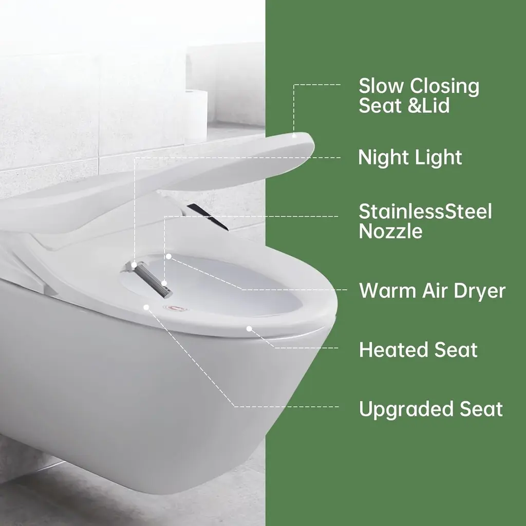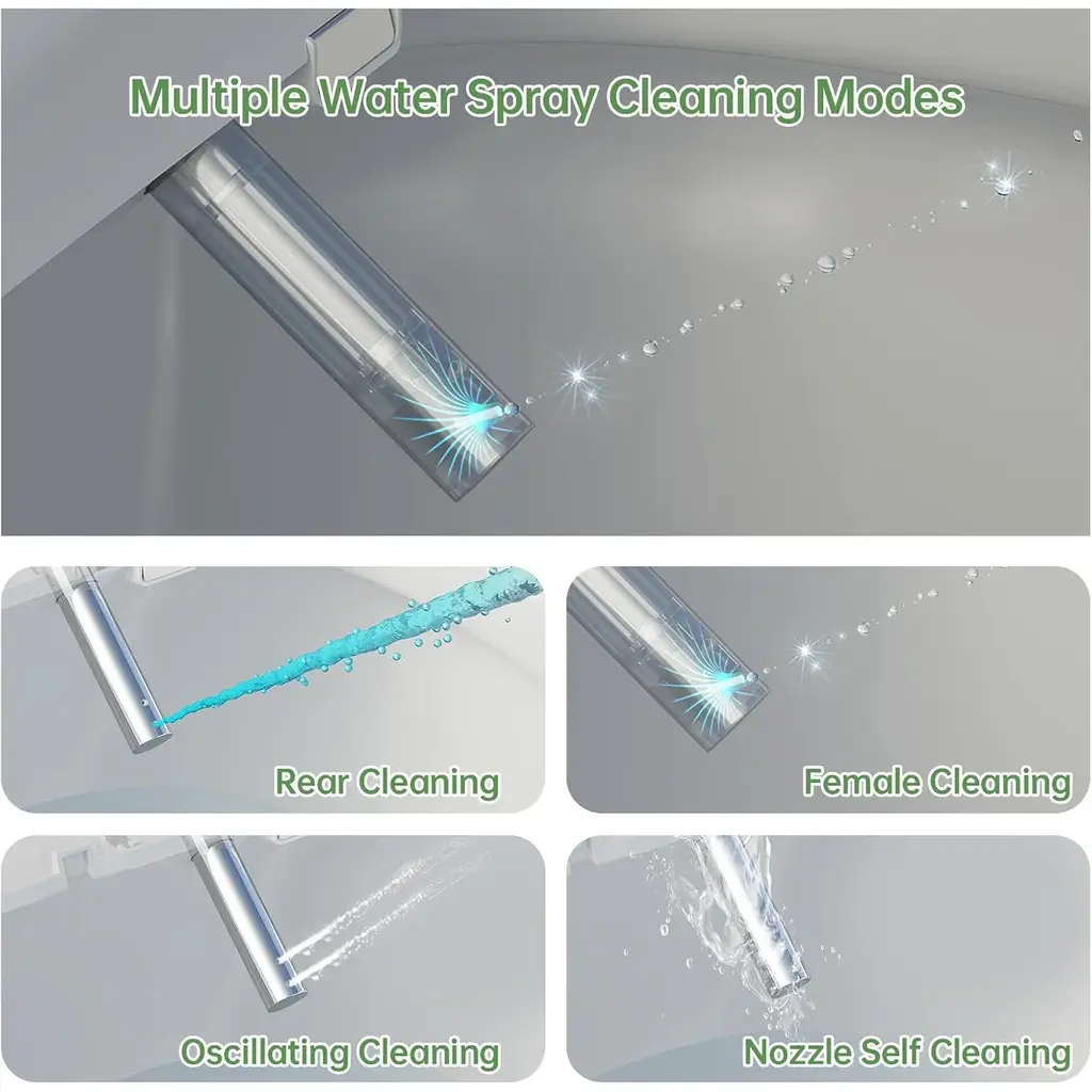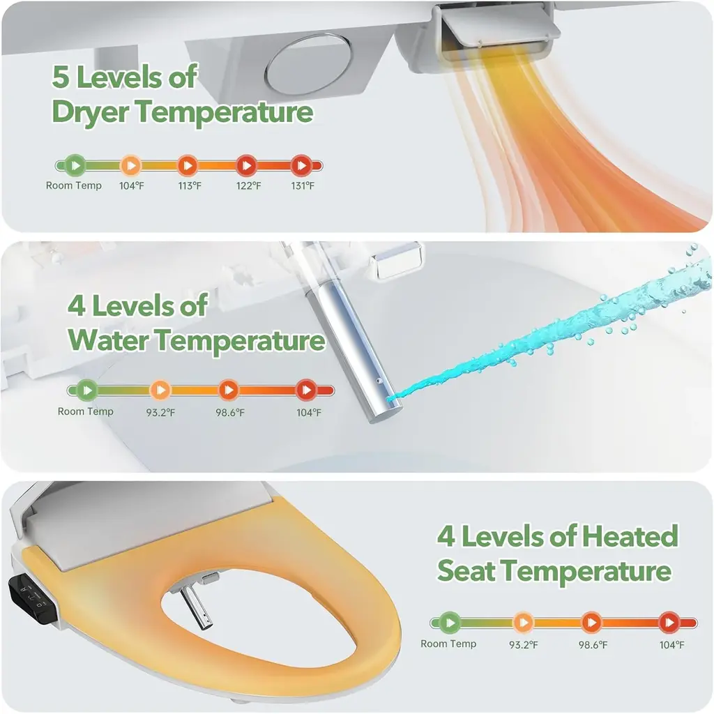 EASY INSTALLATION: Installing your heated bidet toilet seat elongated model is a breeze, with all parts and comprehensive instructions included. You don't need a plumber – the easy DIY installation takes under 30 minutes, granting you immediate access to a world of comfort. Upgrade your bathroom experience today with the ultimate blend of comfort, hygiene, and modern luxury. COMFORT & HYGIENE: With our cutting-edge bidet electric toilet seat, this elongated toilet bidet seat boasts a tankless/direct water system that seamlessly balances gentle yet powerful cleansing, ensuring an effective clean every time. Say goodbye to the worries of dirt, stains, and buildup as our bidet extracts water precisely when needed, enhancing the longevity of your toilet seat. PERSONALIZED WASH: Heated water bidet toilet seat with a remote that lets you tailor your cleansing experience to perfection. With a simple touch, take command of your bidet's heated water and seat temperature settings, offering personalized comfort like never before. Adjust the nozzle position and water pressure to match your preferences, enjoying a refreshing and soothing clean. SANITARY: Crafted with sophistication in mind, our bidet toilet seat elongated design integrates a state-of-the-art stainless steel nozzle. This self-cleaning nozzle not only ensures durability but also resists corrosion and rust, elevating cleanliness to new heights. Embrace the fusion of form and function, where aesthetic appeal meets unrivaled performance. ECO-FRIENDLY DESIGN: Step into a realm of modern living that revolves around luxury and convenience. Our heated bidet toilet seat elongated's soft-close mechanism adds a touch of elegance to any bathroom theme, while its seamless design exudes sleekness. Experience the joy of reducing your ecological footprint and cutting down on expenses, thanks to the eco mode feature that saves both toilet paper and electricity, redefining your daily routine.
