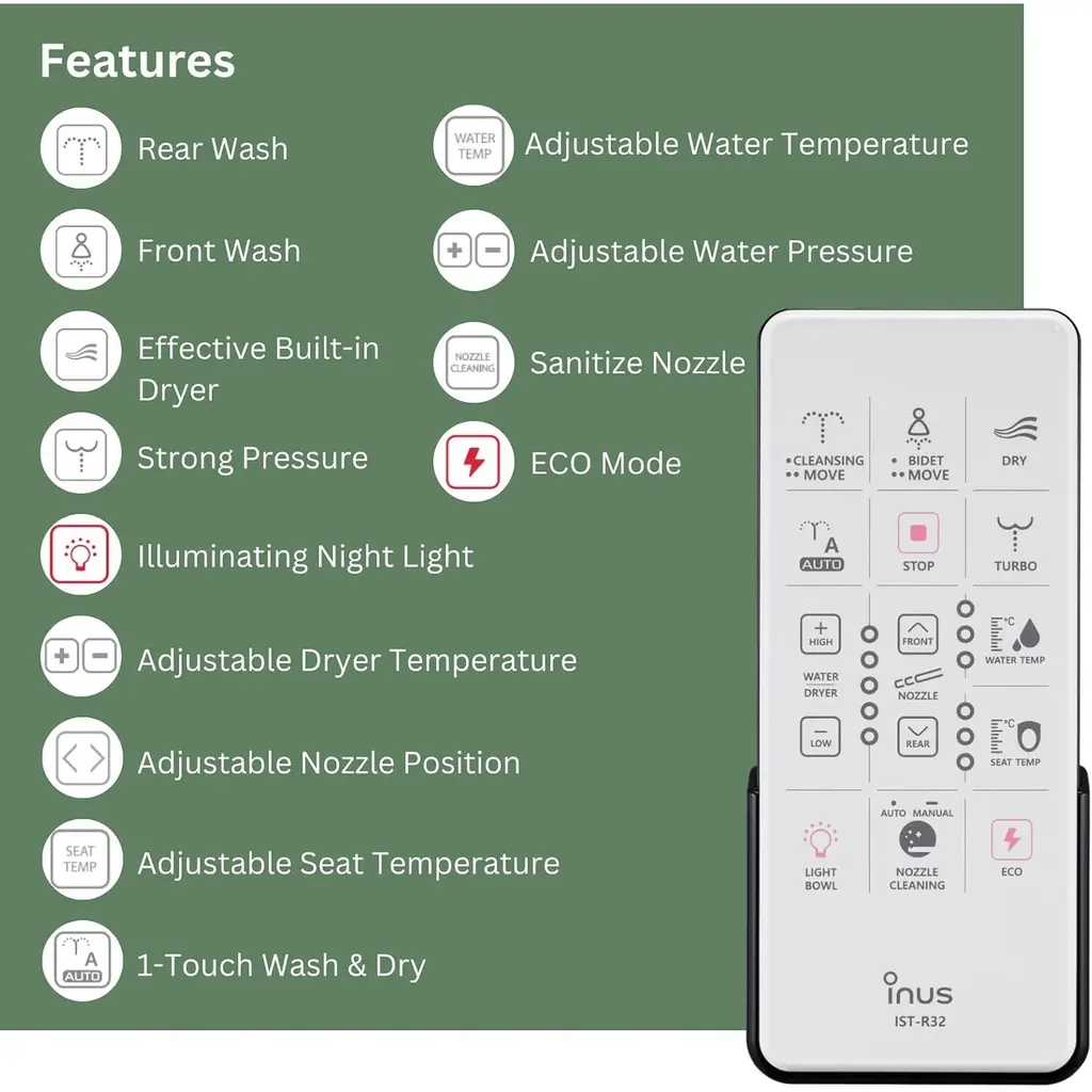 Inus R32 Electric Heated Bidet Elongated Warm Water Bidet Toilet Seat With Remote Control - White