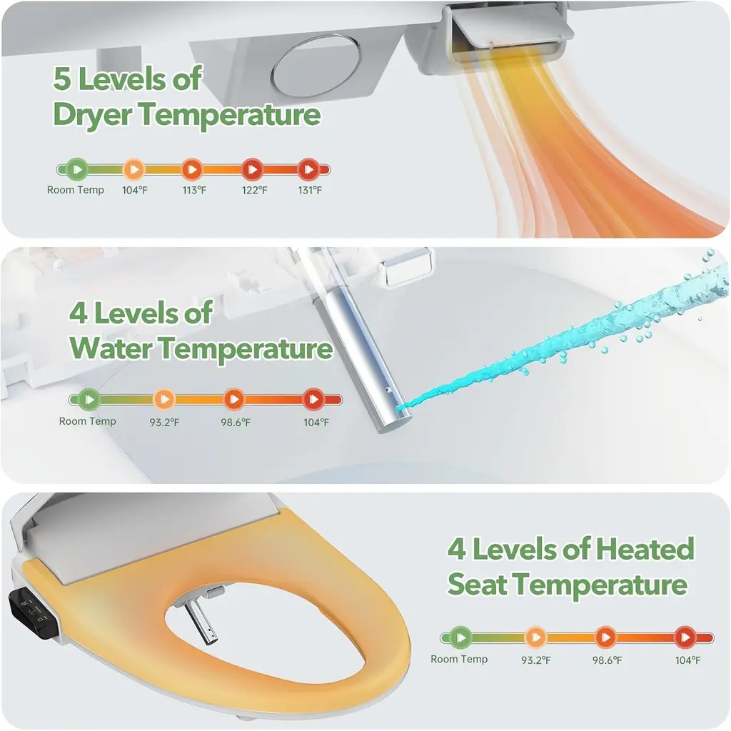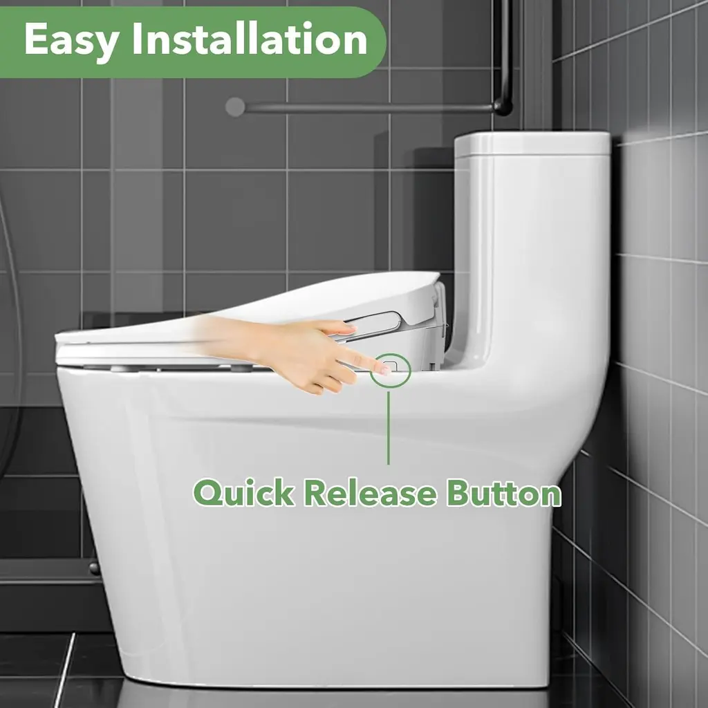 EASY INSTALLATION: Installing your heated bidet toilet seat elongated model is a breeze, with all parts and comprehensive instructions included. You don't need a plumber – the easy DIY installation takes under 30 minutes, granting you immediate access to a world of comfort. Upgrade your bathroom experience today with the ultimate blend of comfort, hygiene, and modern luxury. COMFORT & HYGIENE: Experience the ultimate in comfort, hygiene, and sanitation with our advanced bidet electric toilet seat. Its tankless/direct water system ensures effective, gentle yet powerful cleansing, enhancing your toilet seat's longevity by preventing dirt, stains, and buildup. The elegant design includes a stainless steel, corrosion-resistant nozzle for unmatched cleanliness, seamlessly blending form and function for aesthetic appeal and superior performance. PERSONALIZED WASH: Heated water bidet toilet seat with a remote that lets you tailor your cleansing experience to perfection. With a simple touch, take command of your bidet's heated water and seat temperature settings, offering personalized comfort like never before. Adjust the nozzle position and water pressure to match your preferences, enjoying a refreshing and soothing clean. DRYER: This advanced bidet electric toilet seat with dryer provides the ultimate touch of comfort and cleanliness. Say goodbye to traditional methods and experience the modern convenience of a fully integrated drying system. Elevate your hygiene journey with this innovative addition. Lessen irritation and enhance comfort with the help of the built-in dryer. ILLUMINATE THE DARK: Illuminate Your Path with Subtle Elegance. Experience the added convenience of our bidet electric toilet seat's built-in night light feature. This gentle, ambient illumination offers guidance during late-night visits, enhancing safety and comfort without the need for blinding bathroom lights.