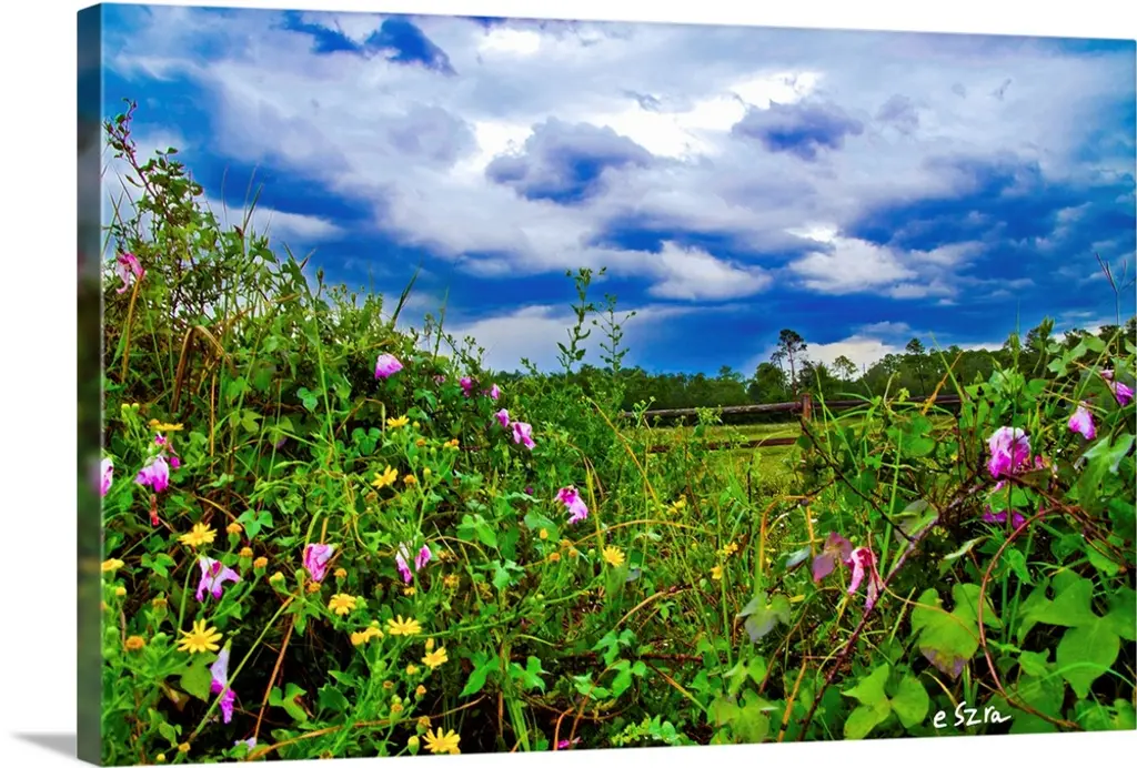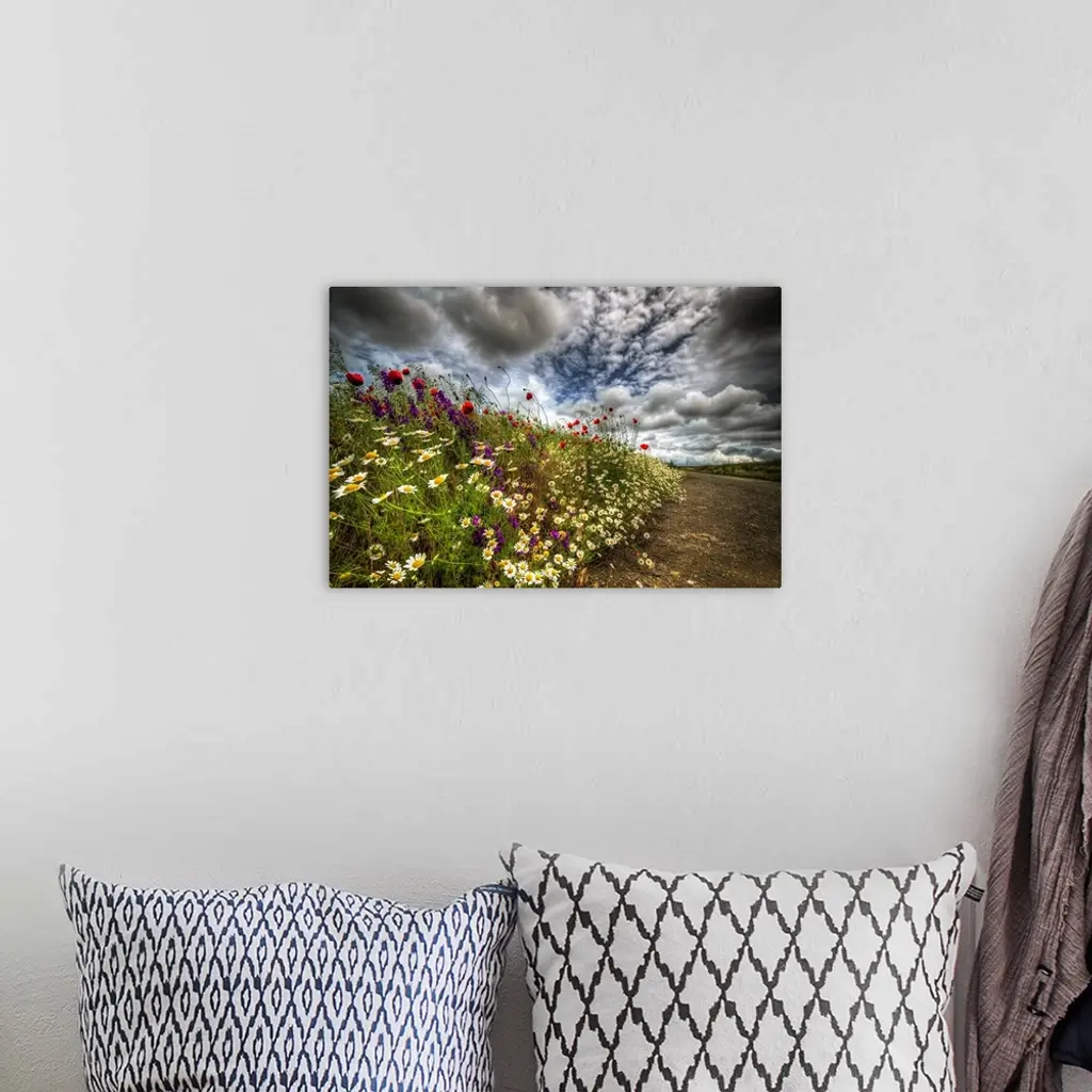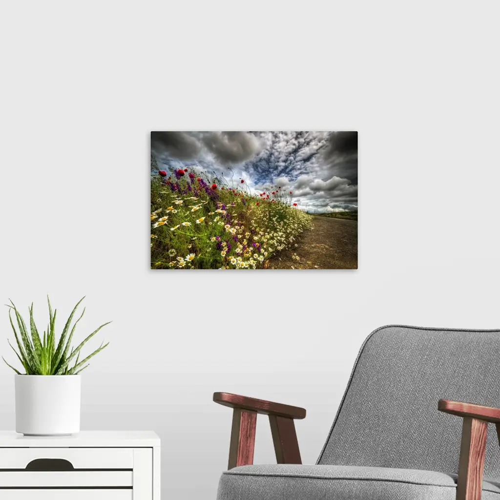 Spring flowers under a cloudy sky.