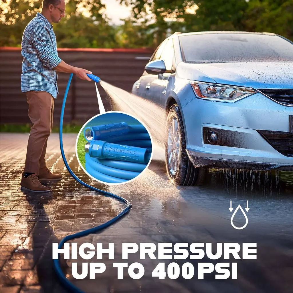 Upgrade your outdoor watering experience with the Invictus Heavy Duty Garden Hose, a high-performance, kink-free hose designed for maximum power and ease. Built with advanced polymer construction and crush-proof anodized aluminum fittings, this hose withstands extreme weather conditions while delivering up to 400 PSI burst pressure. Available in 25, 50, 75, and 100-foot lengths, it's ideal for everything from delicate plant care to car washing and patio cooling. The included 10-function spray nozzle provides the versatility you need for every task. Lightweight yet rugged, this hose is engineered to handle tough jobs while staying easy to carry, maneuver, and store. Whether you're a casual gardener or a DIY outdoor warrior, Invictus delivers power, performance, and convenience all in one. Key Features Reinforced Polymer Body: Crafted from durable polymer material, this hose resists cracks, leaks, and punctures, providing long-lasting performance across seasons. 10-Function Spray Nozzle Included: Comes with an ergonomic spray nozzle offering 10 customizable settings—mist, cone, shower, flat, jet, center, angle, soaker, rinse, and vertical—to tackle any watering task. High Pressure Performance: Built for strength, this hose delivers a powerful water flow with a burst pressure of up to 400 PSI, perfect for heavy-duty jobs like driveway cleaning or car washing. Flexible and Kink-Free: Features a 5/8" outer diameter and 360° rotating spin collar to eliminate kinks, tangles, and twists—ensuring smooth, uninterrupted water flow during use. Lightweight and Easy to Maneuver: Up to 50% lighter than standard rubber hoses, Invictus is easy to carry and coil, making it a practical solution for users of all ages and strengths. Crush-Proof Aluminum Fittings: Equipped with heavy-duty, rust-resistant anodized aluminum connectors that form a tight, leak-proof seal and withstand wear from repeated use.