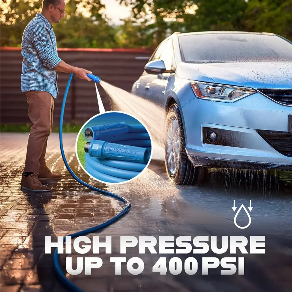The Invictus PRO Heavy Duty Garden Hose is available in both 50-foot and 100-foot lengths to suit any outdoor watering task—from small garden beds to expansive yards. Designed for durability and ease of use, this lightweight and kink-free hose features a 5/8” outer diameter and delivers powerful water flow with up to 400 PSI burst strength. Constructed with a reinforced polymer core and hard anodized aluminum fittings, it resists crushing, coiling effortlessly after each use. The included 10-function spray nozzle adds versatility for gardening, car washing, patio cleaning, and more. Built to withstand extreme heat, cold, rain, or snow, and safe for drinking water, the Invictus PRO hose is your all-season, all-purpose watering solution.