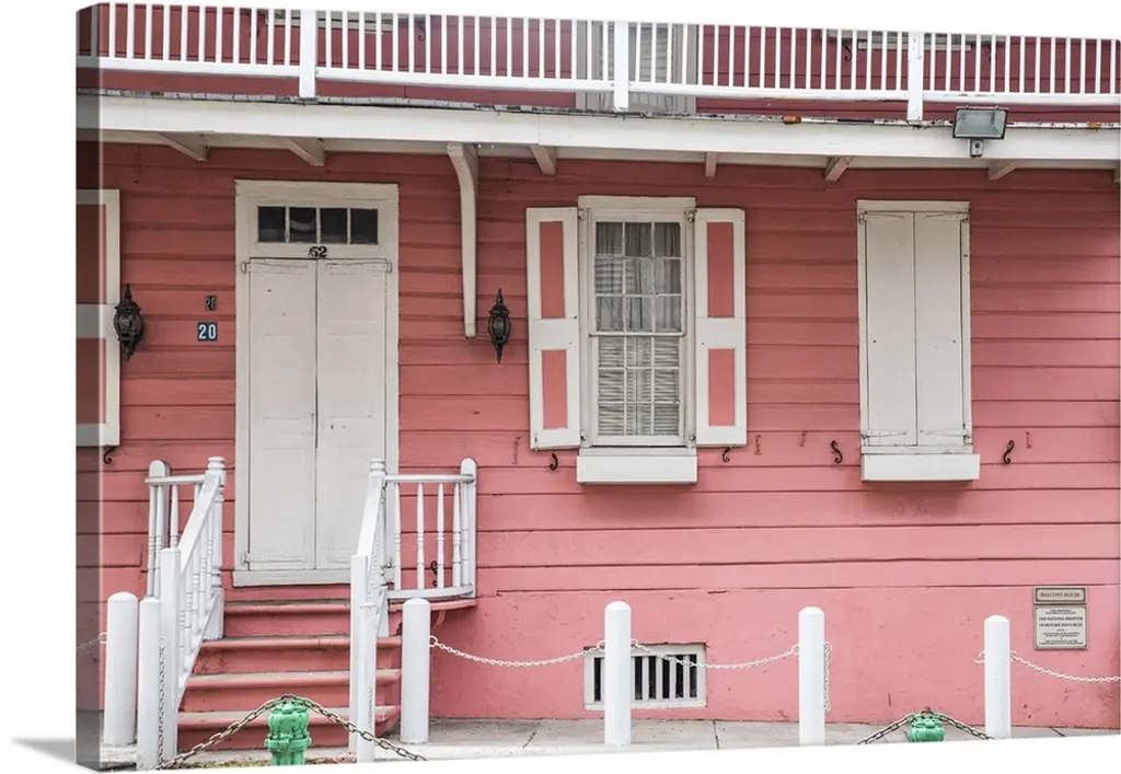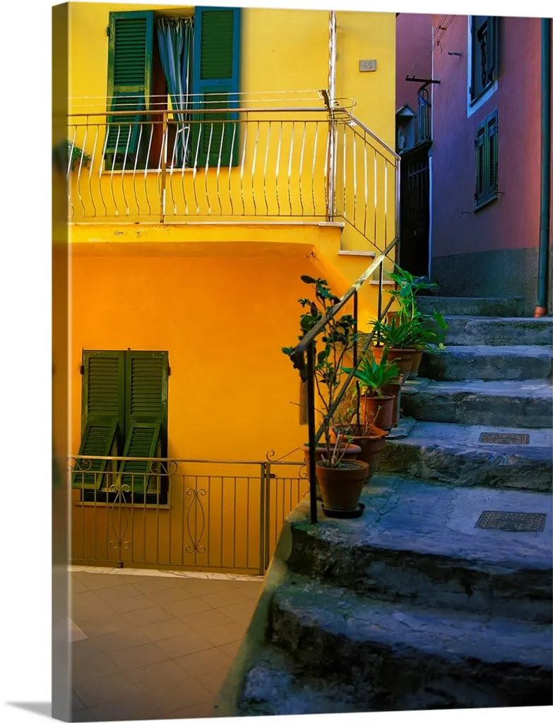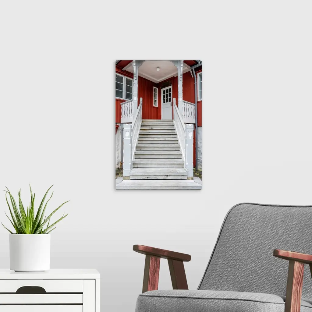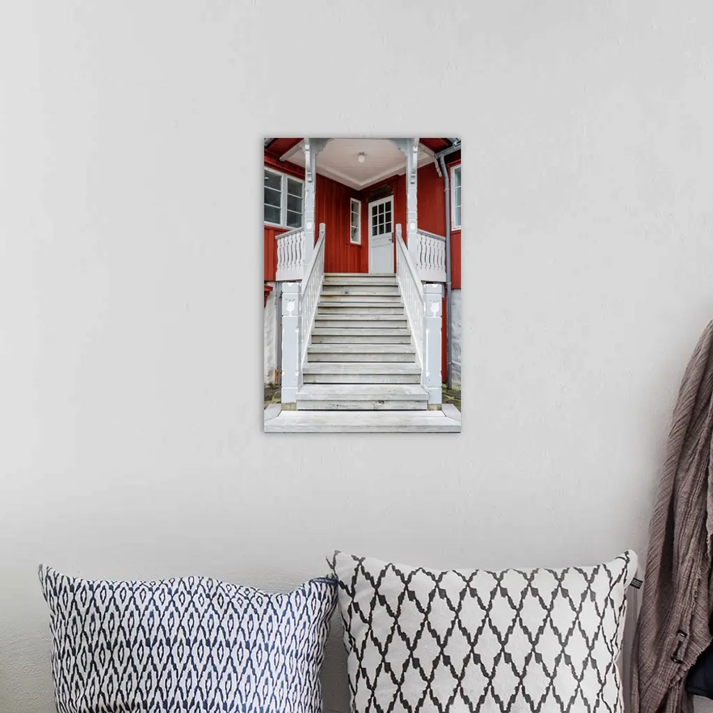 Staircase leading up to the entrance of a red house.