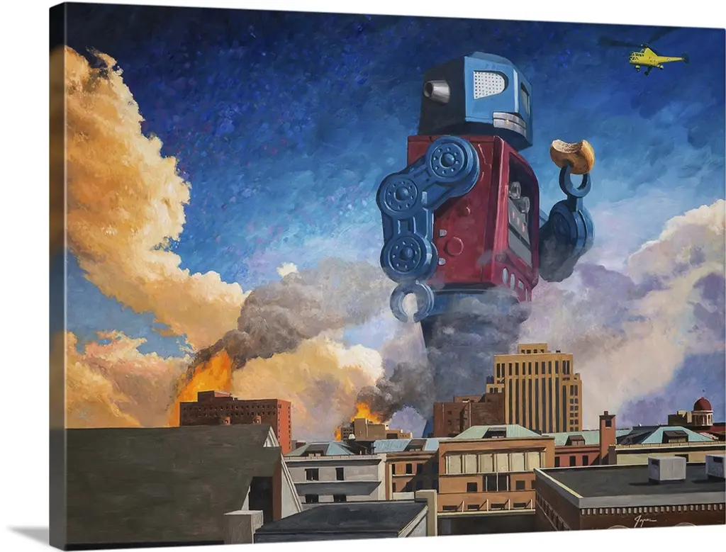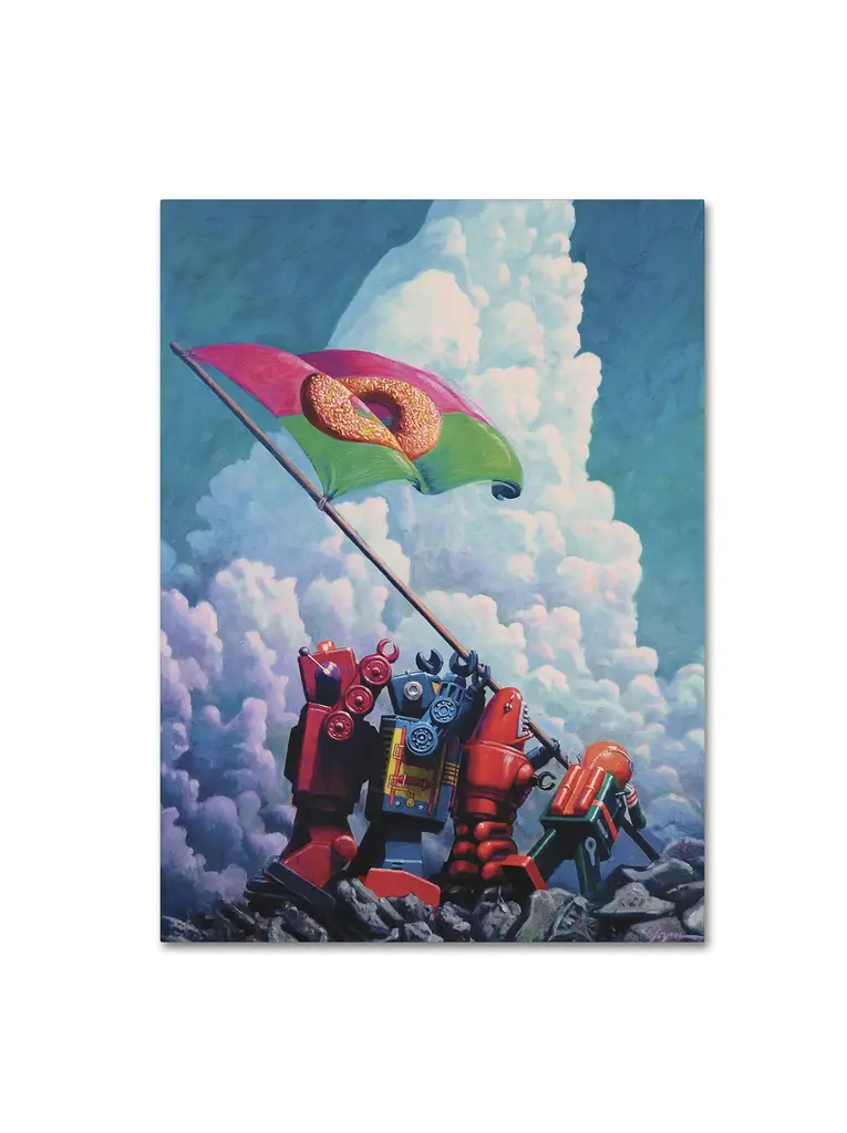 Title: IO JimaArtist: Eric JoynerProduct Type: Canvas ArtSize: 35" x 47"Made in the USA.Eric attended the Academy of Art and the University of San Francisco, and went on to establish himself as a commercial artist, creating illustrations for Mattel Toys, Levi's, Microsoft, and Showtime. A member of both San Francisco's and New York's Society of Illustrators, Joyner is an instructor and speaker at several California institutions. His work has been featured in museums, galleries, and cultural institutions worldwide.This 35" x 47" canvas art is ready to hang. Giclee (jee-clay) is an advanced printmaking process for creating high quality fine art reproductions. The attainable excellence that Giclee printmaking affords makes the reproduction virtually indistinguishable from the original piece. The result is wide acceptance of Giclee by galleries, museums, and private collectors. Gallery wrap is a method of stretching an artist's canvas so that the canvas wraps around the sides and is secured to a hidden, wooden frame. This method of stretching and preparing a canvas allows for a frameless presentation of the finished print.