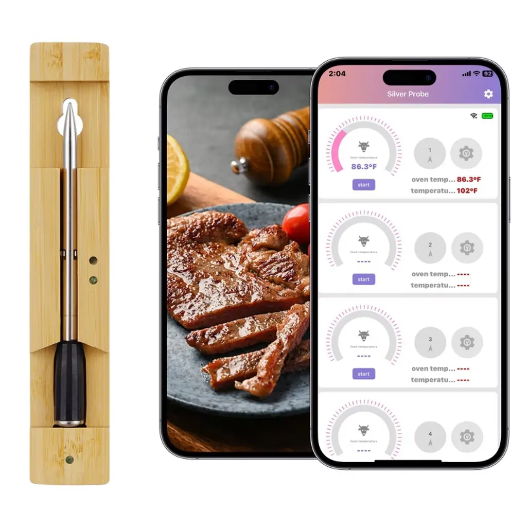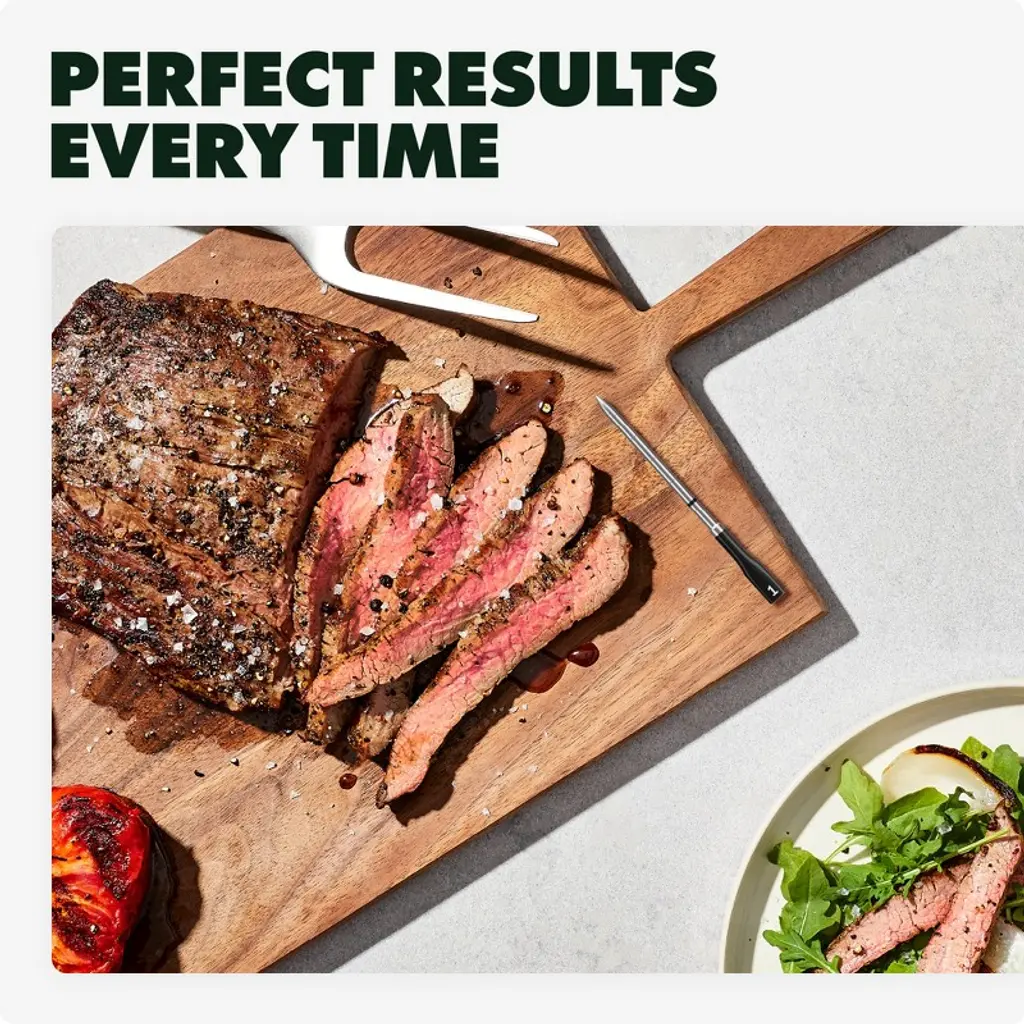 The ultra-thin iQ Sense smart oven and grill thermometer uses an advanced algorithm to calculate precise cooking times and temperatures for perfectly cooked meat, every time. It’s designed for incredible accuracy within 1°F. With hundreds of chef-developed recipes and presets to choose from, you can grill off everything from steak to chicken to salmon. This new version of the smart probe comes equipped with a 4.75” long design to ensure perfect BBQ brisket, and an additional internal sensor for upgraded accuracy. This Bluetooth meat thermometer digital displays real-time alerts and updates directly on your smart device via the CHEF iQ App, along with Smart Hub audio reminders to flip, baste, or remove from heat. Don’t be afraid to turn up the temperature; the iQ Sense is engineered to endure heat up to 1000°F. Unlimited wireless range and long battery life offer the ultimate convenience; you can get up to 70 hours of usage on a full charge. Be sure to impress at every barbecue and make cooking look easy with the iQ Sense.