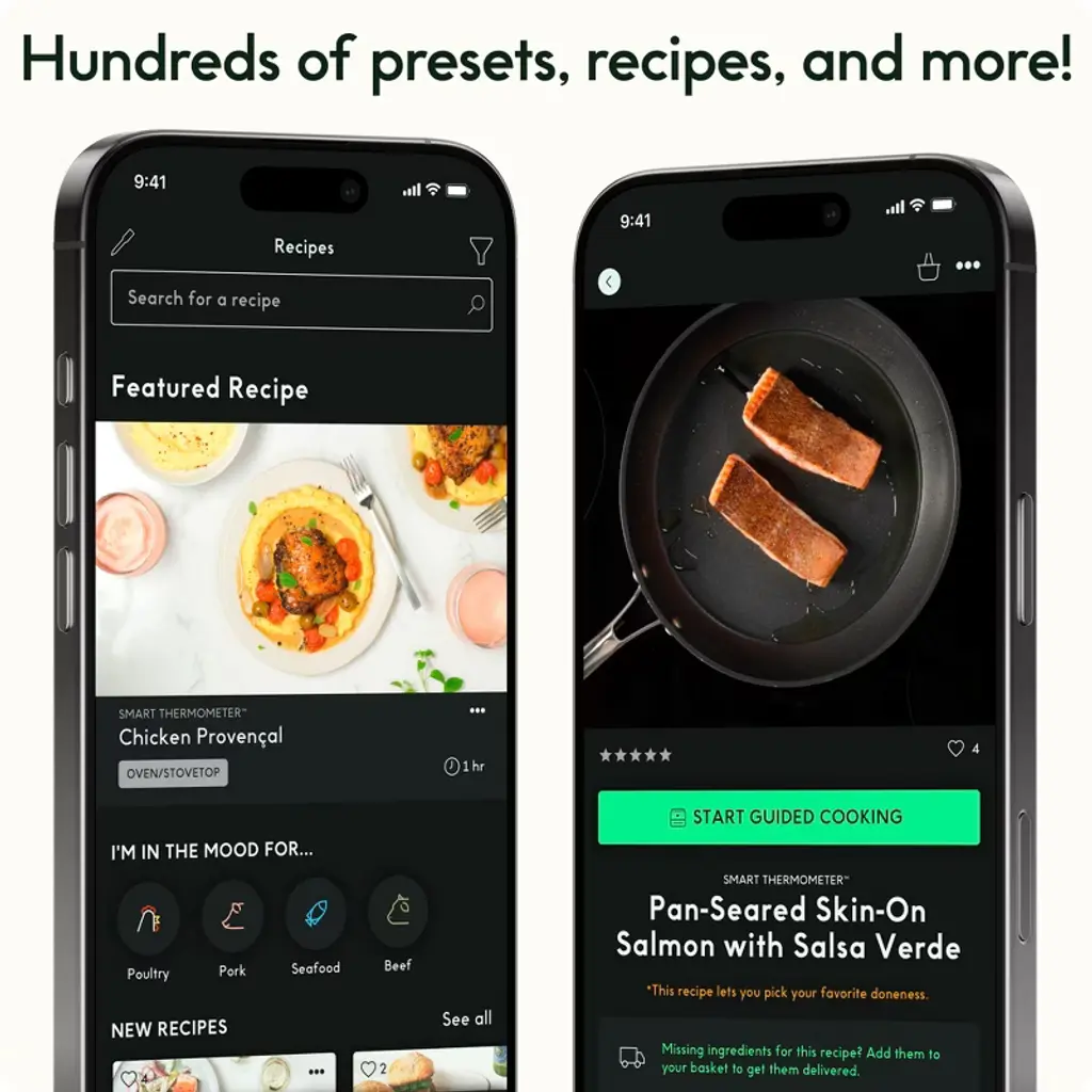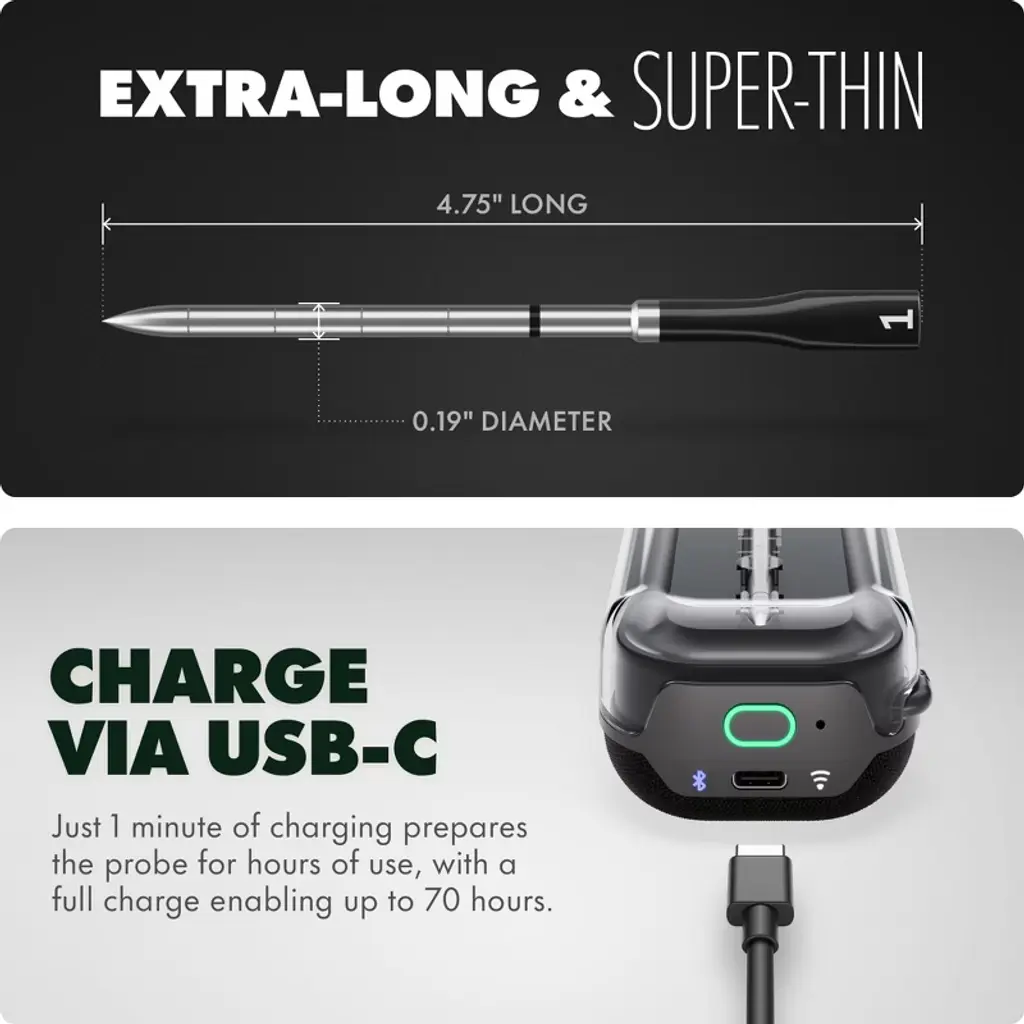 The ultra-thin iQ Sense smart oven and grill thermometer uses an advanced algorithm to calculate precise cooking times and temperatures for perfectly cooked meat, every time. It’s designed for incredible accuracy within 1°F. With hundreds of chef-developed recipes and presets to choose from, you can grill off everything from steak to chicken to salmon. This new version of the smart probe comes equipped with a 4.75” long design to ensure perfect BBQ brisket, and an additional internal sensor for upgraded accuracy. This Bluetooth meat thermometer digital displays real-time alerts and updates directly on your smart device via the CHEF iQ App, along with Smart Hub audio reminders to flip, baste, or remove from heat. Don’t be afraid to turn up the temperature; the iQ Sense is engineered to endure heat up to 1000°F. Unlimited wireless range and long battery life offer the ultimate convenience; you can get up to 70 hours of usage on a full charge. Be sure to impress at every barbecue and make cooking look easy with the iQ Sense.