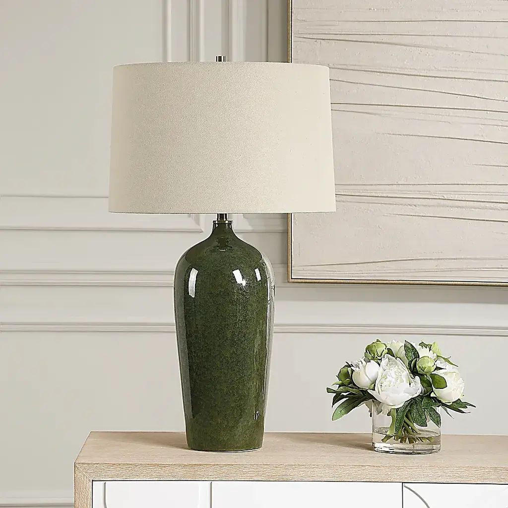 A perfect blend of contemporary style and timeless charm, the Ira Home Green Lamp is finished in a distressed emerald green glaze, with antique brass accents complementing the beautiful finish. This simple but elegant silhouette is topped with a slightly tapered shade in a light beige linen fabric. Partial assembly may be required.