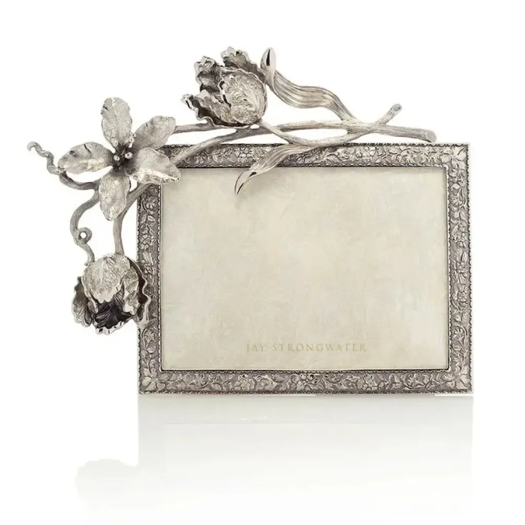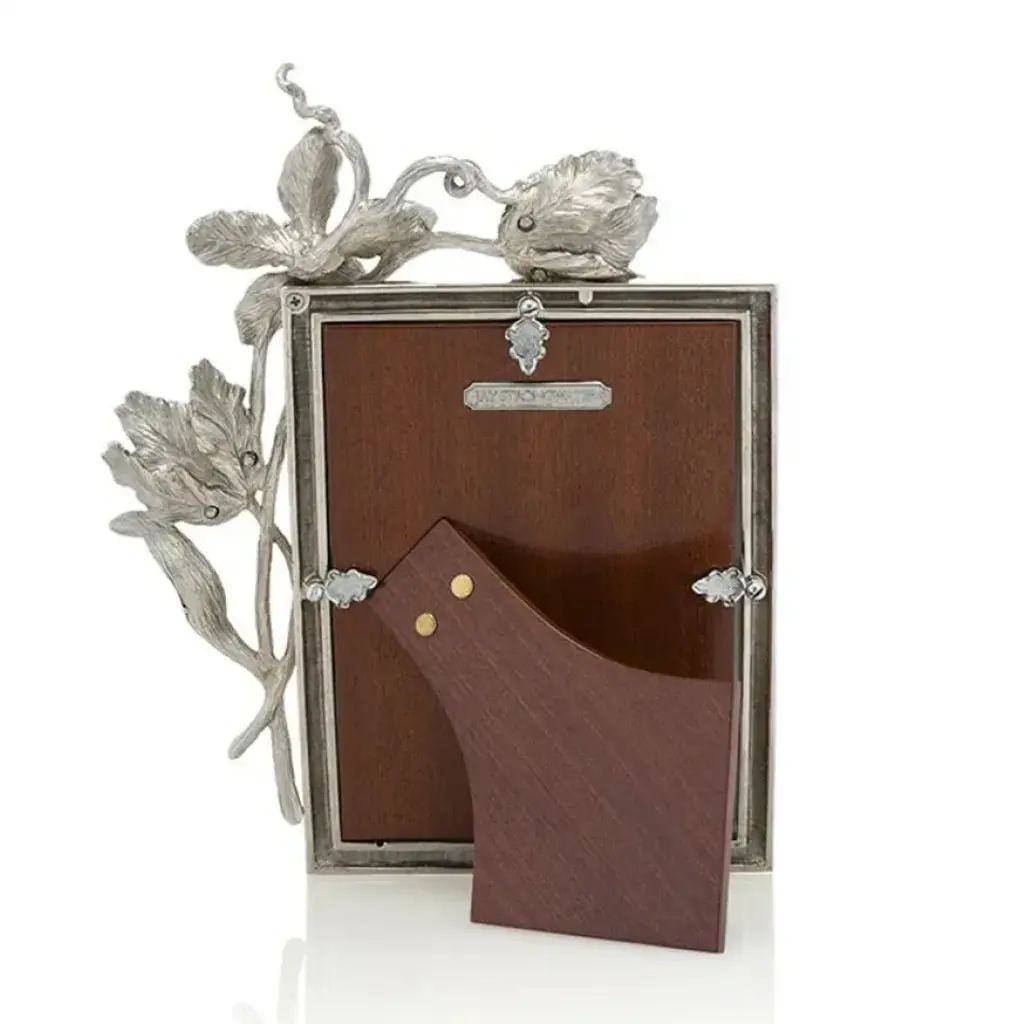 In the Composition collection, we set aside our enamels and crystals allowing the natural beauty of the carved metals to shine through. A spring bouquet of tulips and lilies wrap around the stunning Irene floral engraved frame. Each blossom in this bouquet is hand crafted into a full dimensional carving. Casted in pewter and hand-polished to a silver tone finish by our master artisans in Rhode Island. This Irene frame is complete with a mahogany finished wood back plate and kick stand allowing it to stand vertically or horizontally.