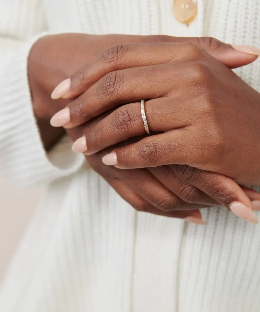 Iris Eternity Band Gold Nothing completes an outfit like an heirloom-quality piece of jewelry. Inspired by vintage pieces in Jenni’s own collection, this edited assortment of fine jewelry aims to add an air of understated investment to your everyday. Made with an understated sensibility and intentional aesthetic, each piece is designed to serve as a thoughtful addition to your daily uniform—one that you will treasure for seasons to come. Please note, there is a 7-10 day lead time for this ring. 14k solid gold band with square diamonds. Made in Los Angeles. Stamped with the Jenni Kayne logo inside, plus hand-polished and finished for added luxury. Features certified no conflict diamonds from Canada, South Africa, Botswana, and Namibia and recycled gold. Jenni Kayne Jewelry is not eligible for promotions.