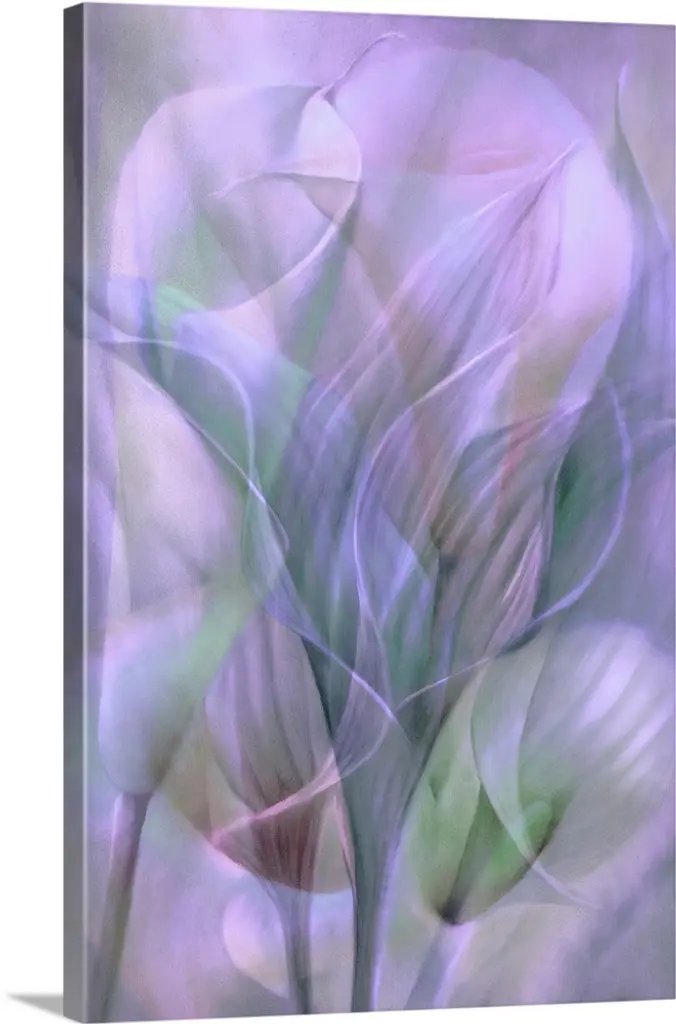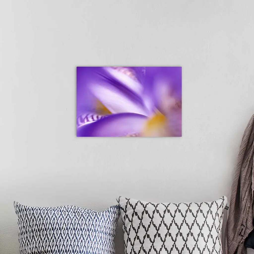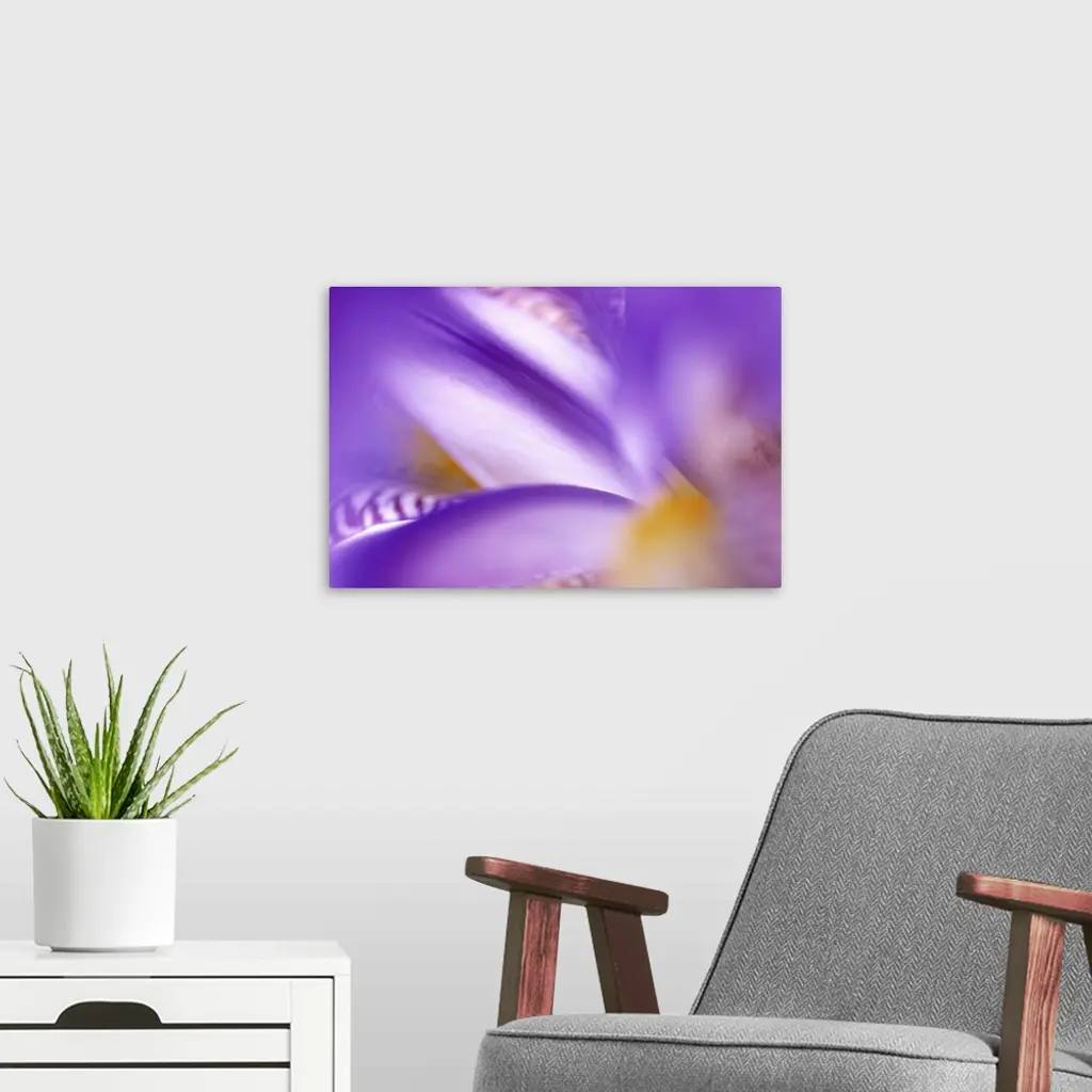 Horizontal, large, close up photograph of an iris flower, heavily blurred toward the outer edges.