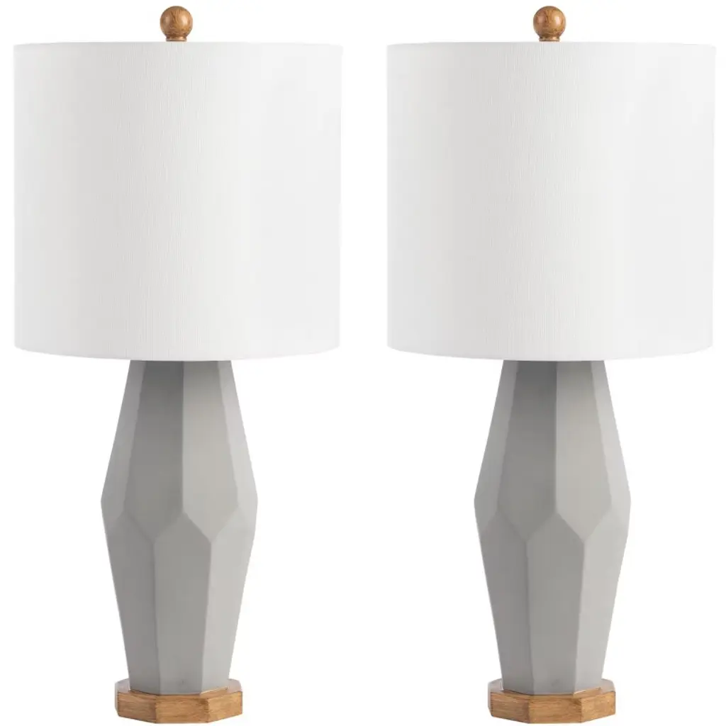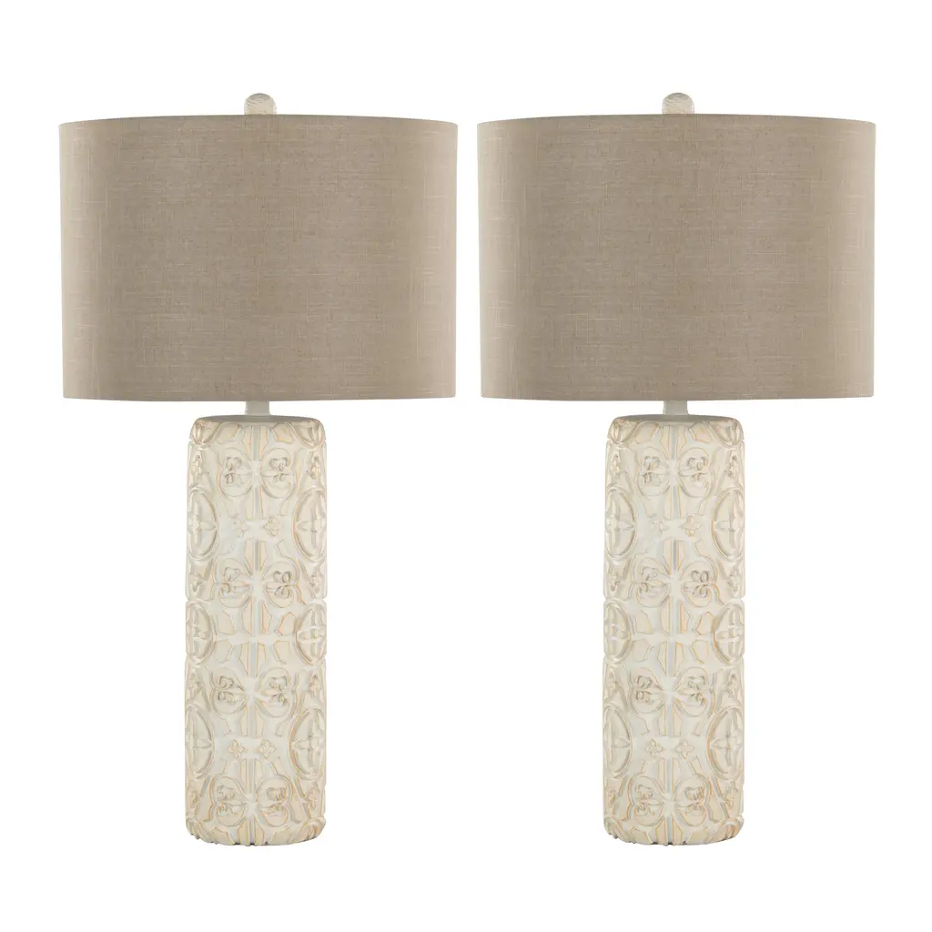 Add eye-catching style to your space with the gorgeous Iris Nest Off-White Lamp, Set of 2. The cylindrical polyresin base features an intricately carved pattern, a matching finial, and a linen drum shade. Partial assembly may be required.