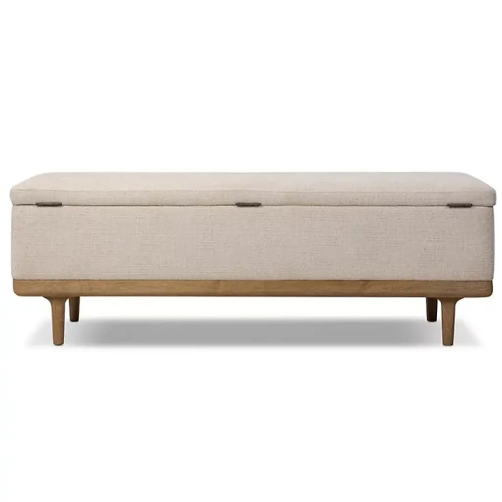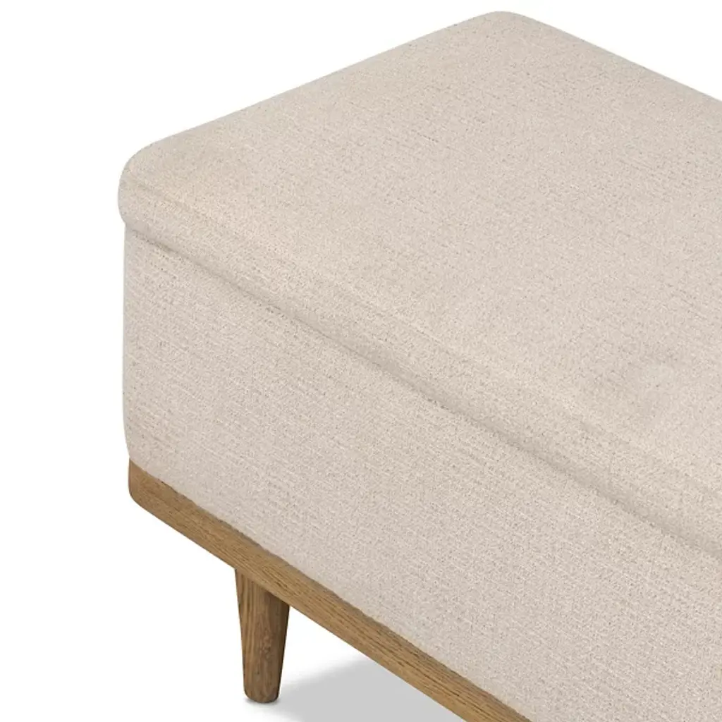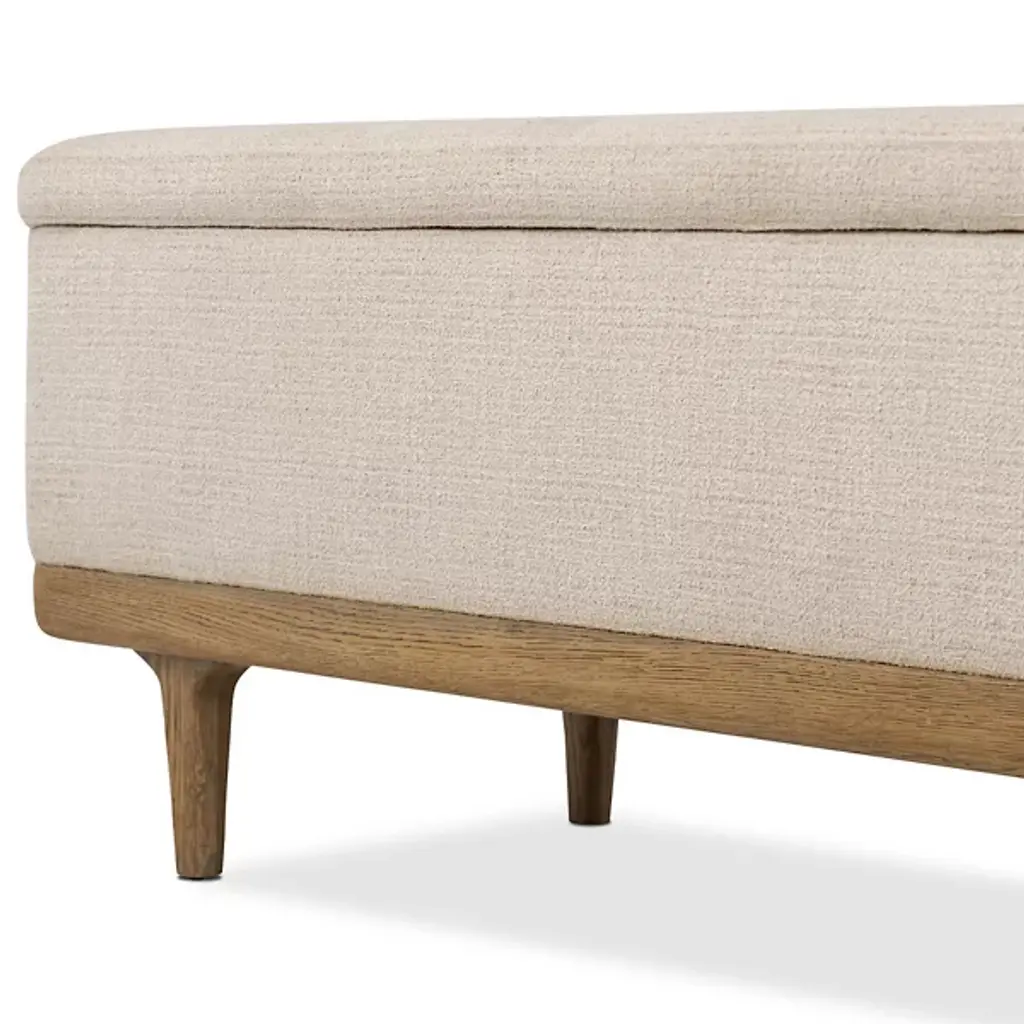 The Iris Trunk from Four Hands wraps textural cream performance fabric around a solid oak frame elevated on tapered legs with art deco-inspired curves. This dual-purpose piece functions as both a storage trunk and additional seating, with a hinged top revealing a spacious interior compartment for linens and bedding. The worn oak finish on the wooden base contrasts with the soft fabric upholstery, while performance textile technology resists stains and wear. This trunk bridges practical storage needs with refined aesthetics, where the curved leg details add visual interest to an otherwise low-profile form.
