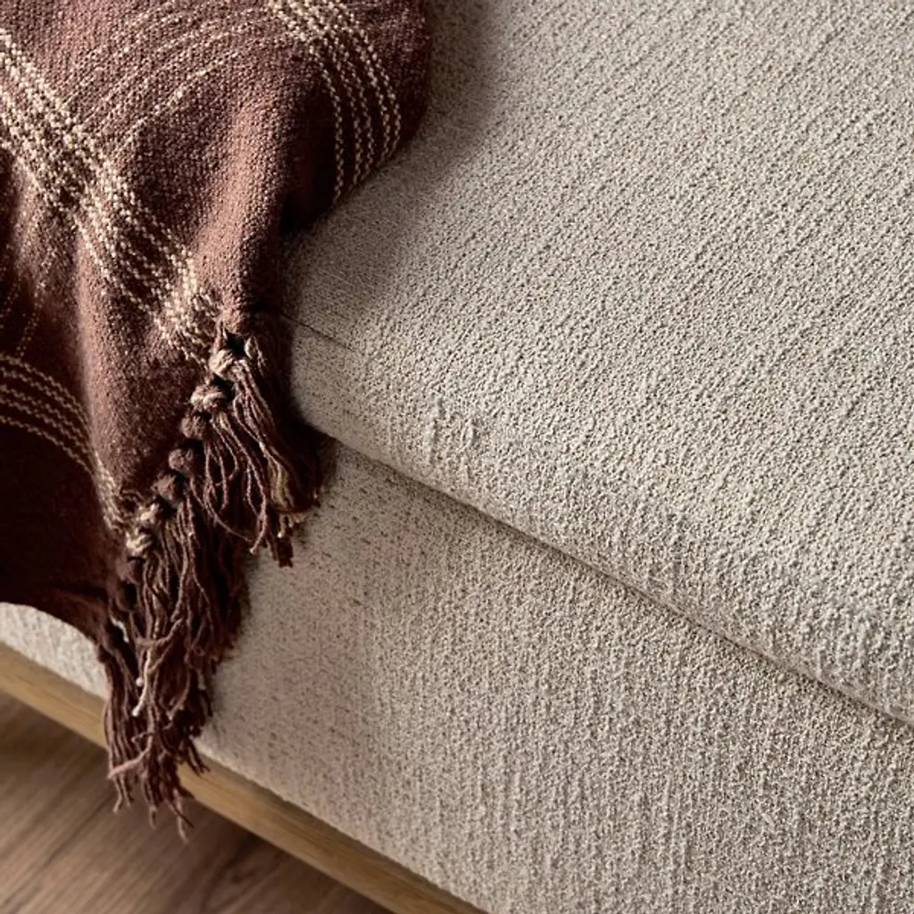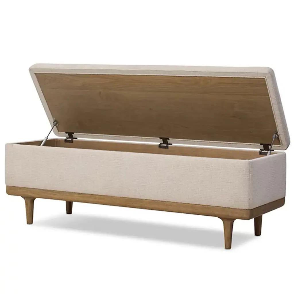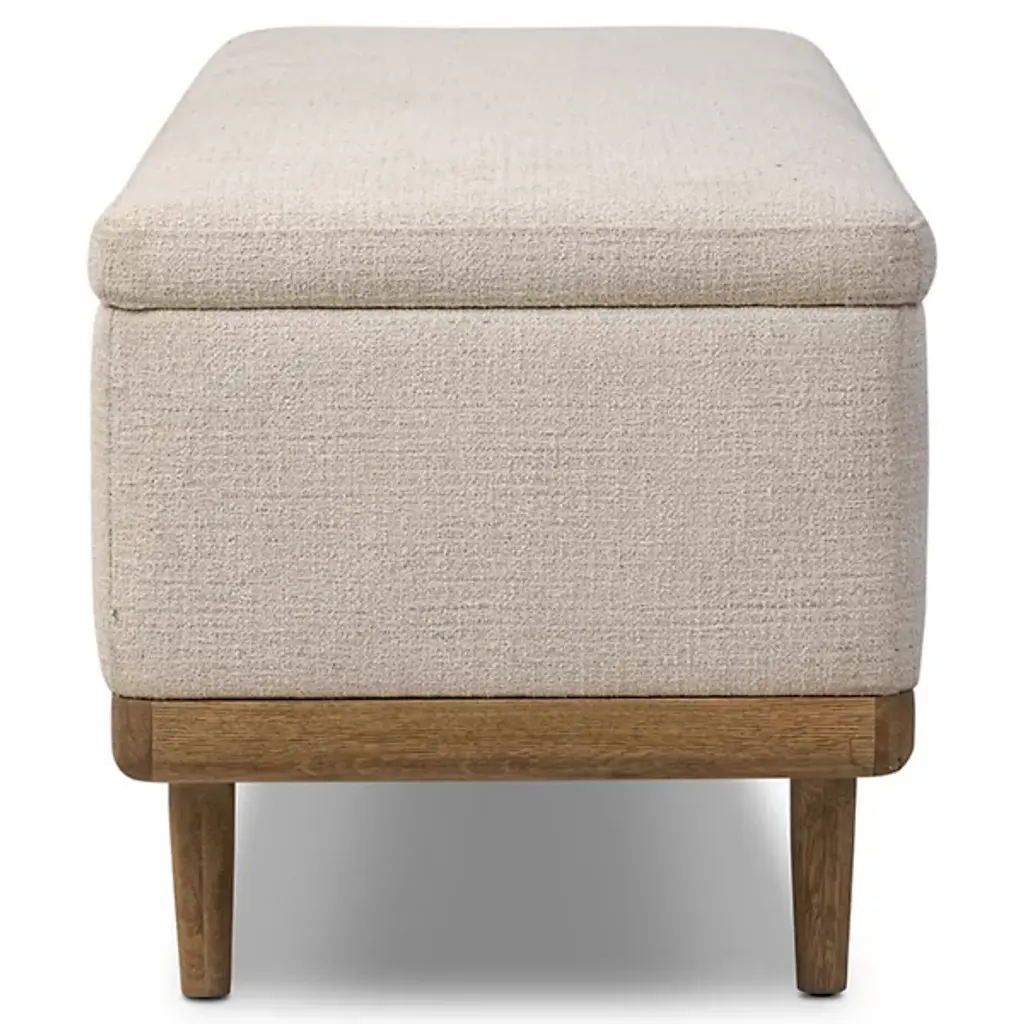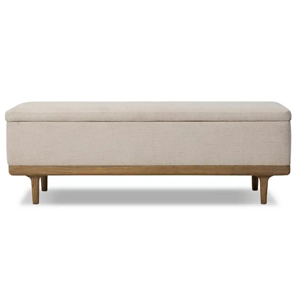 The Iris Trunk from Four Hands wraps textural cream performance fabric around a solid oak frame elevated on tapered legs with art deco-inspired curves. This dual-purpose piece functions as both a storage trunk and additional seating, with a hinged top revealing a spacious interior compartment for linens and bedding. The worn oak finish on the wooden base contrasts with the soft fabric upholstery, while performance textile technology resists stains and wear. This trunk bridges practical storage needs with refined aesthetics, where the curved leg details add visual interest to an otherwise low-profile form.