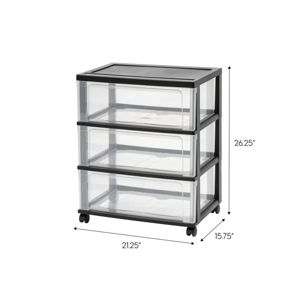 Tackle clutter and disorganization with the IRIS USA plastic wide drawer chest! This portable storage solution allows you to quickly access contents with the easy-pull drawers, and the built-in drawer-stops prevent the drawers from falling out when opened. Featuring removable caster wheels, you can use this drawer cart as an easy way to transport many things between rooms or create a more permanent, stationary storage solution for your space; the choice is yours! Thee drawers are perfect for everything, from clothing to linens, toys to craft and hobby supplies and more. Let's make life a little easier.GREAT SIZE - Dimensions: 15.75"L x 21.25"W x 25.94"H