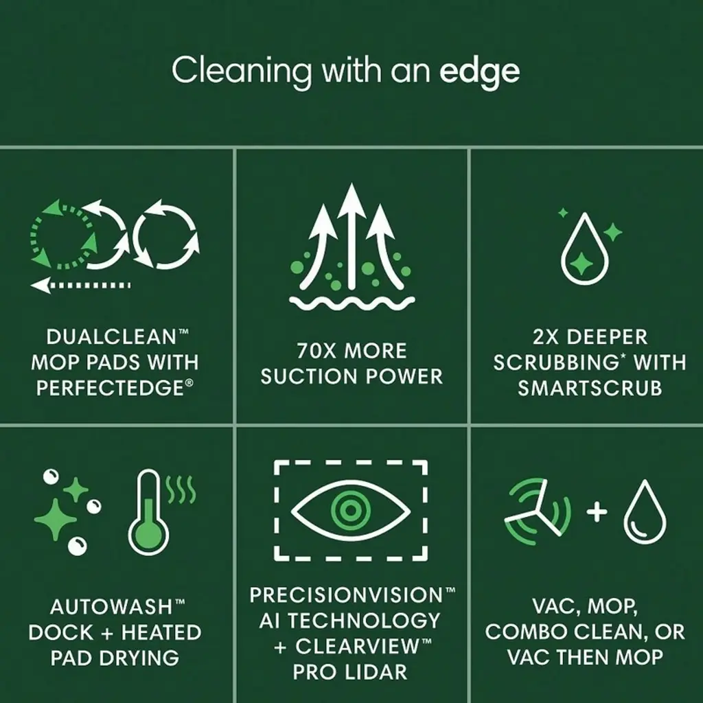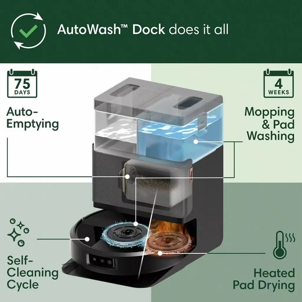 The Roomba® Plus 505 Combo Robot + AutoWash™ Dock delivers detailed cleaning with an edge. DualClean™ Mop Pads with PerfectEdge® extends the mop pad 18% closer to edges. Dynamic dock auto-empties debris, refreshes mop pads during mopping, then washes and heat-dries pads, and self-cleans when done to keep everything fresh. Product Highlight: Powerful vacuuming, deep-scrub mopping DualClean™ Mop Pads with PerfectEdge® Auto-empties debris, washes & heat-dries pads PrecisionVision™ AI Technology + ClearView™ Pro LiDAR Product Feature: Deep down and wall-to-wall Advanced DualClean™ Mop Pads with PerfectEdge® extend floor-mopping coverage by 18%1 and SmartScrub adds 2x deeper scrubbing2 to wipe out tough messes. Strong Suction. Serious Mopping. Devours messes from crumbs to pawprints with 70x more suction3, DualClean™ Mop Pads with PerfectEdge®, SmartScrub, a multi-surface rubber brush, and edge-sweeping brush. ClearView™ Pro LiDAR Expertly maps your home to maximize coverage and clean thoroughly, day or night. Plus, specialized sensors ensure Roomba® robot won't take a tumble down stairs. PrecisionVision™ AI Technology Immediately recognizes cords, socks, even pet waste, and swiftly navigates around them. Identifies wet & dry messes ahead and repeats cleaning passes for a more thorough clean. AutoWash™ Dock does it all 75 days of auto-emptying, 4 weeks of mopping and pad washing5, continuous pad refreshing, and heated pad drying ensure an ultra-effective clean day after day. Get the right clean Choose to vacuum, mop, combo clean, or vacuum first then mop. Intuitive mop pads auto-lift when sensing carpet ahead for seamless multi-surface cleaning. New Roomba® Home app Clean with precision by choosing specific rooms or zones, 4 levels of suction, repeat cleaning passes in high-traffic areas, or extra scrubbing with SmartScrub to tackle tough messes. Puts data on dirt to good use Knows exactly which rooms get dirty fastest, prioritizes where to clean and auto-selects the right settings to give them the deep clean they need. Cleans on command Pair with Alexa, Siri, or Google Assistant-enabled devices6 and schedule a future cleaning, or simply tell it to vacuum the living room, combo clean the kitchen or over by the couch. Blends in Beautifully Inspired by modern design with beautiful finishes and textures, this sleek looking robot and dock blend easily with any home décor.