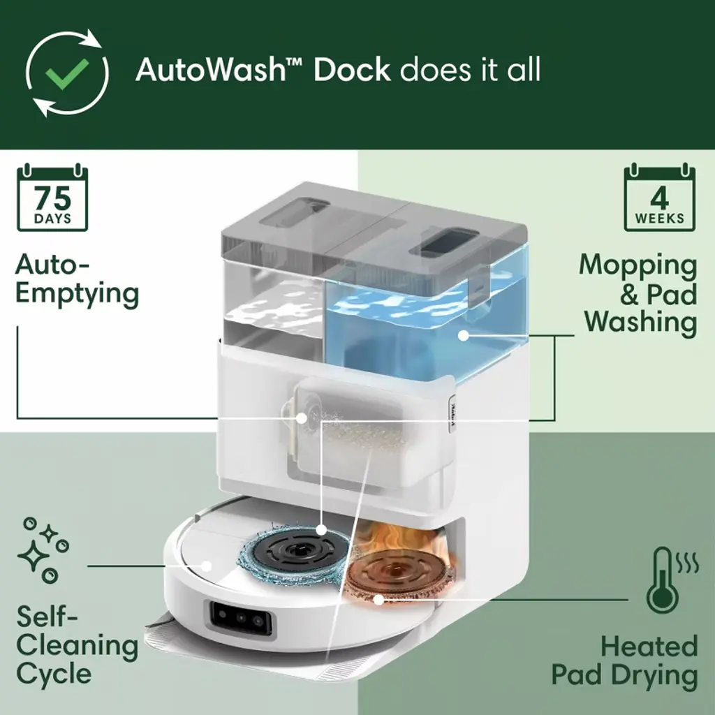 All you need in one powerful robot, the Roomba® Plus 505 Combo Robot + AutoWash™ Dock deliver hands-free, detailed cleaning with remarkable reach. DualClean™ Mop Pads with PerfectEdge® extends the mop pad 18% closer* to edges, and SmartScrub scours 2x deeper**. Vacuum with 70x more intense suction***, Carpet Boost, Multi-surface Rubber brush, and Edge-Sweeping Brush to extract and eliminate dust and debris. Dynamic dock auto-empties debris, refreshes mop pads during cleaning, then washes and heat-dries them, and self-cleans so that the dock starts clean and ends clean. *Compared to unextended DualClean™ Mop Pad **Compared to standard vacuum & mop mode on coffee & grime***Compared to Roomba® 600 series robots