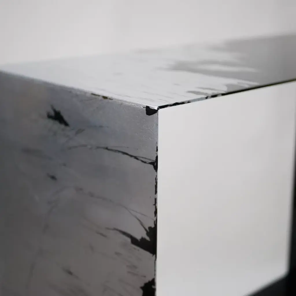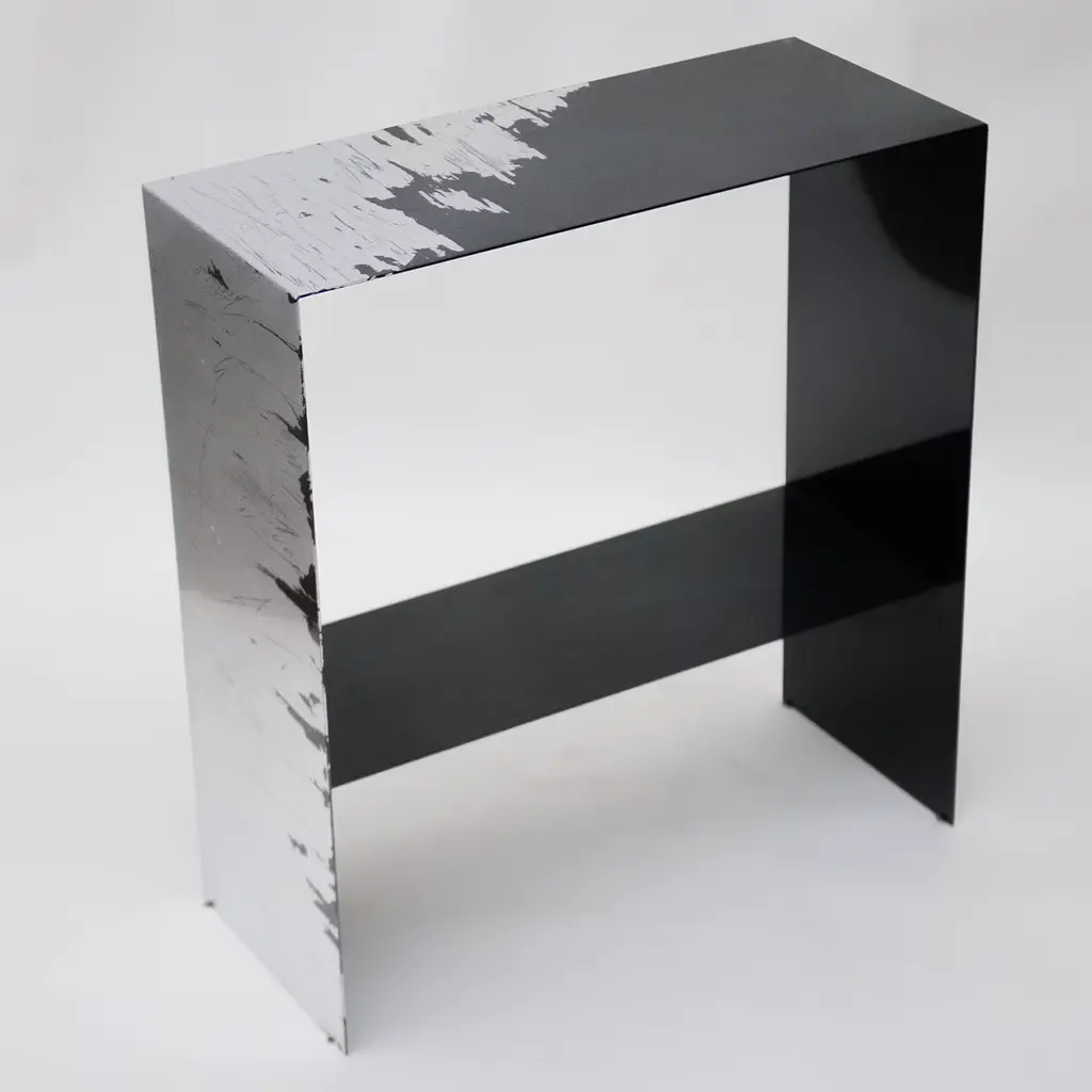 Inspired by contemporary art, this breath-taking console handcrafted from iron is the epitome of industrial-chic style. Its silhouette is marked by clean lines and enhanced by polyester-based, transparent varnishes that lend it a characteristic shimmering appearance. A band of prized silver leaf marked by a scratched look adds luxe flair to the whole, while still maintaining the design's artistic and sculptural inspiration untouched.