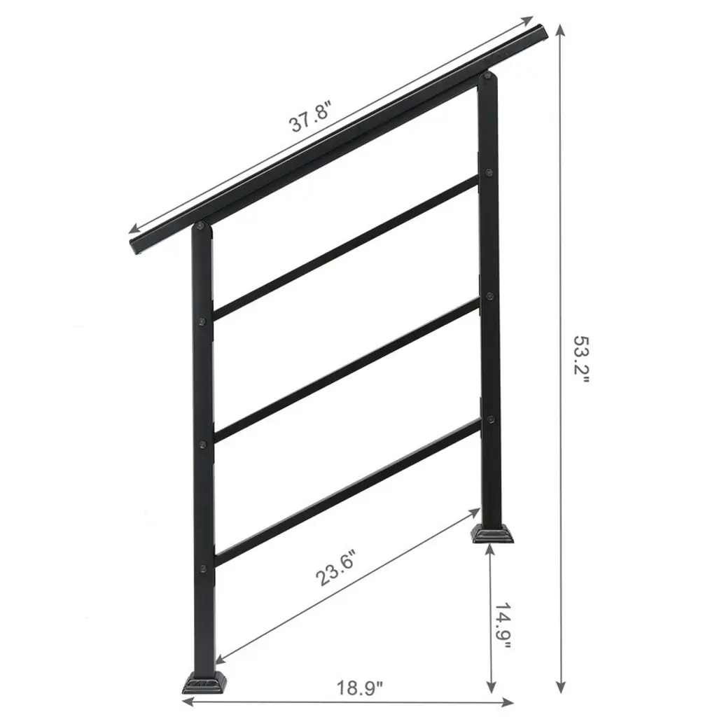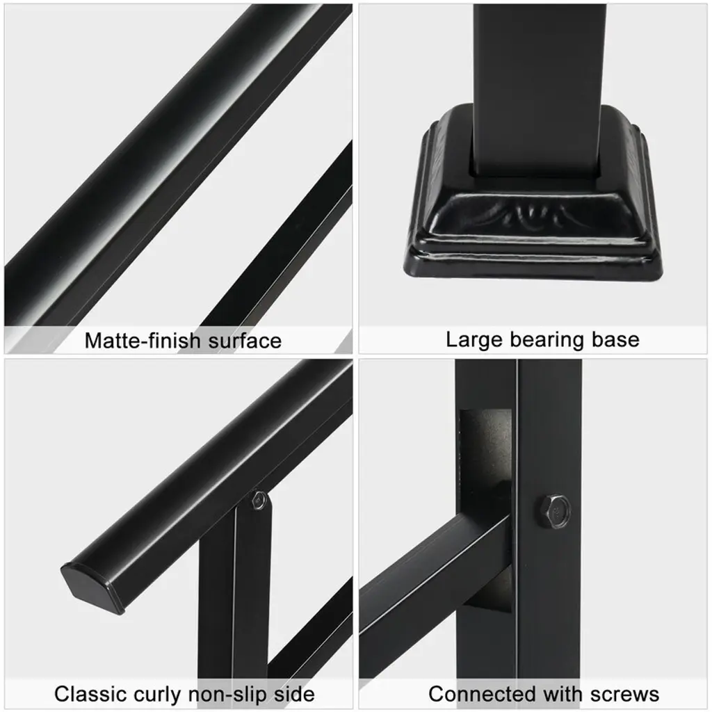 About This ProductElevate the safety and style of your outdoor steps with our robust handrails for outdoor steps. This wrought iron handrail is a versatile solution designed to fit either one or three steps with ease, providing sturdy support for children, the elderly, and pregnant women. Its black powder-coated finish not only adds a sleek, minimalist touch to various exteriors but also ensures durability against the elements, resisting rain and rust. Perfect for residential homes, gardens, office buildings, hotels, or any establishment with stairs, this handrail is a blend of functionality, strength, and aesthetics.Features