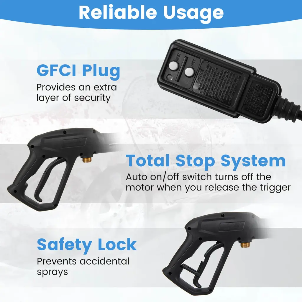 Elevate your cleaning standards with this electric pressure washer boasting 2300 PSI pressure and 1.8 GPM water flow. Equipped with wheels for easy mobility, this pressure washer can be maneuvered effortlessly around your home, garage, or garden. The 21 ft high-pressure hose and 35 ft power cord offer extensive reach in different areas. It includes 5 quick-connect nozzles that adjust the pressure to suit various surfaces, from car to rugged concrete driveways. Besides, the soap bottle allows you to apply detergents for an enhanced cleaning impact. Tailored for safety, the cleaner features total stop system and safety lock, instantly shutting off the unit. Moreover, the power plug with GFCI protection prevents electrical hazards. All these features are intelligently combined to boost your cleaning efficiency. FeatureGenerates up to 2300 PSI pressure and 1.8 GPM water flow for stubborn stains Complete accessories include 5 quick connect nozzles and a soap bottle For hard surfaces, wooden surfaces, glass surfaces, low-pressure detergent application Safety lock prevents accidental spray engagement Power plug with GFCI protection is designed for short circuit protection Electric pressure washer only runs when the power switch in the on position Quick connect interface avoids water leakage Overheat protection and overload protection and TSS for higher safety IPX5 waterproof pressure washer presents safe operation 21 ft high-pressure hose and 35 ft power cord for large cleaning area Keep up with your actions and reach every part of your car Different water intake ways include faucet, pool self-priming and bucket self-priming Compact size and flexible wheels make it easy to store & moveSpecificationColor: Blue & Black Material: PP, Metal Overall Dimensions: 20" x 18" x 35.5" (L x W x H) Diameter of Wheels: 10" Length of High Pressure Hose: 21 ft Length of Power Cord: 35 ft Max. Pressure: 2300 PSI Max. Flow: 1.8 GPM Max. Water Inlet Temperature: 122℉ Voltage: 120V Frequency: 60 Hz Current: 14A Net Weight: 38.5 lbs Package Includes: 1 x High Pressure Washer 5 x Nozzles 1 x Detergent Bottle 1 x Gun 1 x Extension Wand 1 x High Pressure Hose 1 x Cleaning Pin 1 x User Guide