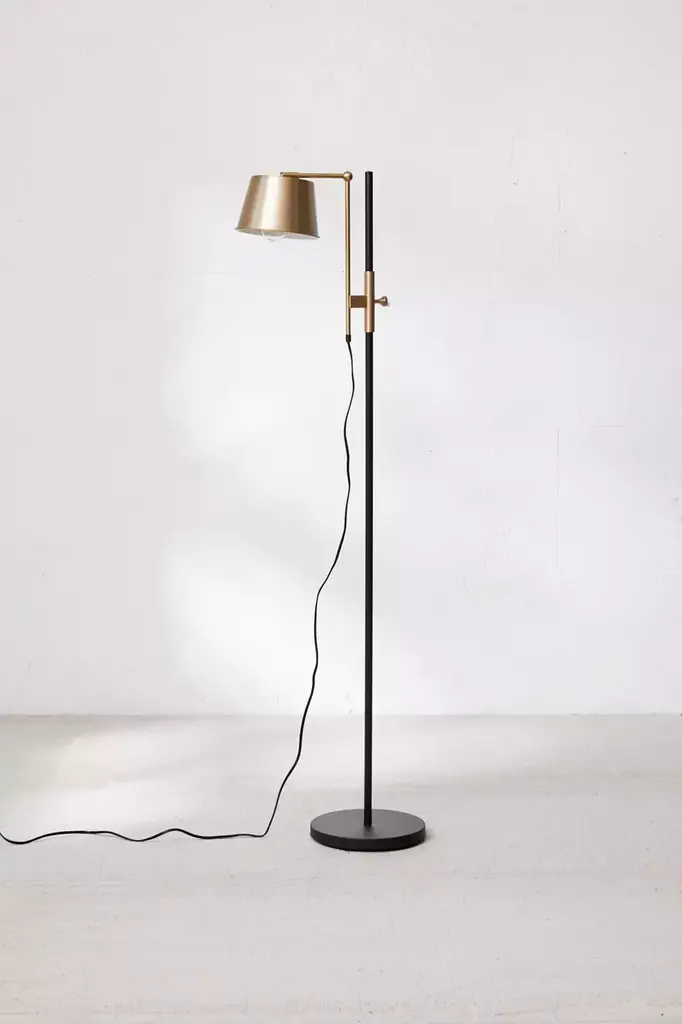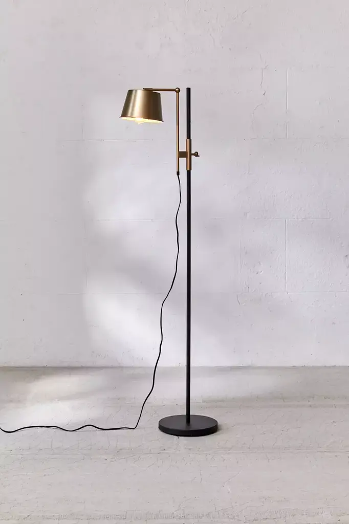 Industrial-inspired metal floor lamp with an adjustable height for versatile function. Duo-tone lamp features a metal shade + bracket that slips over a slim bar to adjust. Finished with a round, flat base. **Features** \- Irwin Industrial Floor Lamp \- Free-standing lamp with adjustable height \- Plug in; in-line switch \- Requires one 60W bulb - not included \- Compact fluorescent compatible **Content + Care** \- Marble, brass, metal \- Wipe clean \- Imported \- Made in compliance with US electrical standards. To use this item outside of the US, pair with an outlet adapter and voltage converter made specifically for use in your location. **Size** \- Dimensions: 19"l x 11"w x 63"-72"h \- Shade dimensions: 8"dia x 5"h \- Base dimensions: 11"dia \- Wattage: 60W \- Cord length: 72" \- Weight: 11 lbs \- Shipping package dimensions: 20"l x 14"w x 9"h \- Shipping package weight: 9 lbs