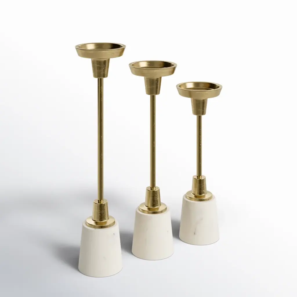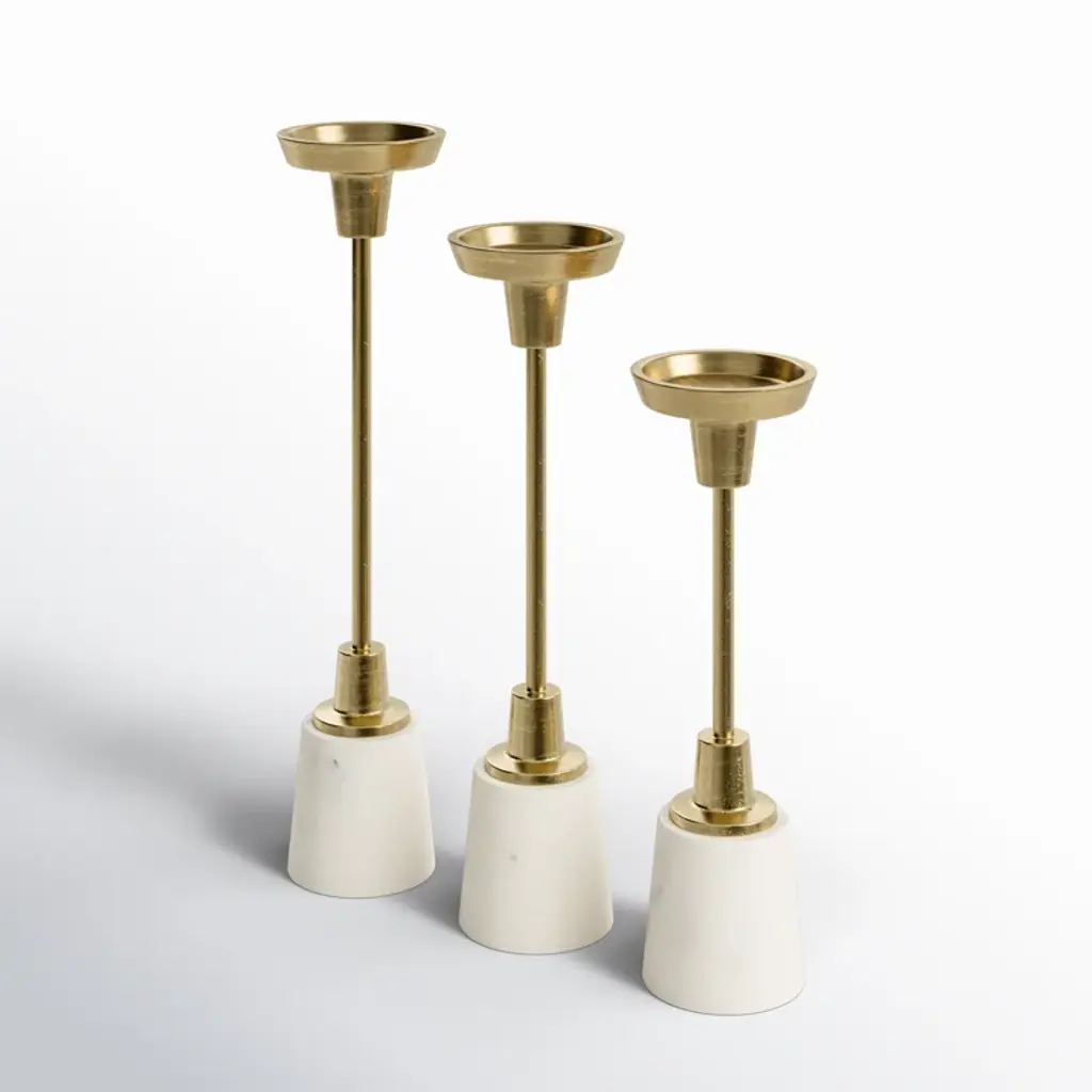 Add a touch of elegance to your tabletop with this set of three candle holders. Crafted from a blend of aluminum and marble, these candle holders showcase a contemporary design that complements any decor. Each piece in the set is designed to hold one candle, creating a warm and inviting atmosphere for your dinner parties or quiet evenings at home. With their sleek and sophisticated look, these candle holders are sure to impress your guests without stealing the spotlight.