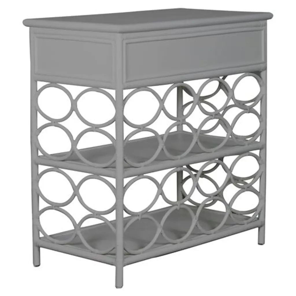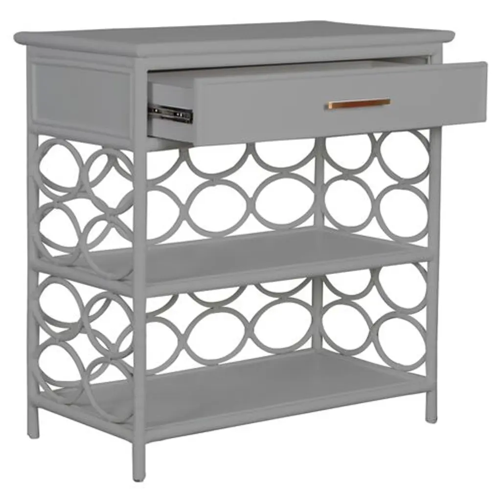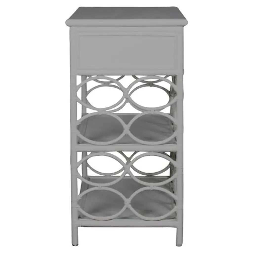 Showcasing hand-arched circular fretwork and a light gray finish, this side table is crafted of rattan with rawhide bindings for added strength and textural contrast. Its two wooden shelves and single drawer offer a wealth of storage space. An anti-tip kit is included to secure this piece to the wall and prevent tipping.
