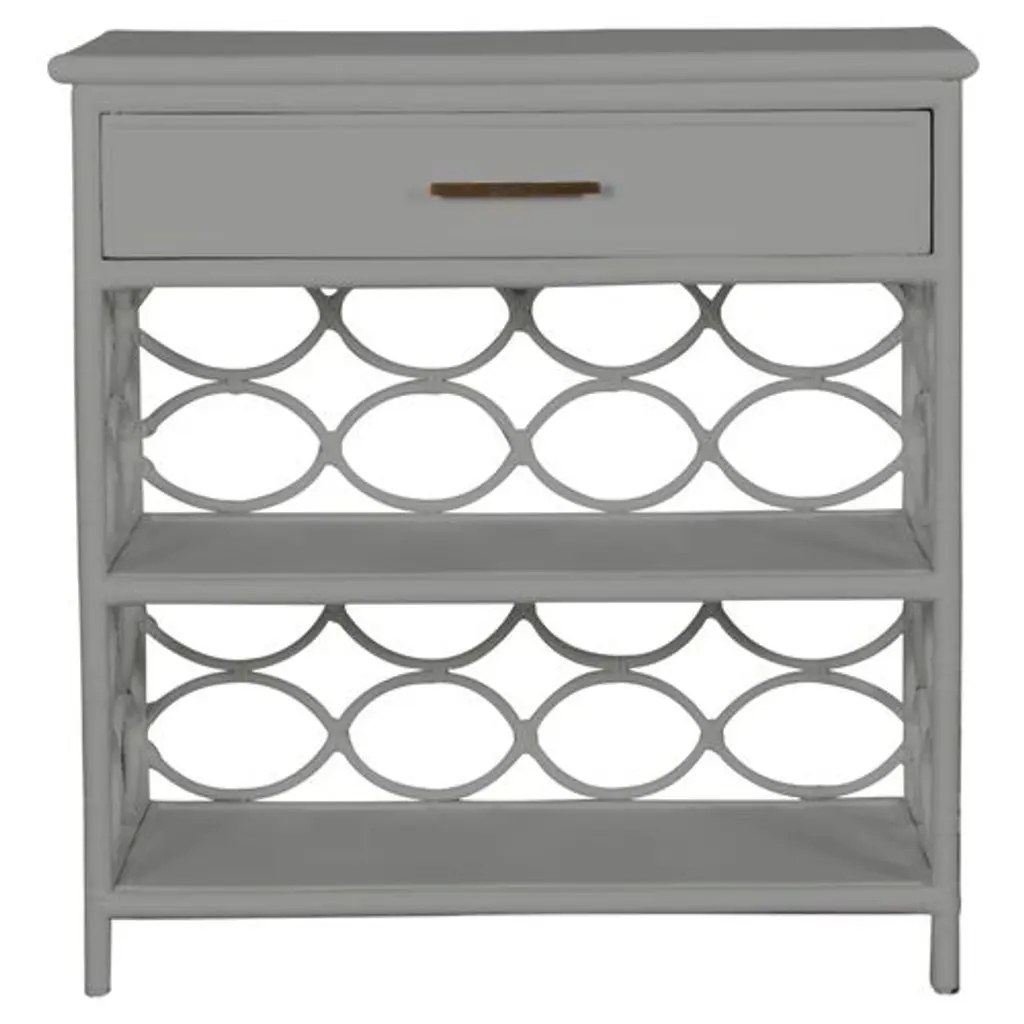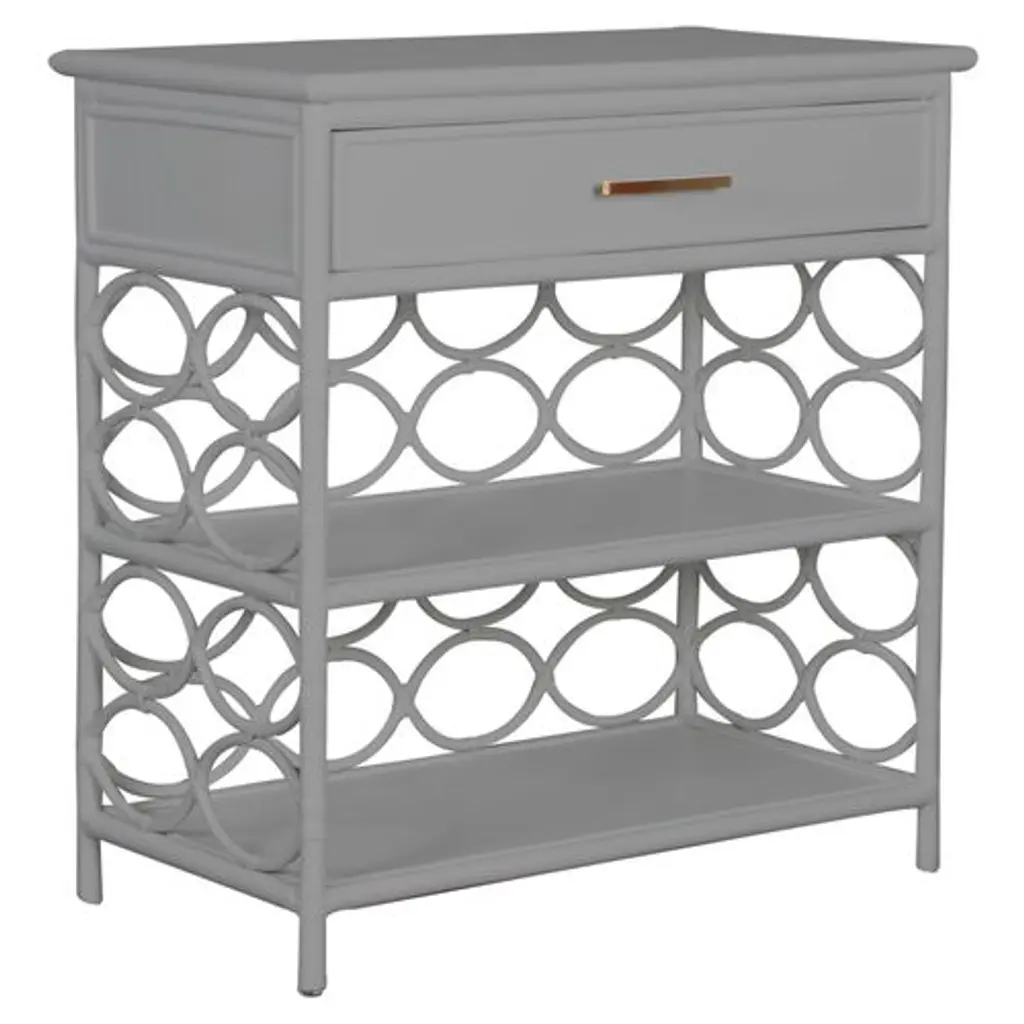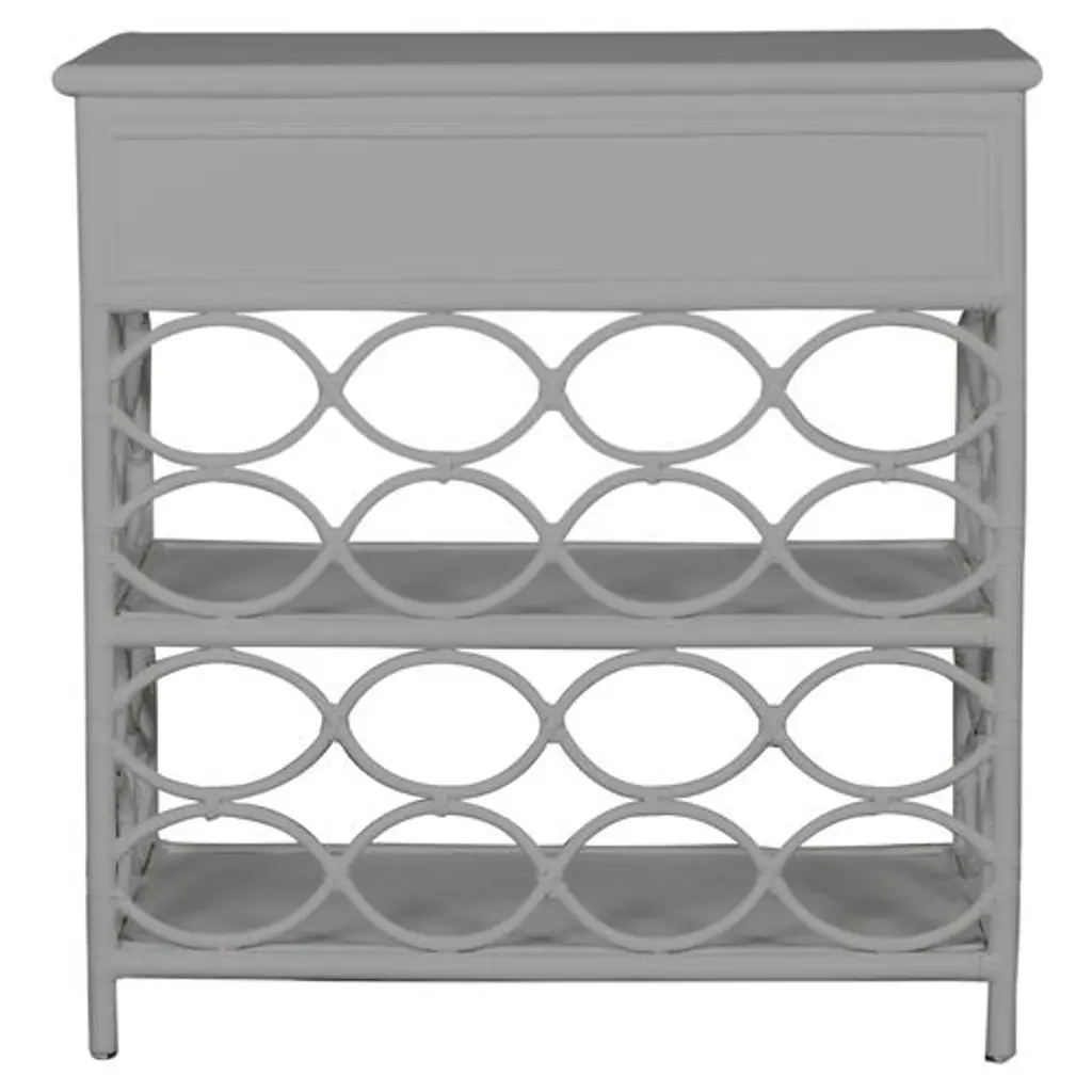 Showcasing hand-arched circular fretwork and a light gray finish, this side table is crafted of rattan with rawhide bindings for added strength and textural contrast. Its two wooden shelves and single drawer offer a wealth of storage space. An anti-tip kit is included to secure this piece to the wall and prevent tipping.