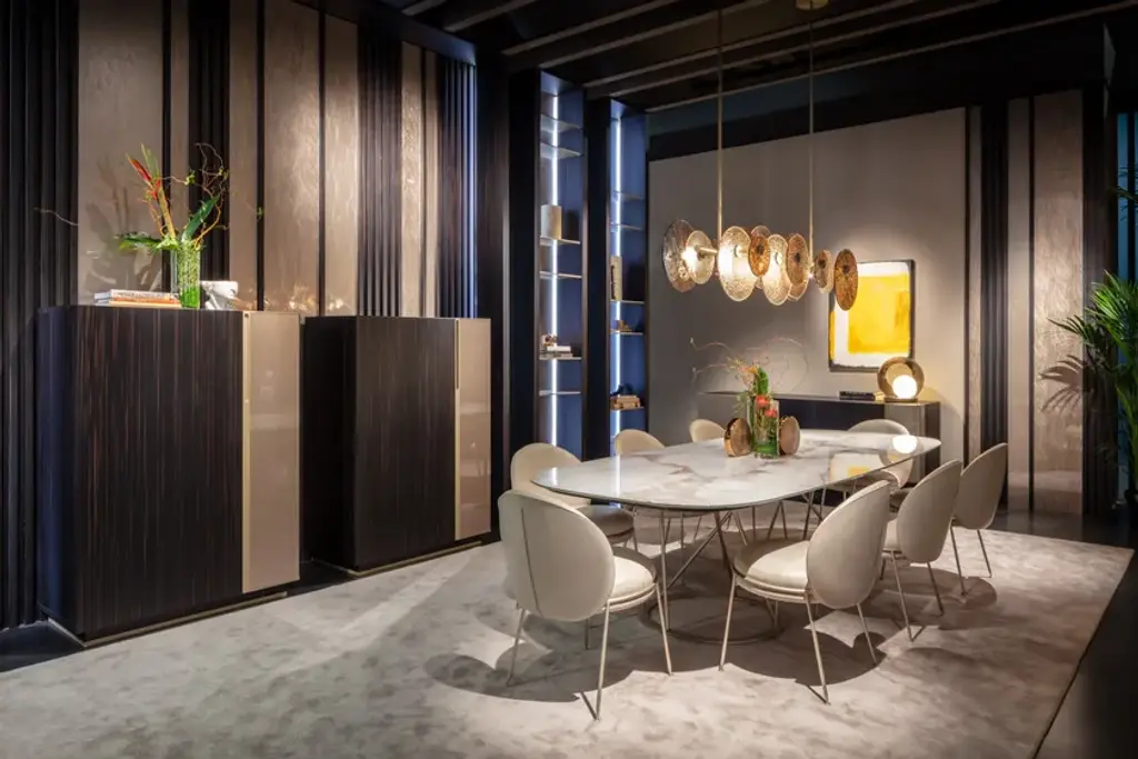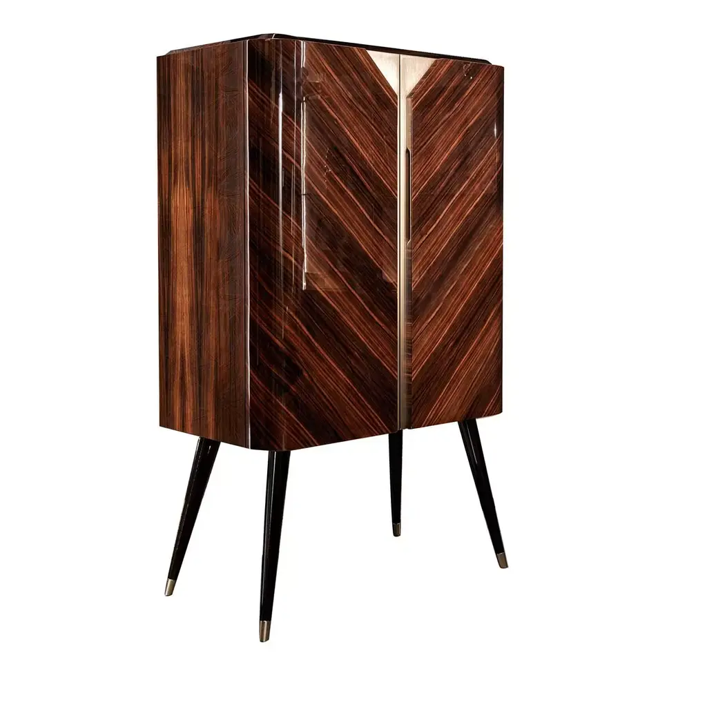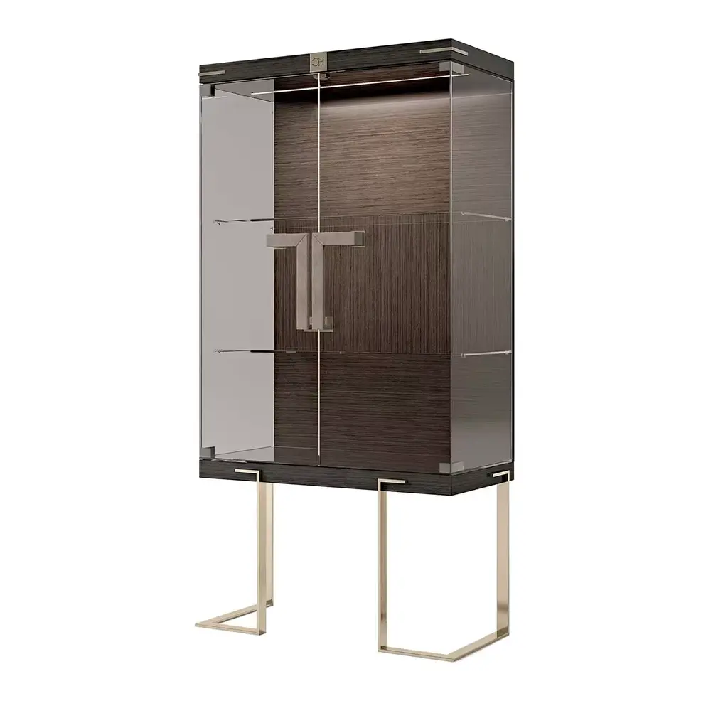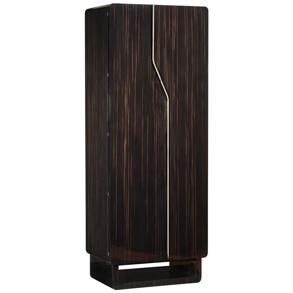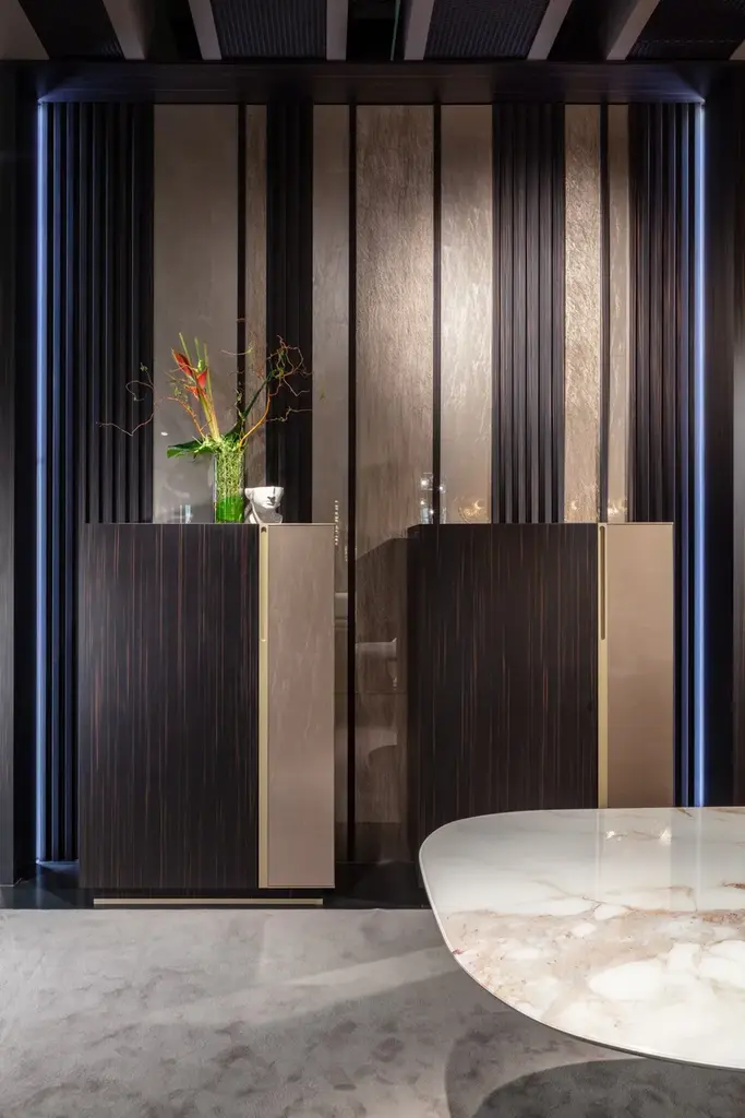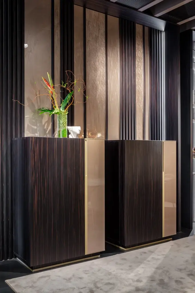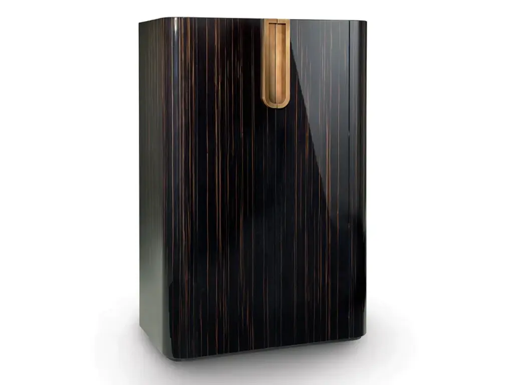 Island is a kitchen chest with an almost architectural structure that takes shape thanks to the juxtaposition of the geometric bands of the doors while the precious materials used create a new idea of classicism. Cabinet in glossy ebony and foam glass exterior. Handles and base with coated lacquered finish. Interior with matte lacquered finish, back with bronzed mirror. Microfiber mats on shelves and LED lighting with opening sensor.